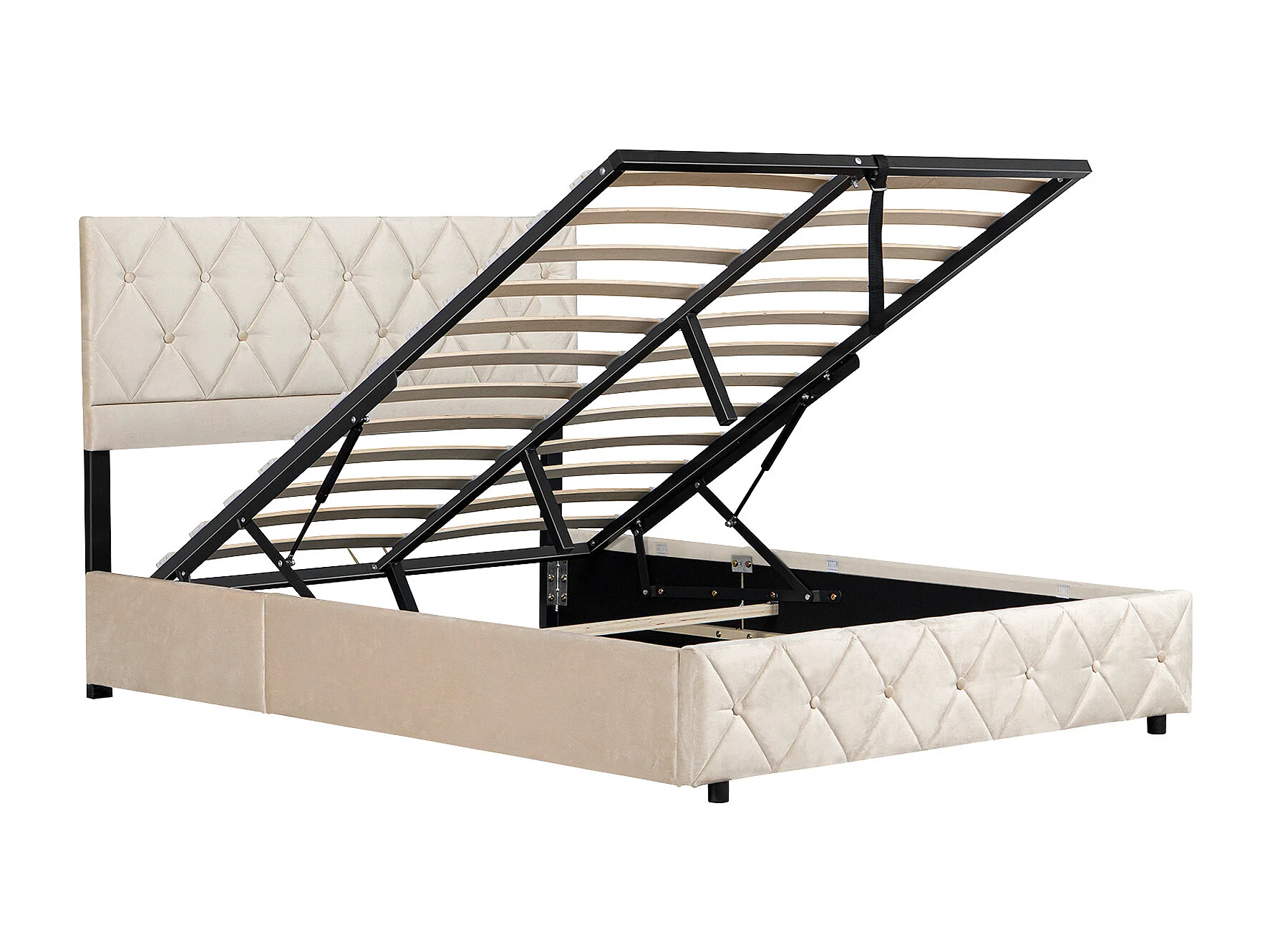 Lit soft 140x200 cm, lit rembourré, cadre en métal et MDF avec sommier à lattes, grand rangement, beige