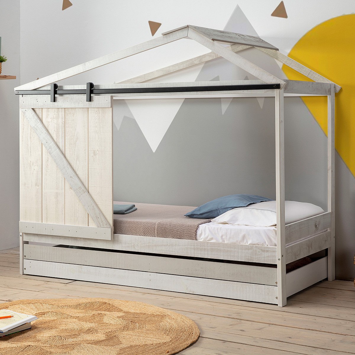 Lit cabane en bois de pin 2x90x200cm - avec toit et sommier à lattes - Gris