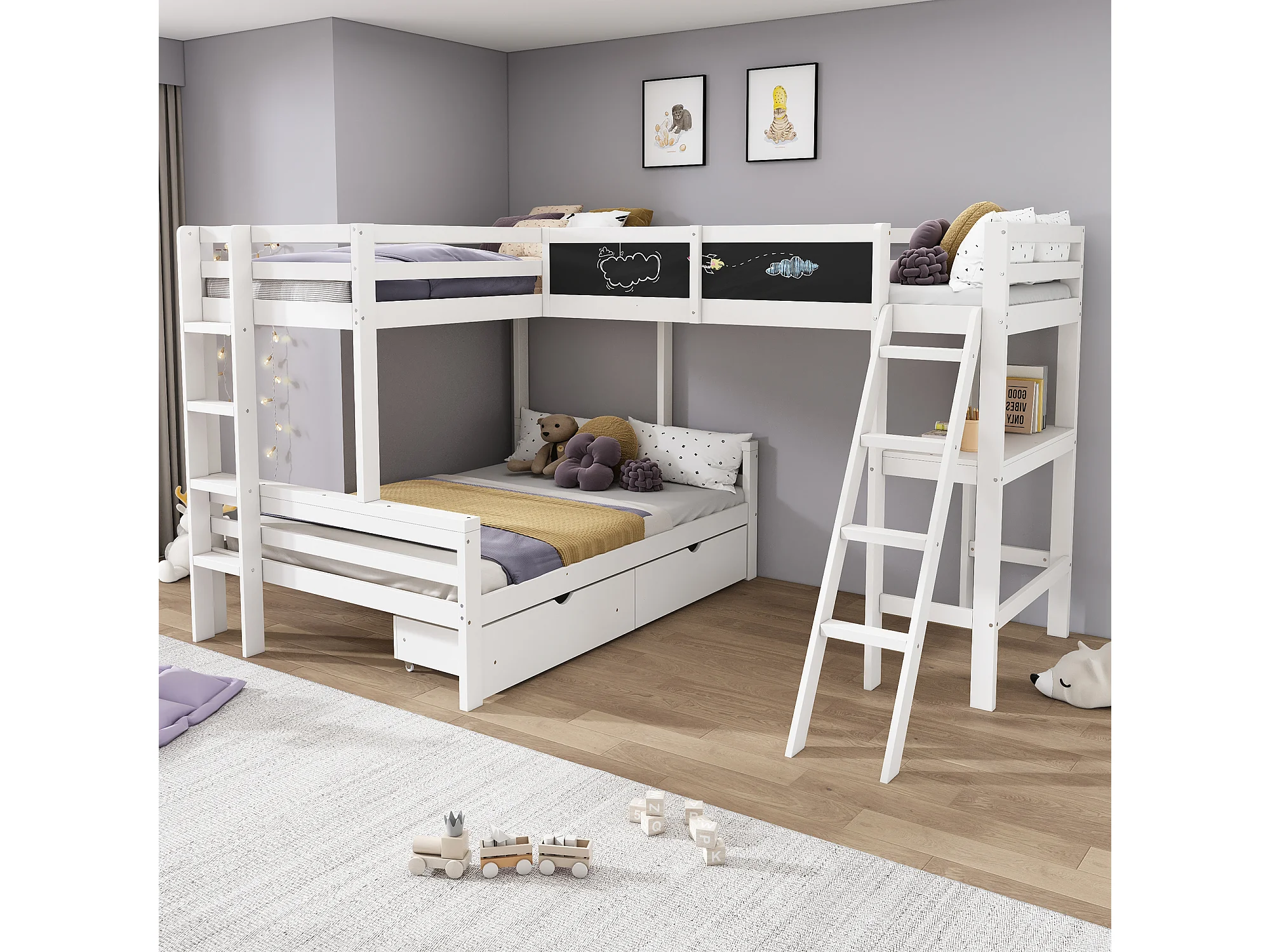 Lit superposé 140/90x200 cm avec 2 tiroirs, bureau, échelle, tableau noir, bois blanc, sans matelas