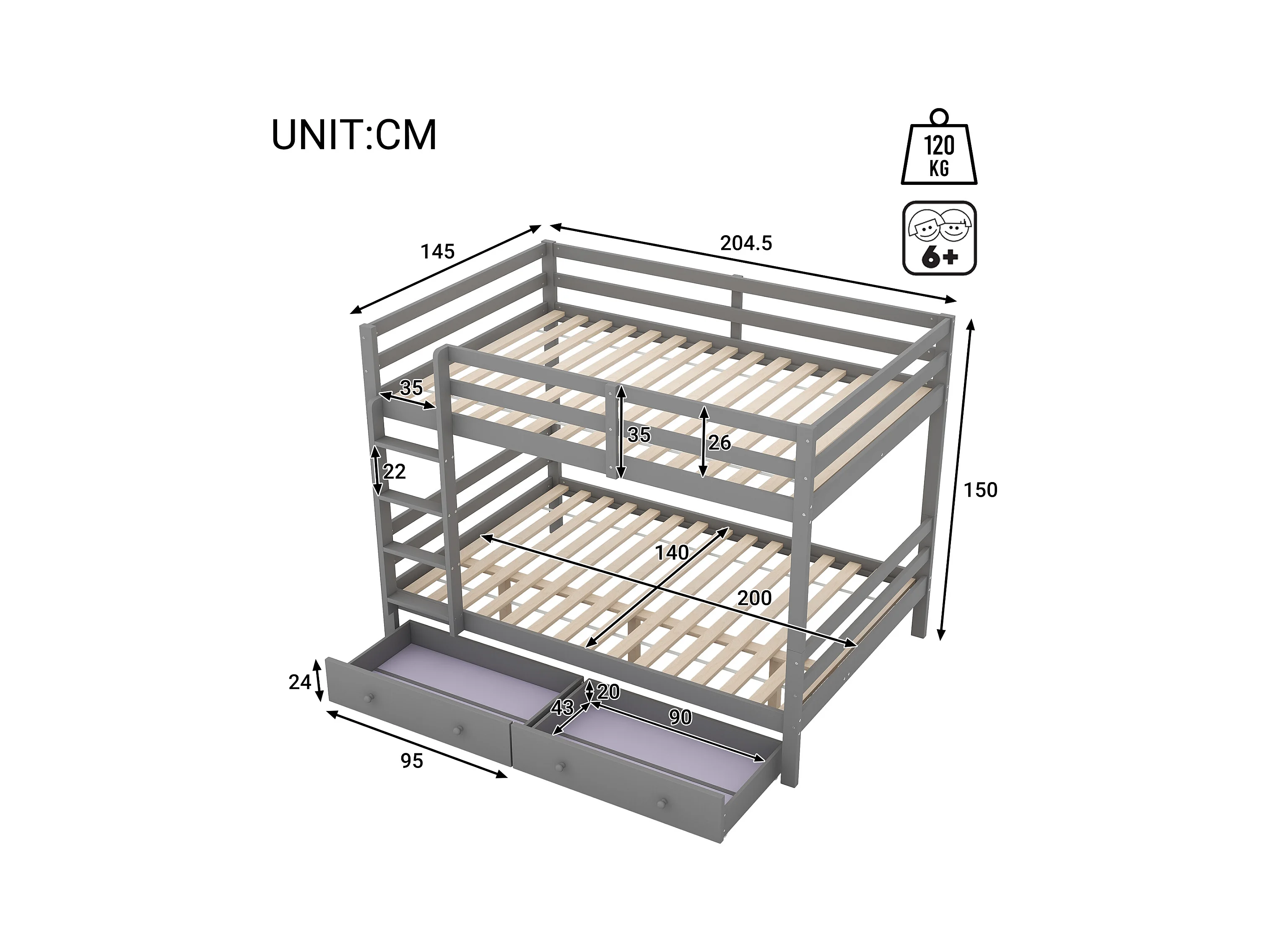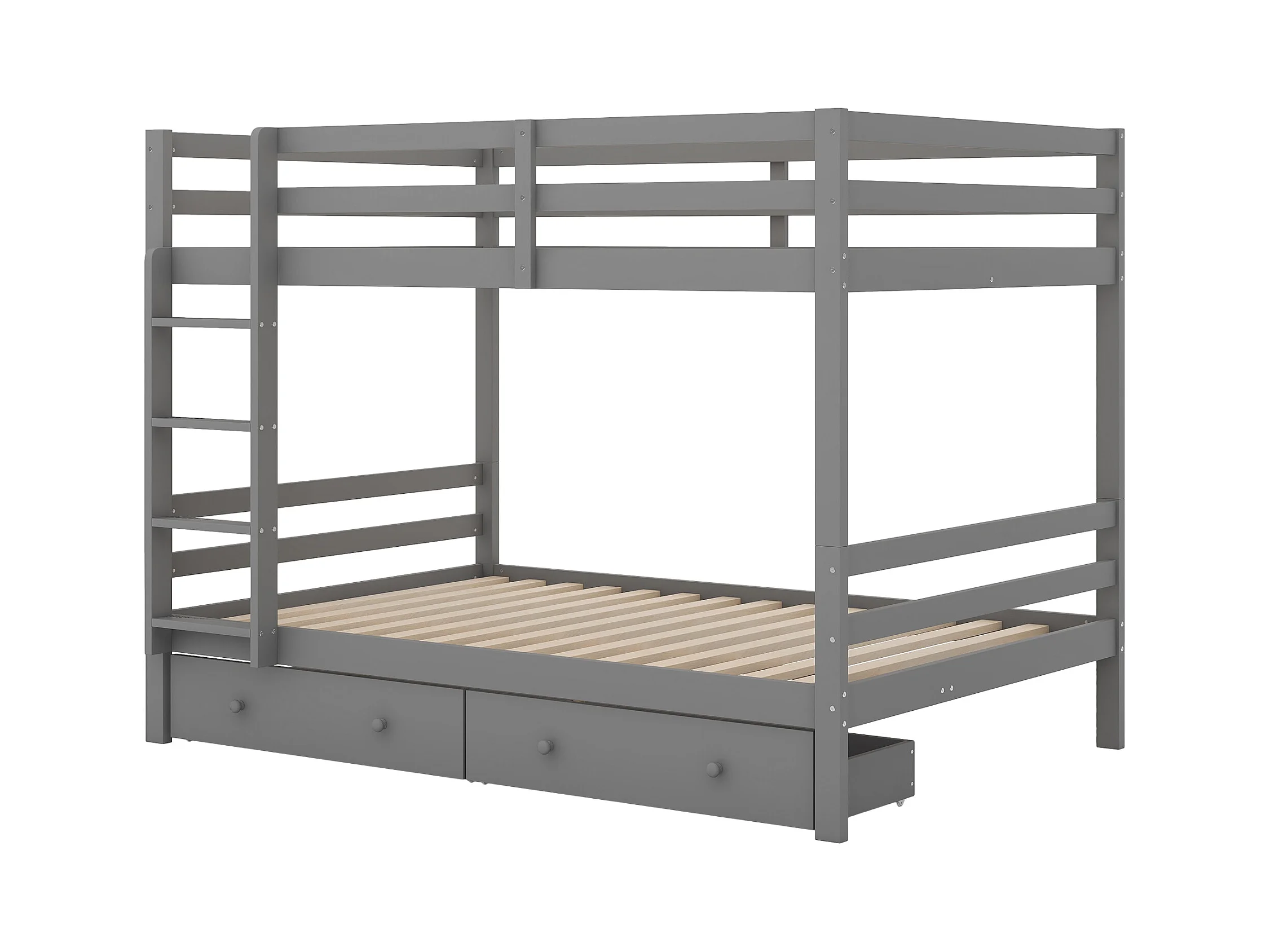 Lit superposé 140x200 cm - Lit enfant avec tiroirs - Balustrade haute - Gris(sans matelas)