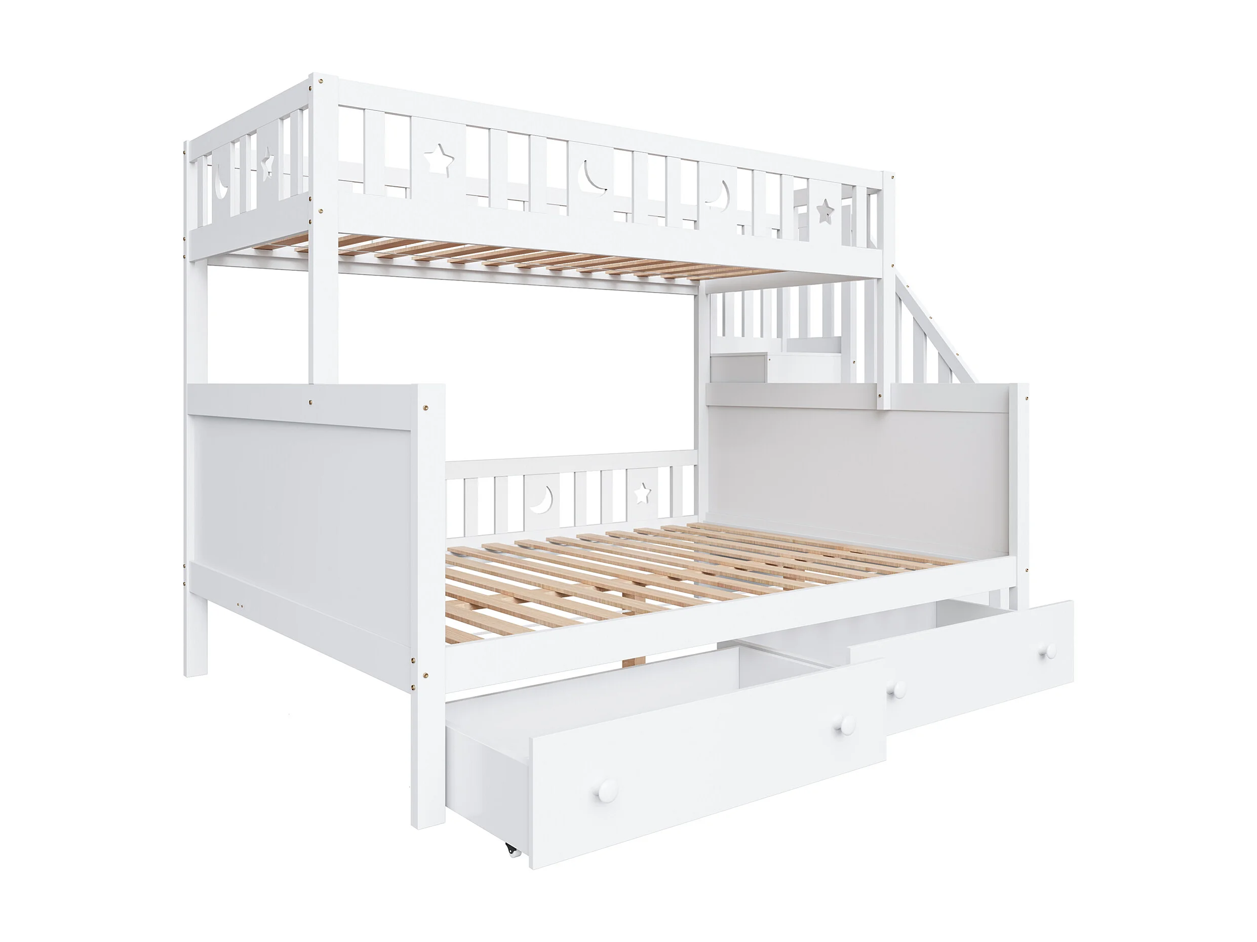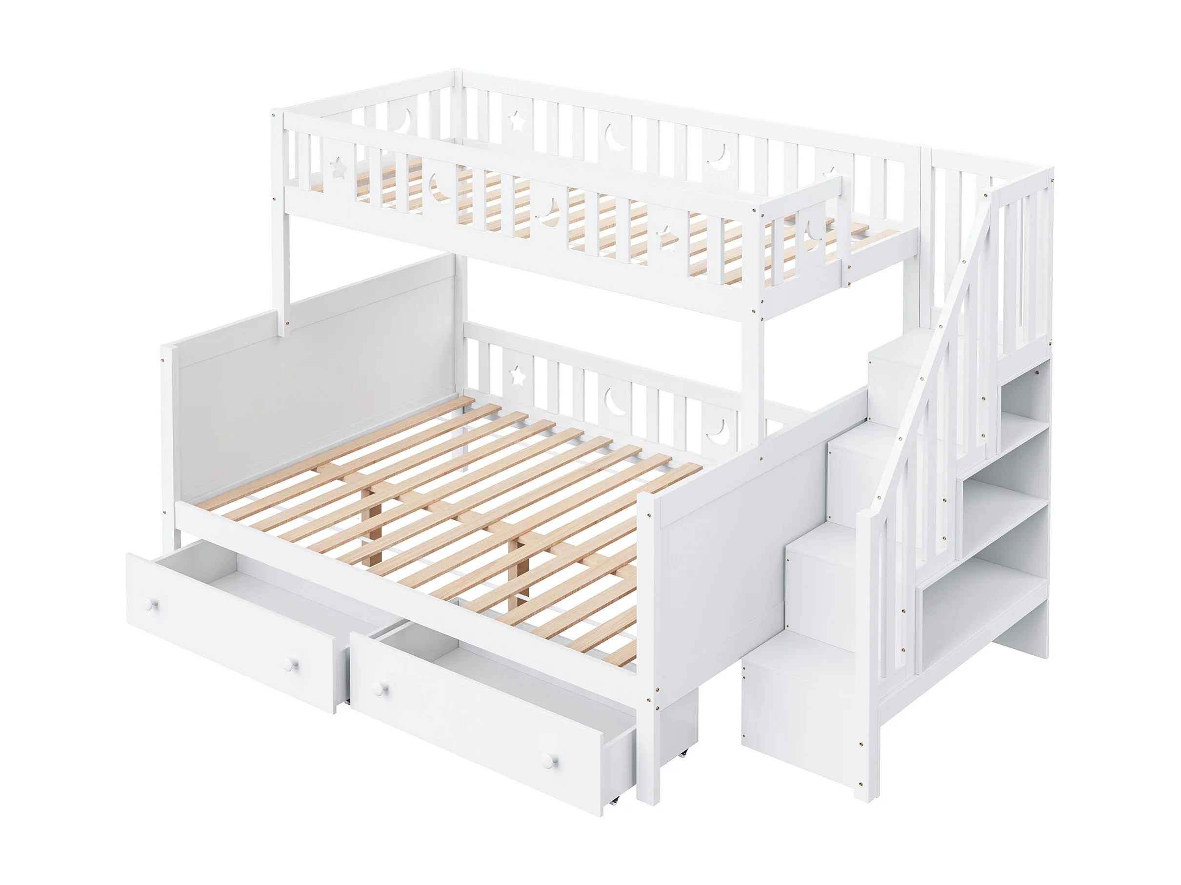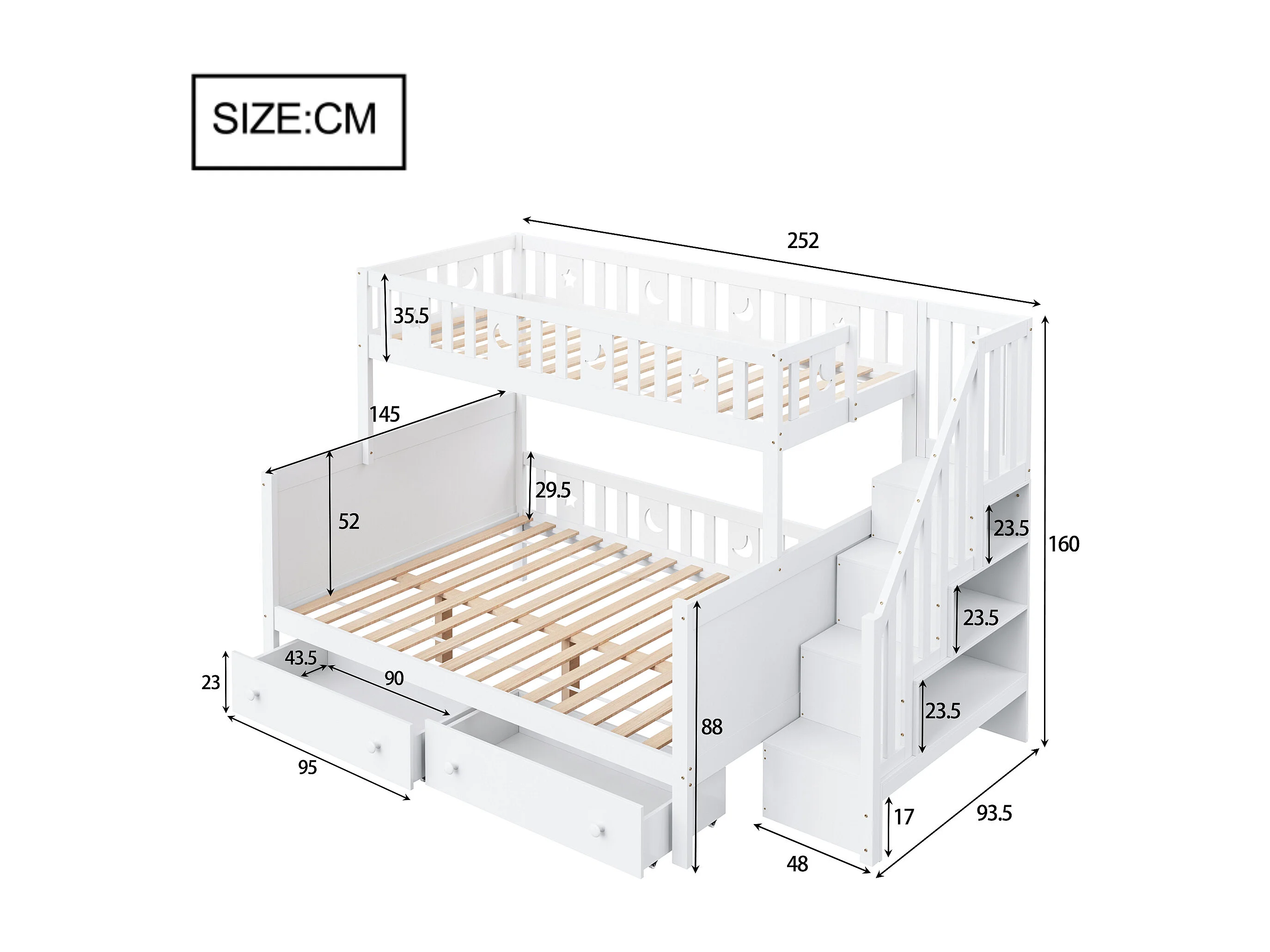 Lit superposé enfant 90x200 cm avec rangement, échelle réversible étagères et 2 tiroirs, bois, blanc (Sans matelas)