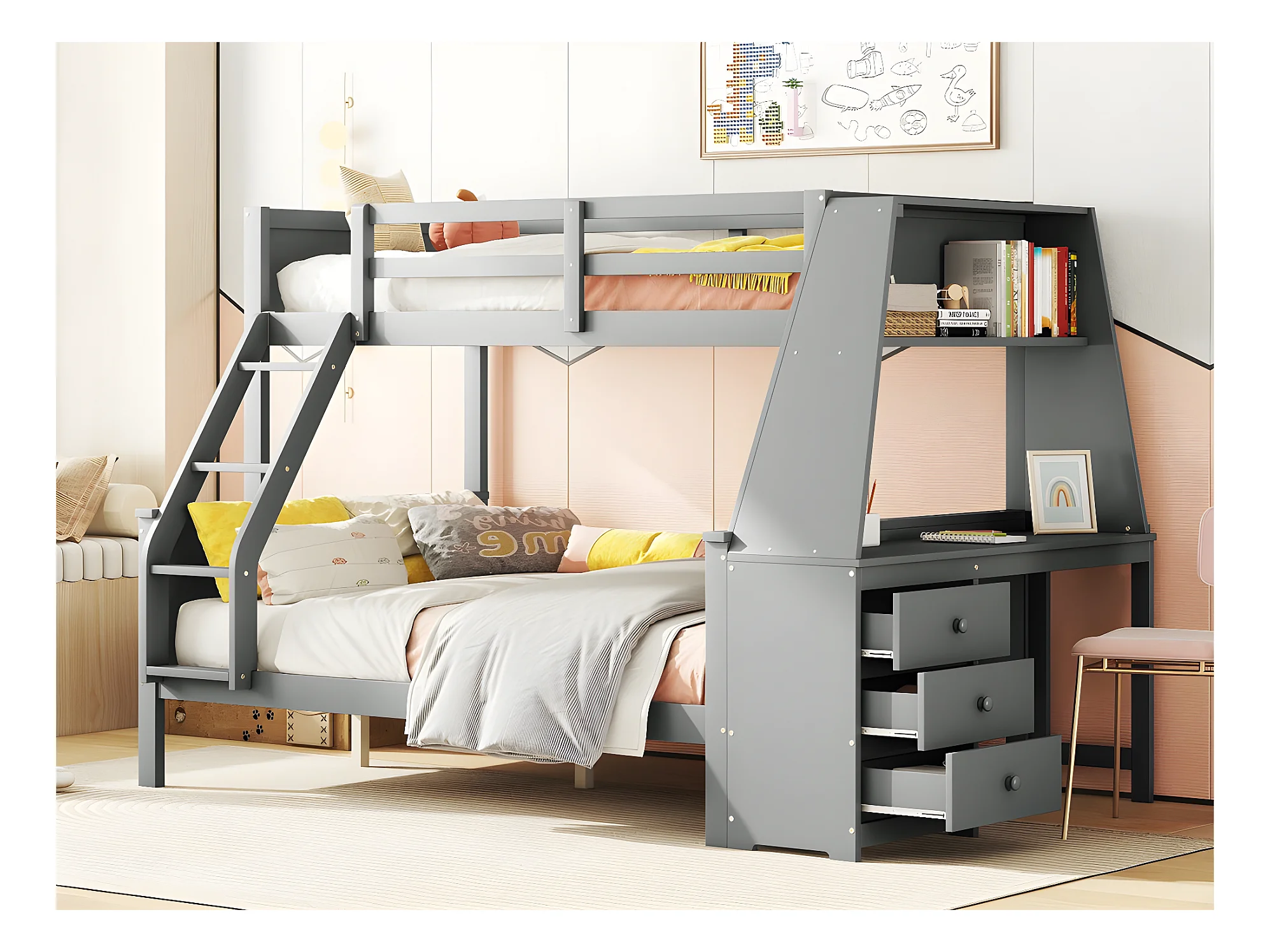 Lit superposé 140x200cm - un bureau sur le côté avec 3 grands tiroirs - Gris