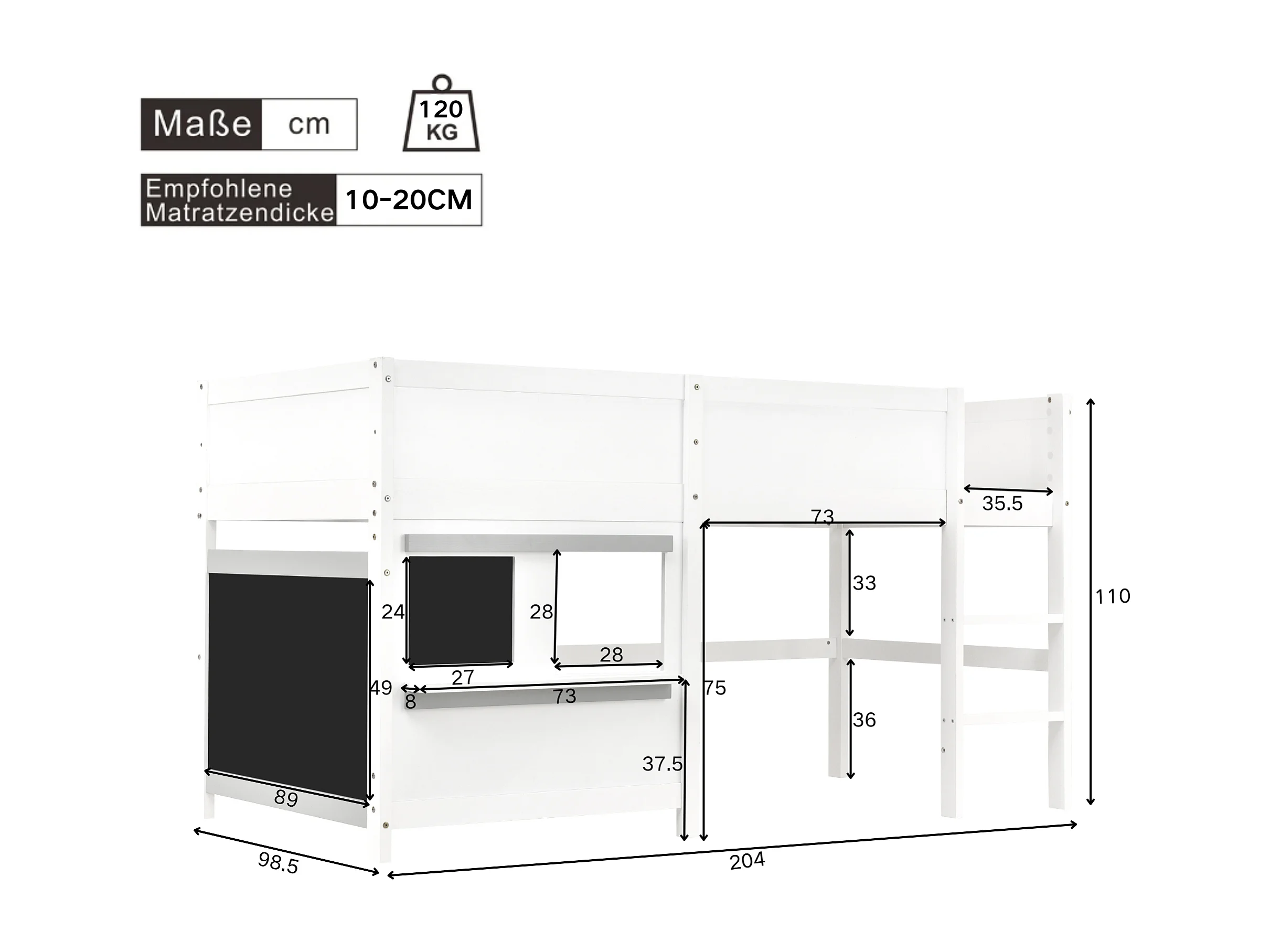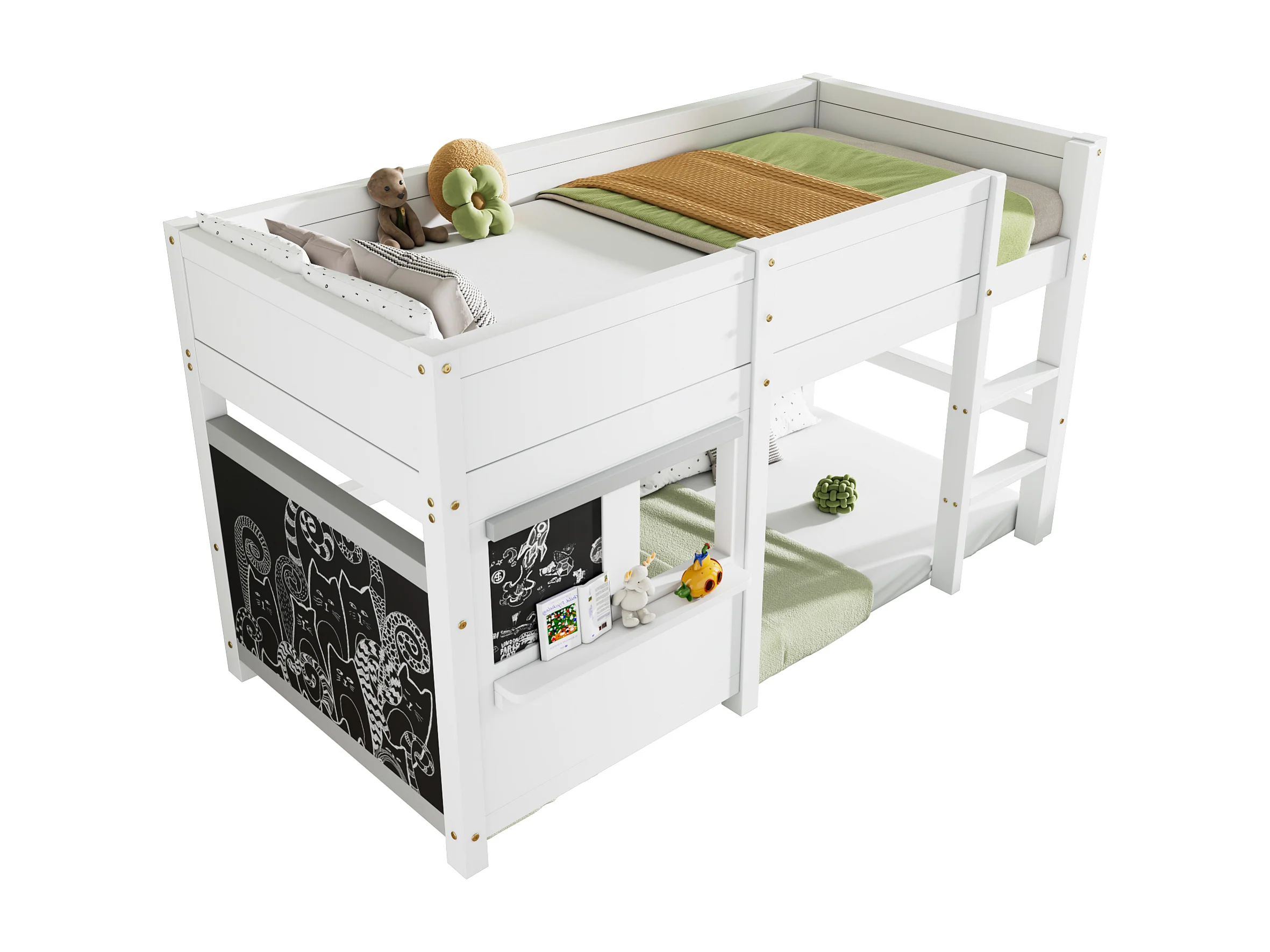 Lit superposé 2 places - 2 x 90 x 200 cm - avec petite étagère + sommier à lattes - bois - blanc