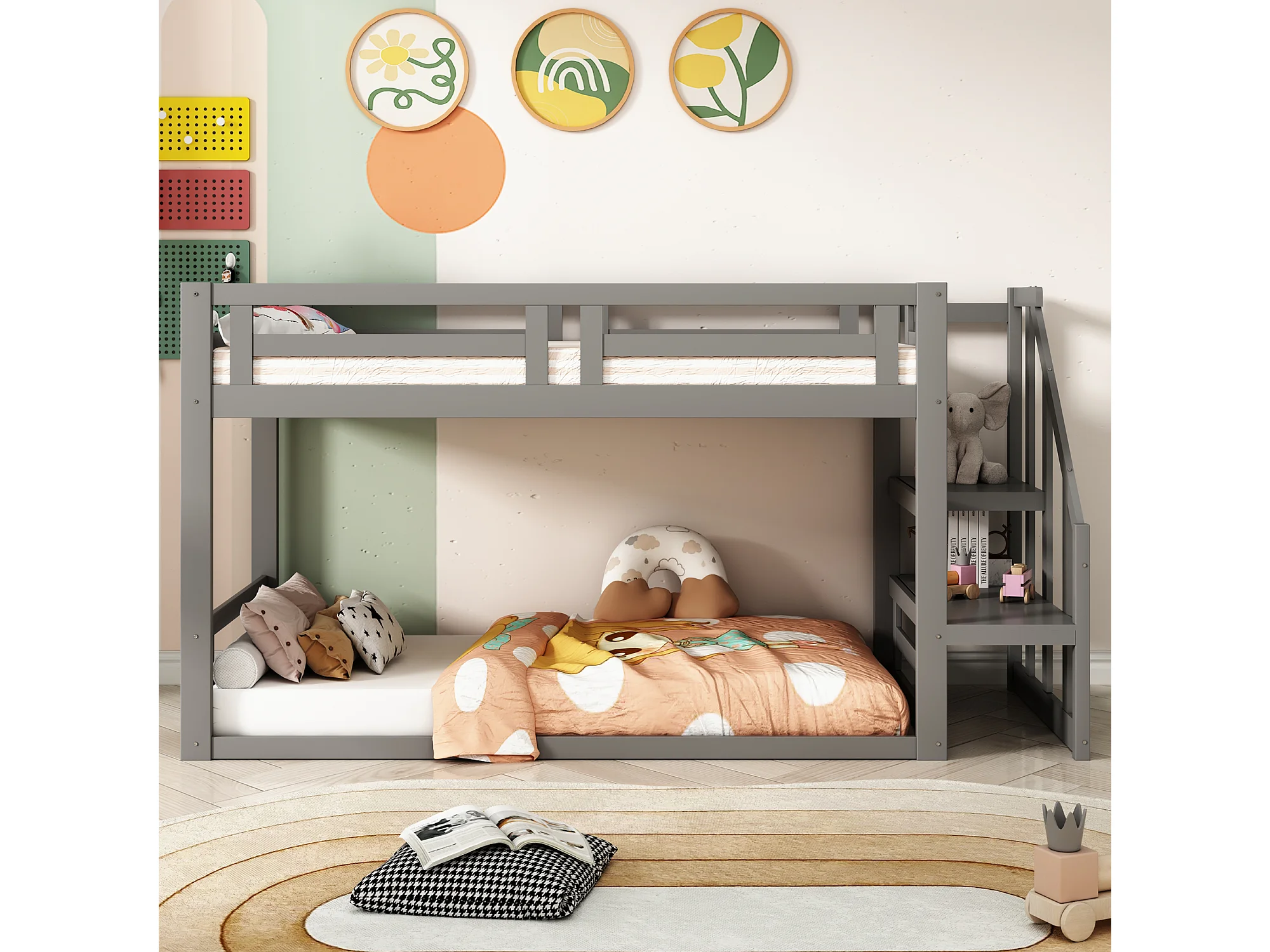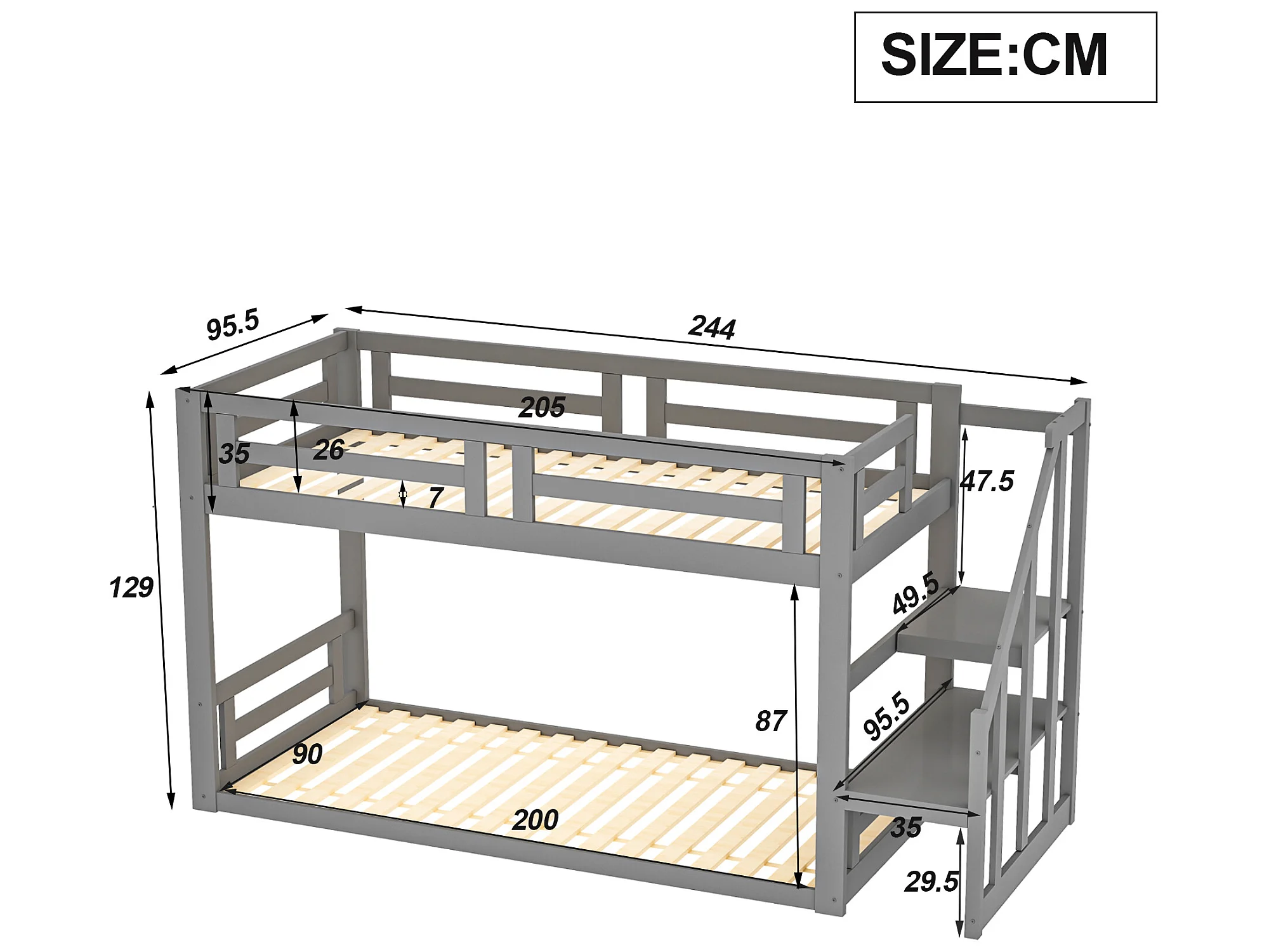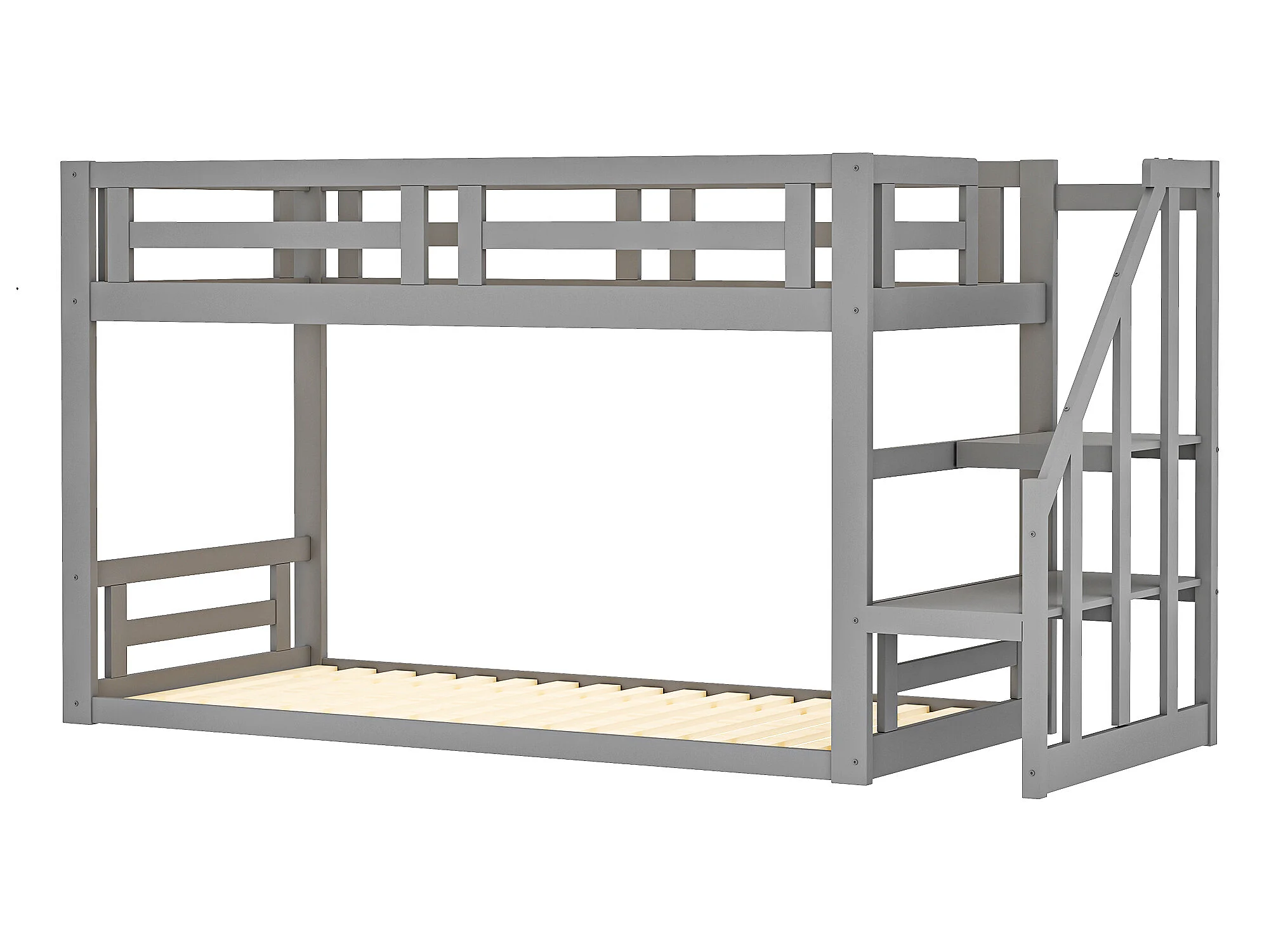 Lit superposé 2 places avec rangement - 2 x 90 x 200 cm - pin - sommier à lattes - gris