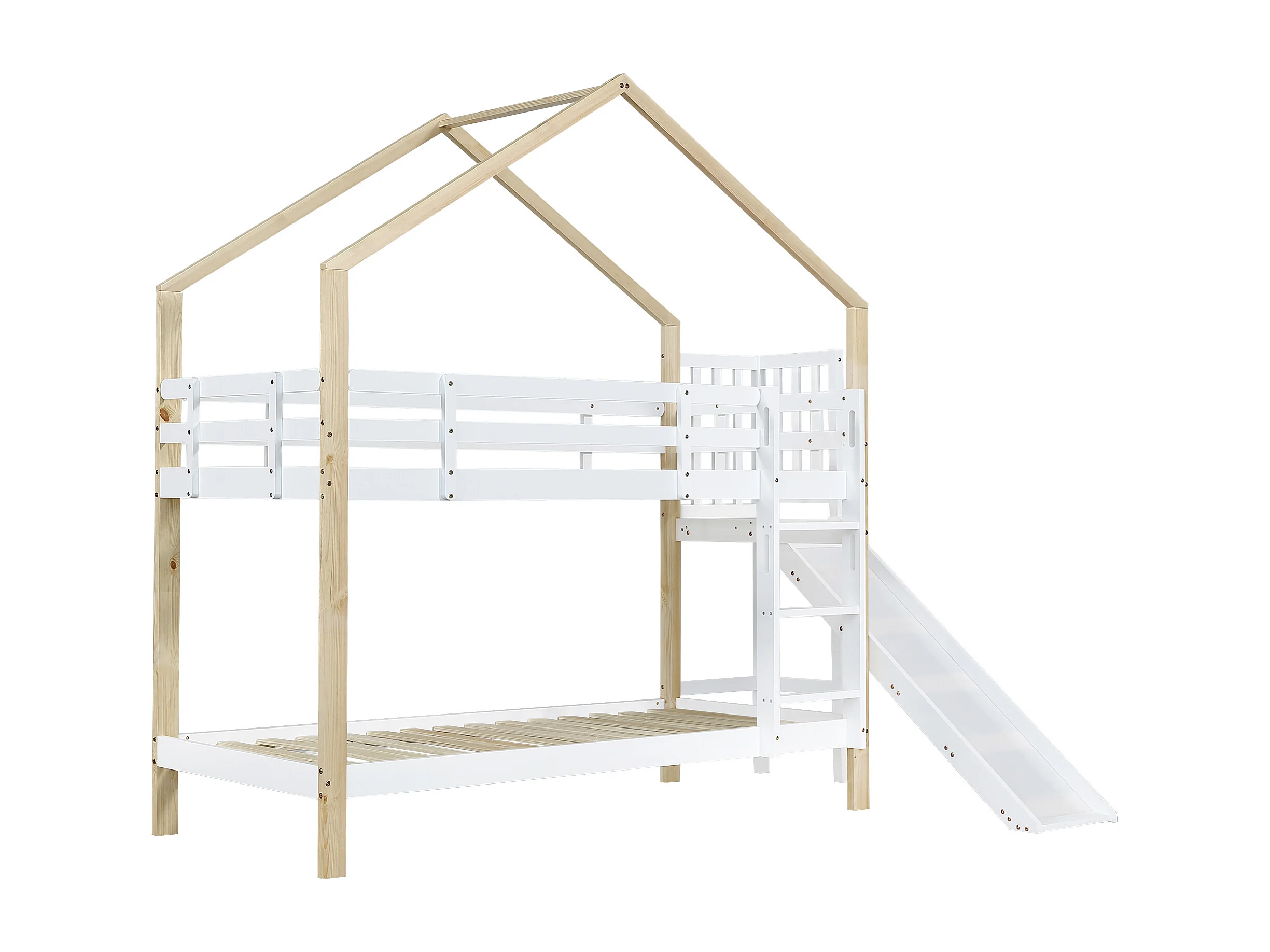 Lit superposé avec toboggan et échelle à 3 marches, lit cabane avec barrière de sécurité, cadre en bois massif, blanc et naturel (90x200cm)