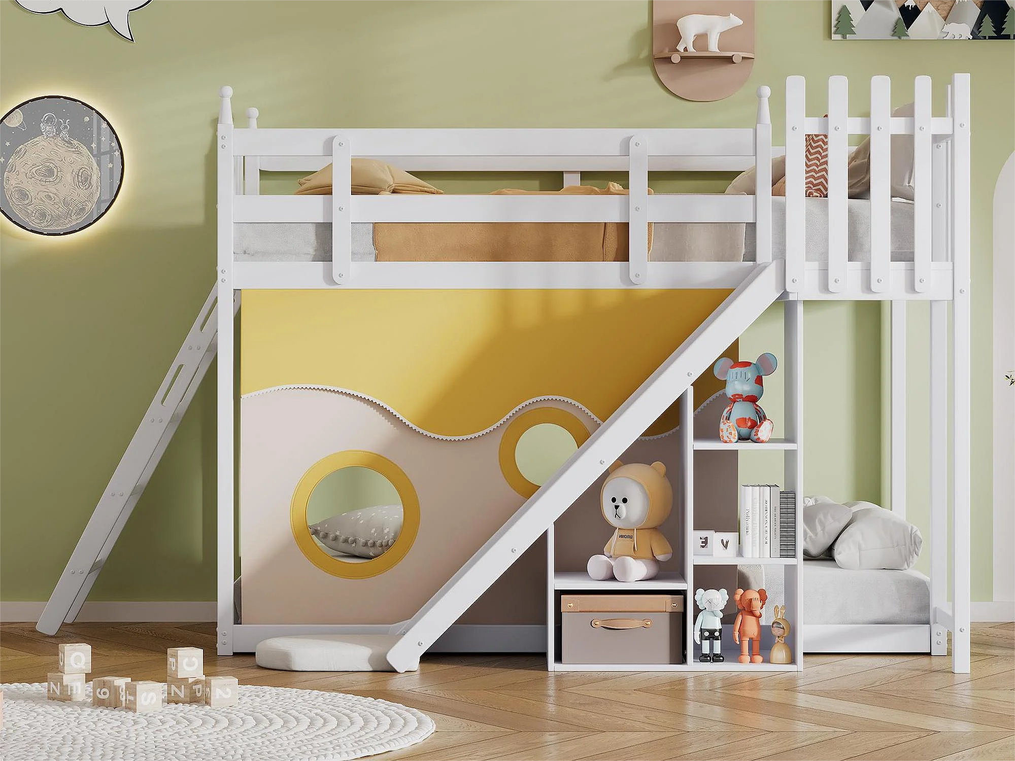 Lit superposé - 2x90x200 cm - cadre en pin - rideau de lit, toboggan et étagère - blanc