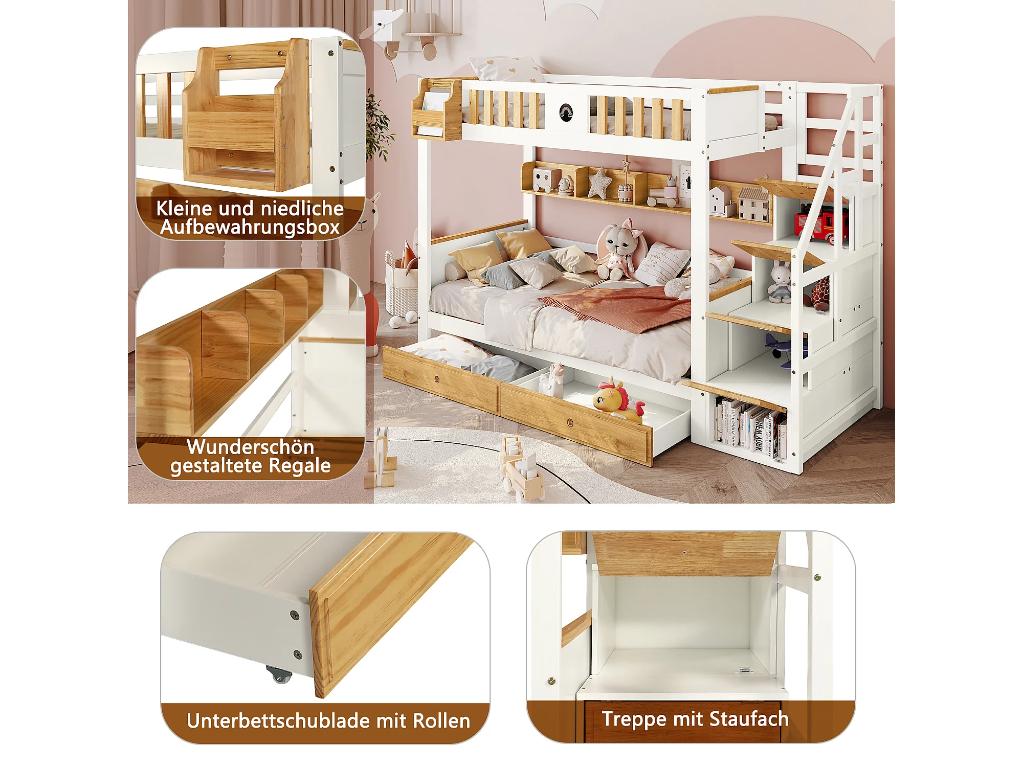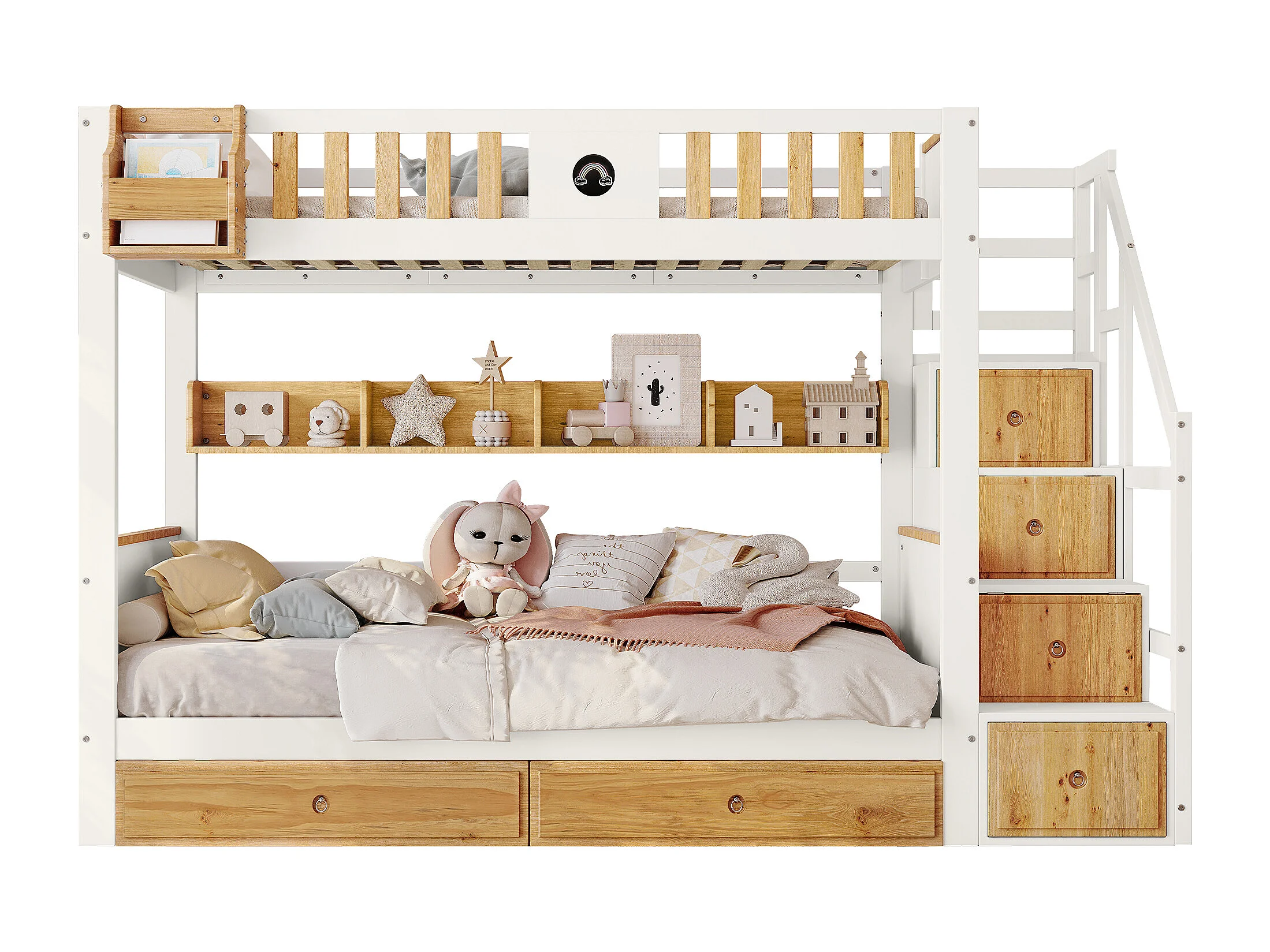 Lit Superpose 90 x 200 cm - Avec Escalier De Rangement 4 Placards, 2 Tiroirs Et Etagere - En Bois Massif Et MDF - Sans Matelas - Blanc+Naturel