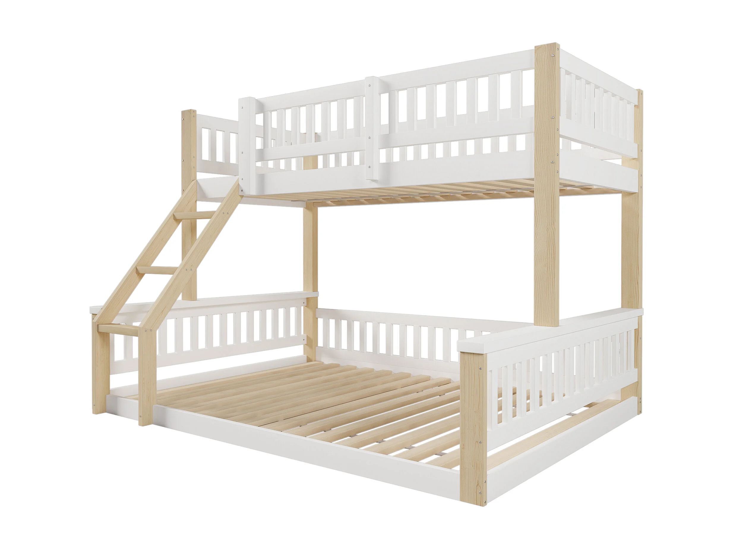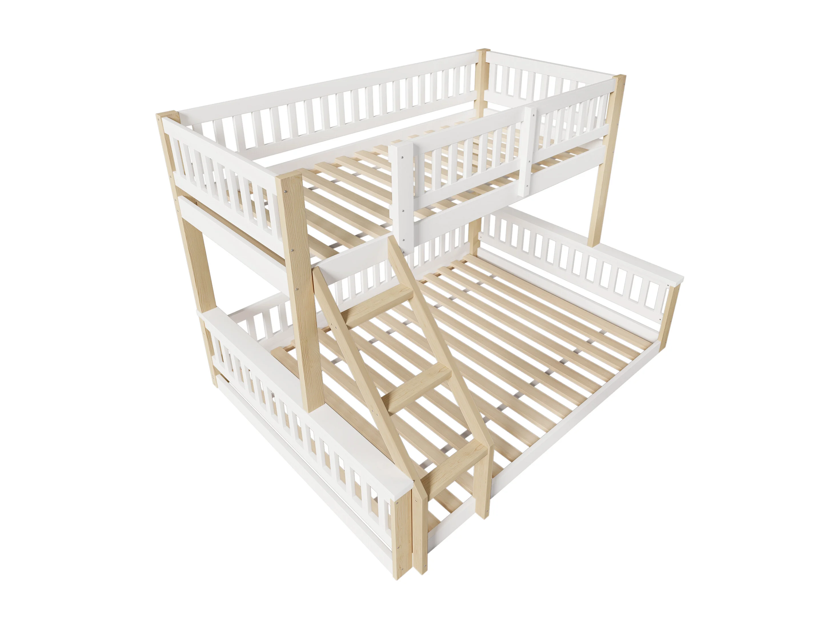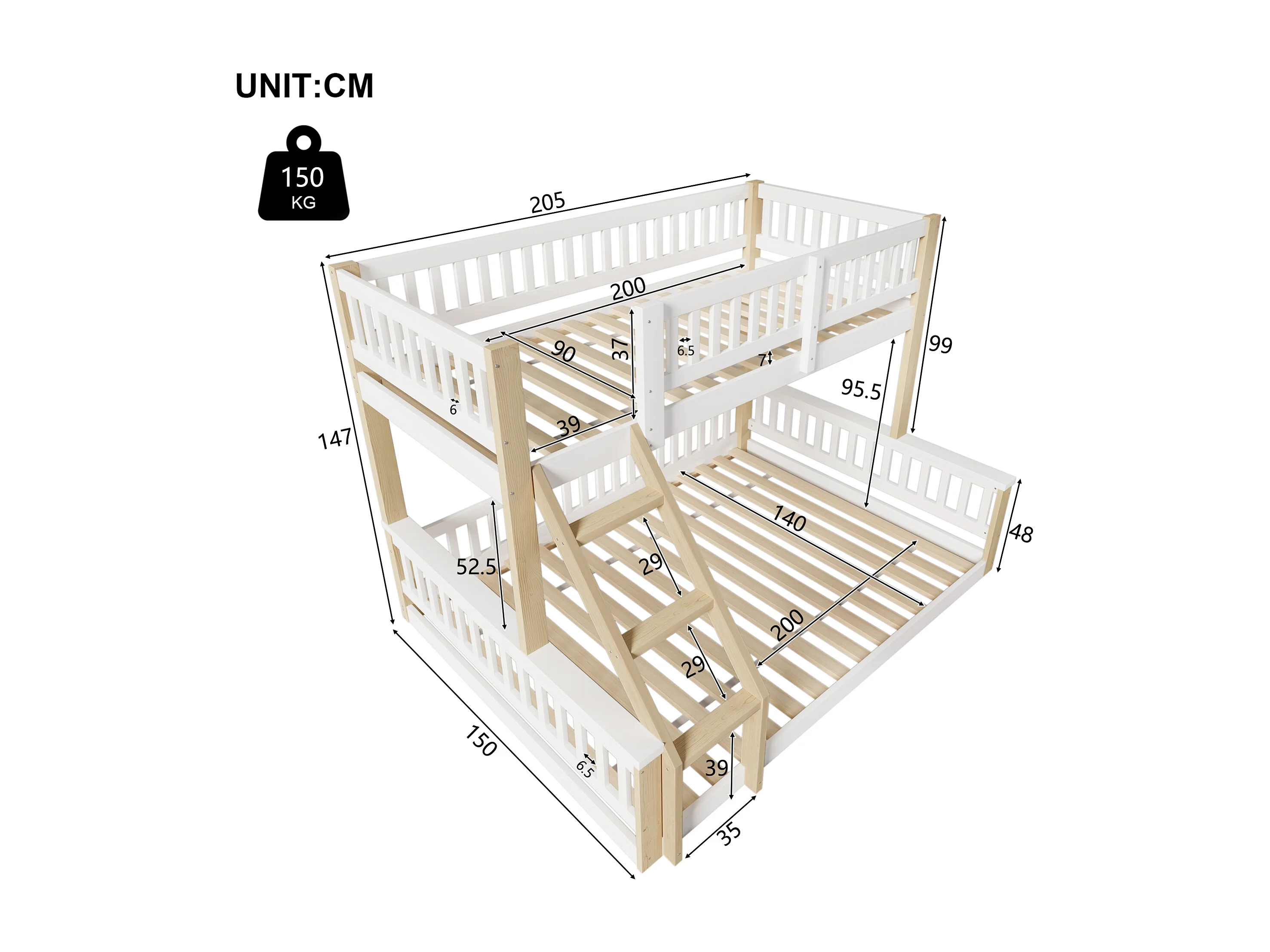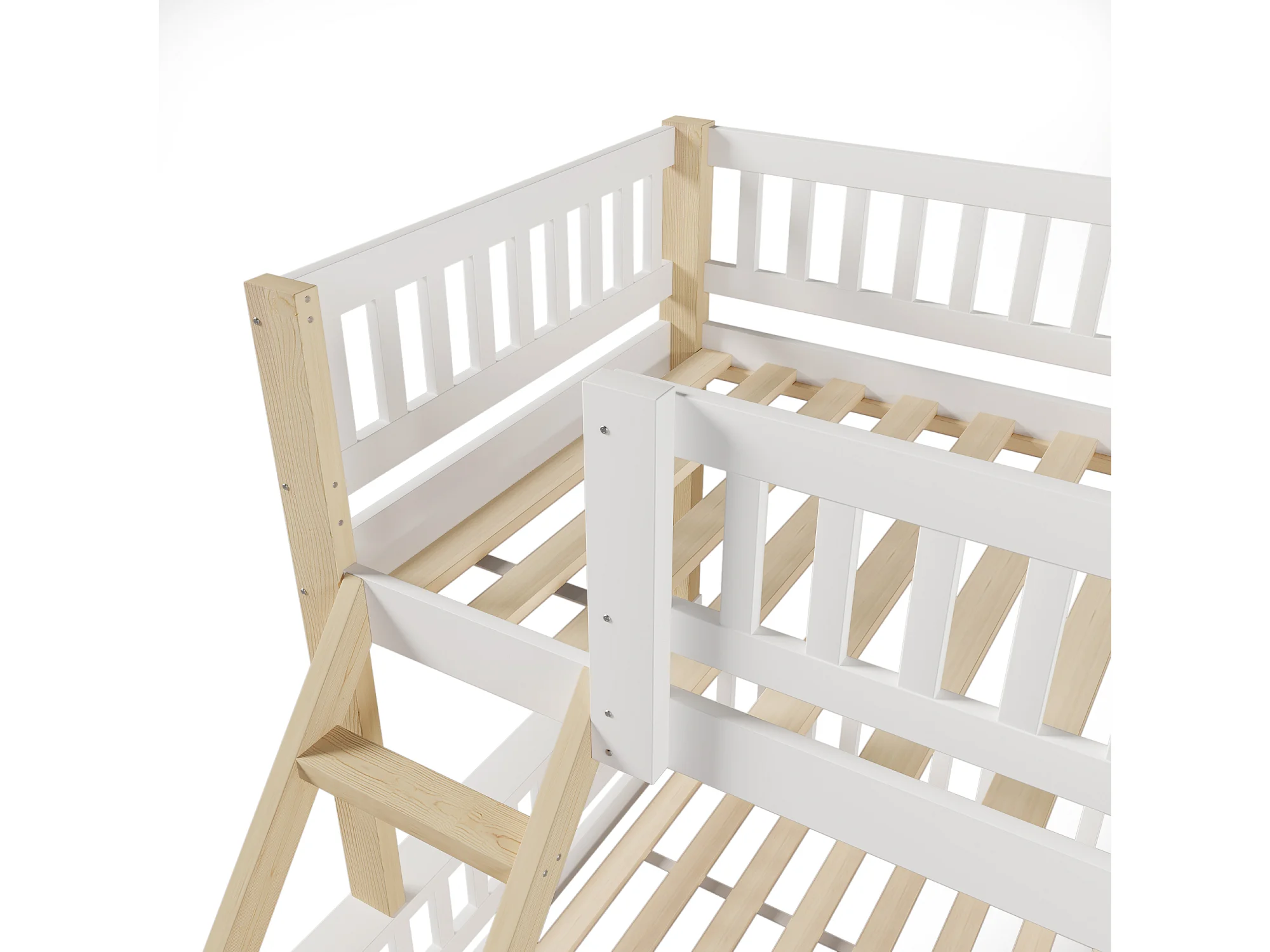 Lit superposé 90 x 200cm et 140x200cm avec échelle et barrières - Bois pin et MDF - Blanc et naturel