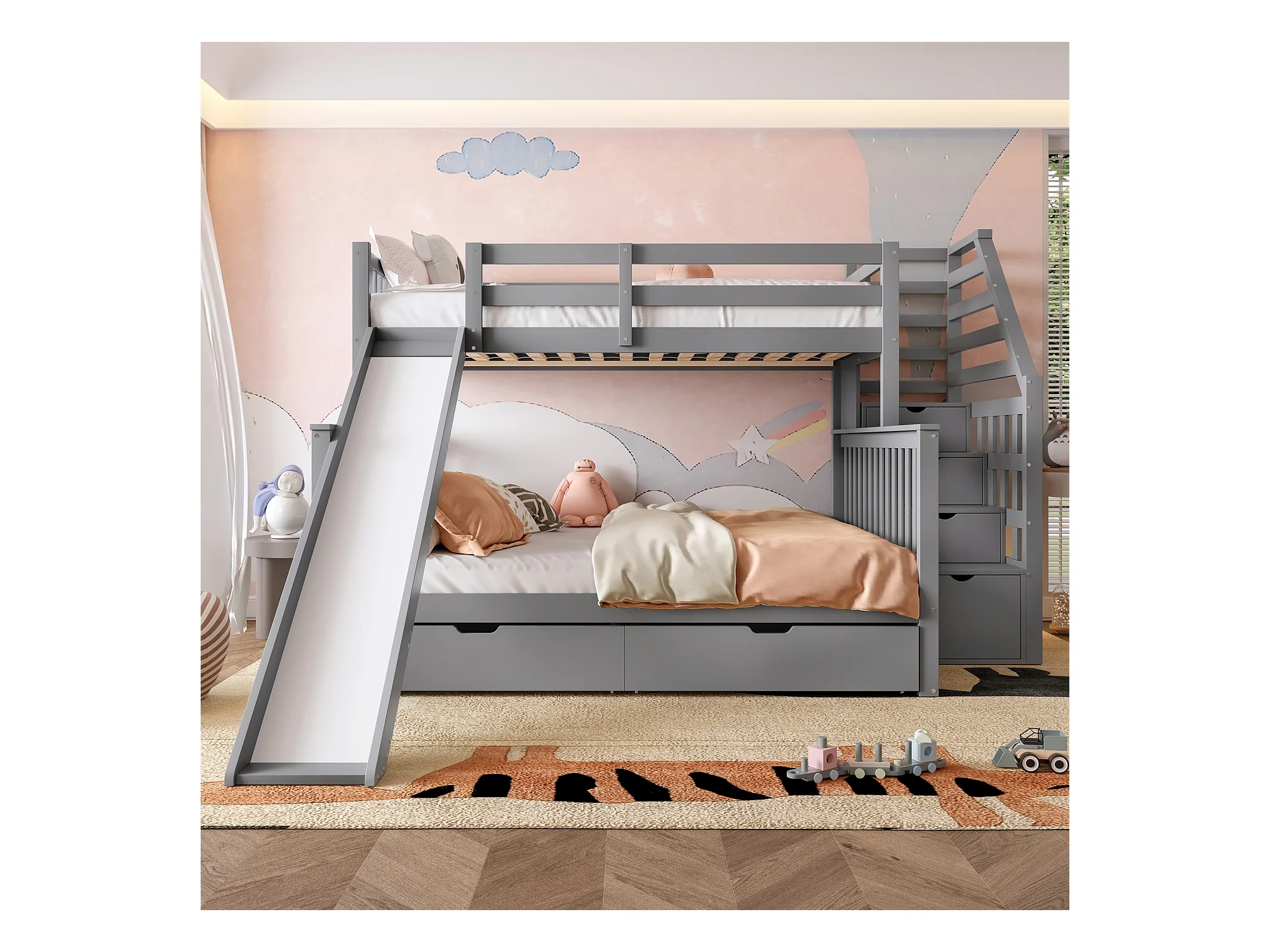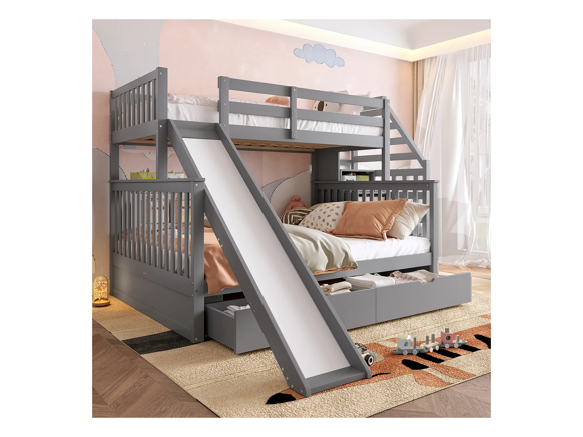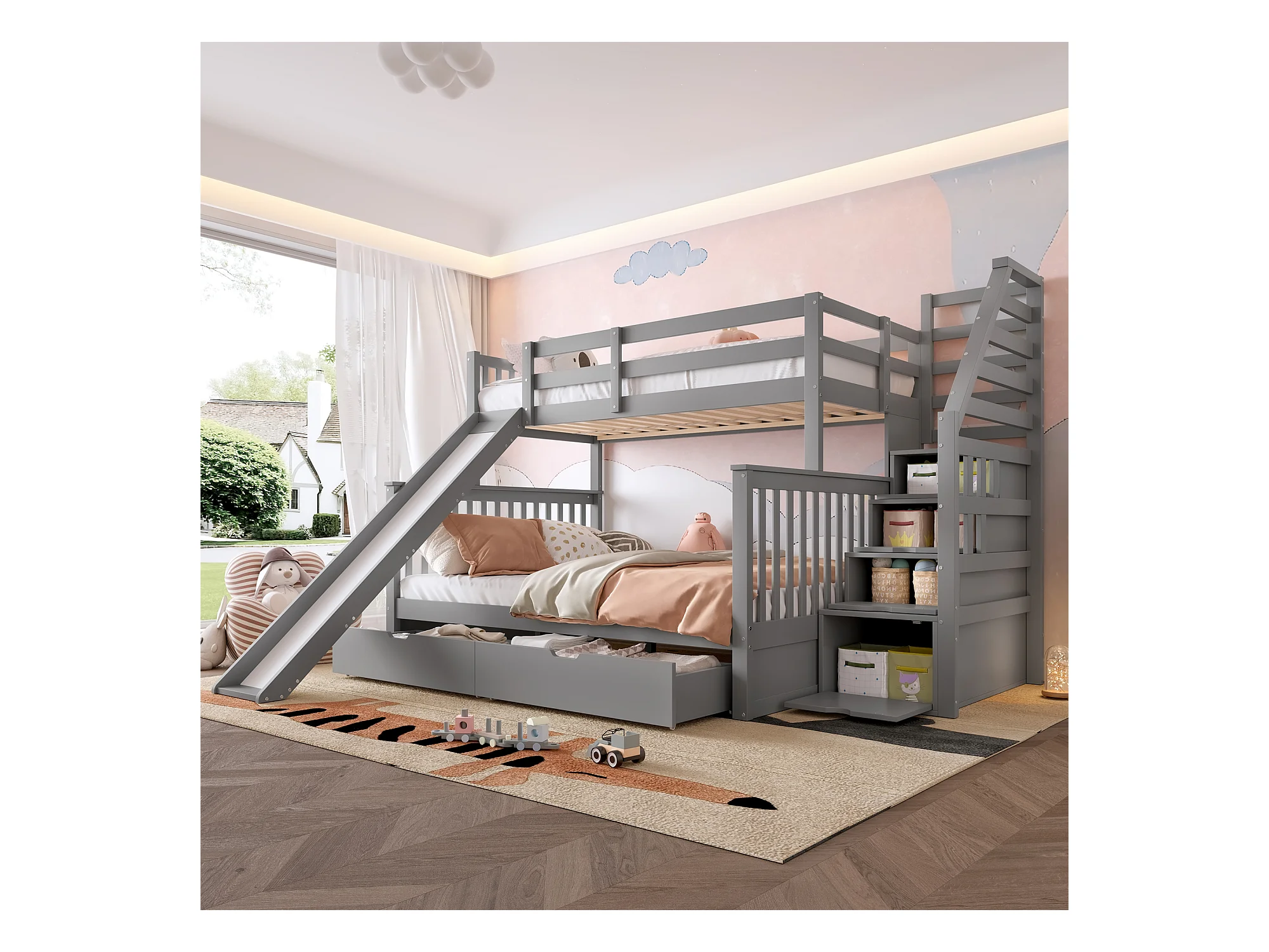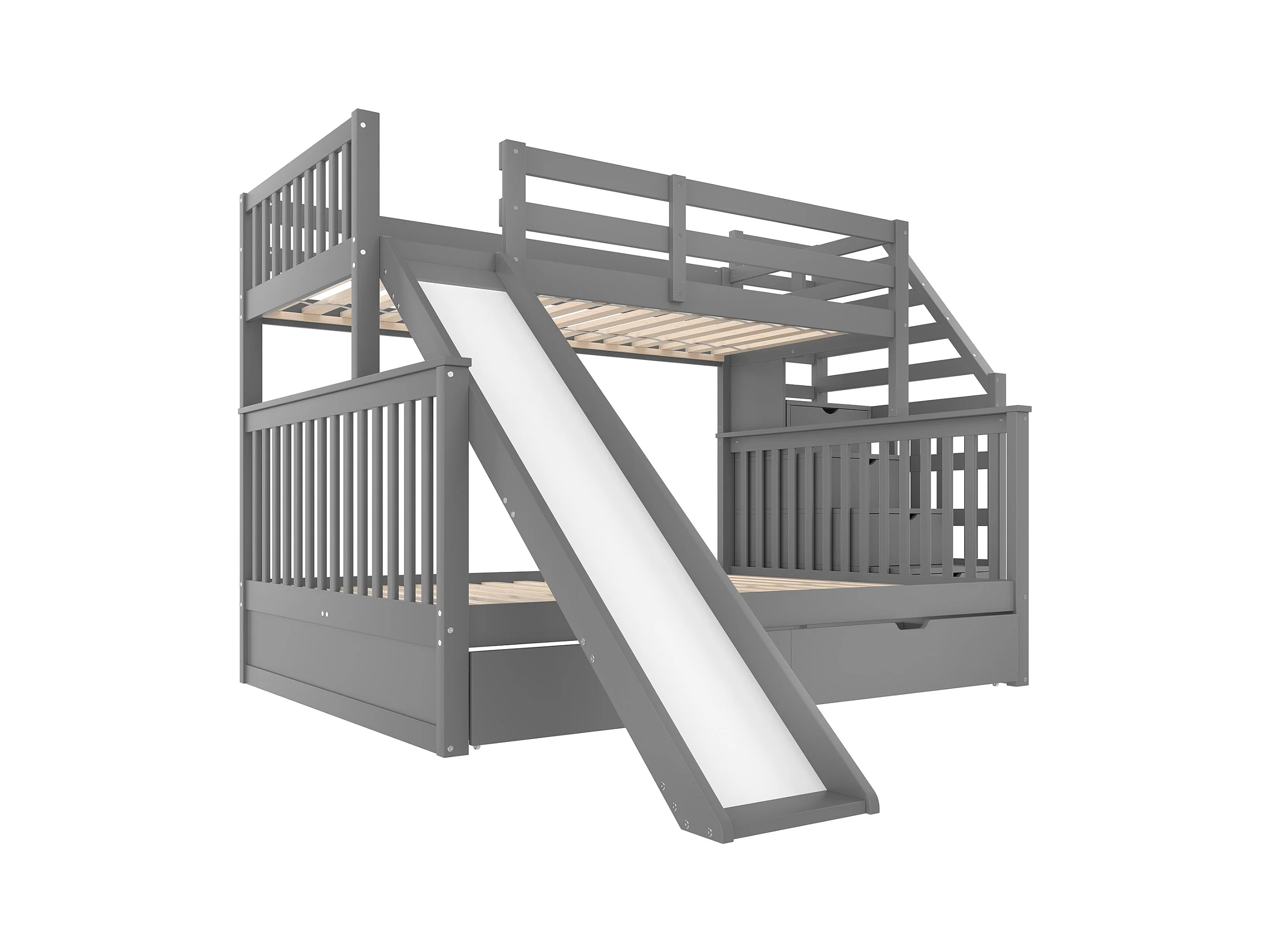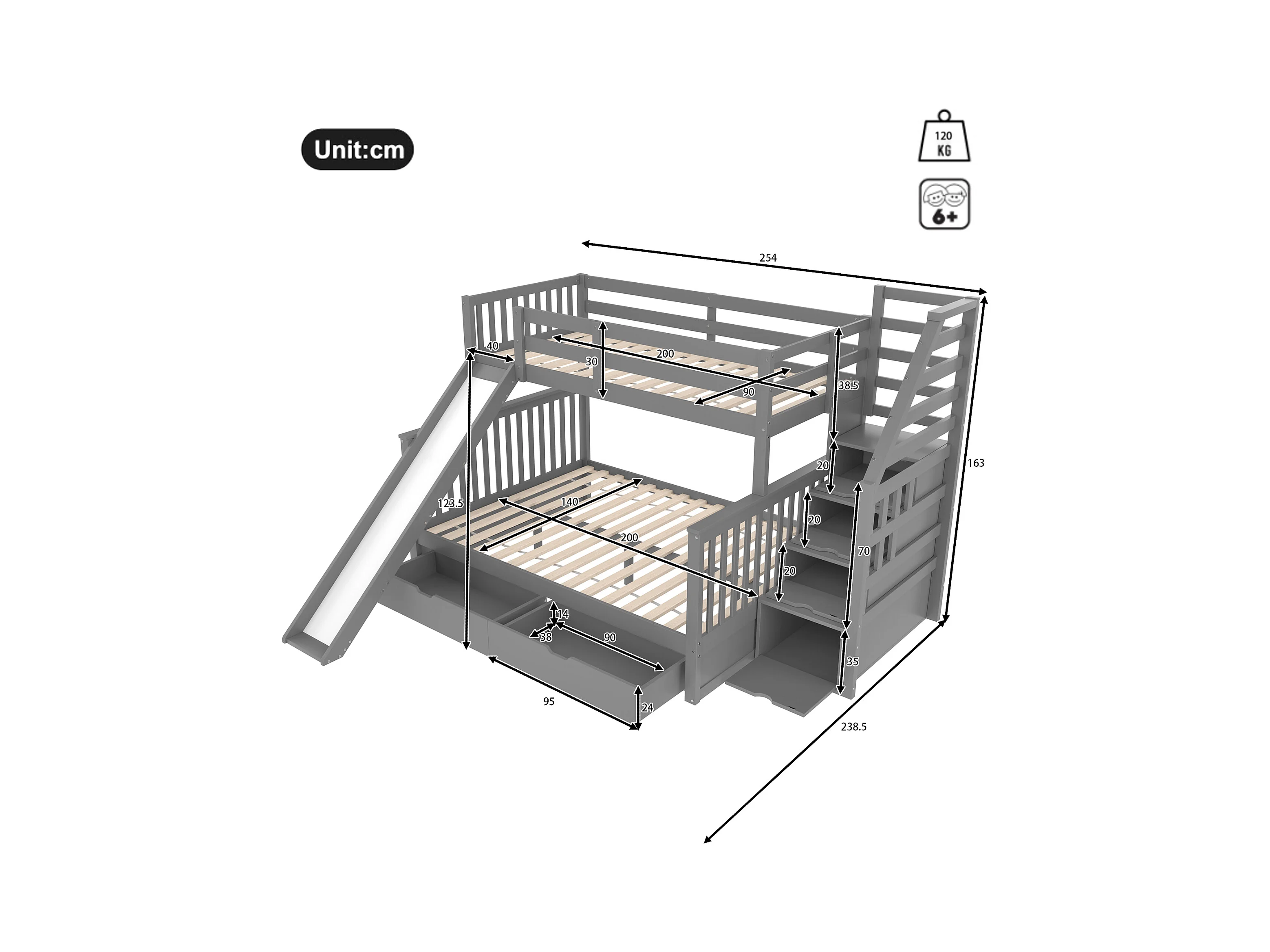 Lit superposé 90x200/140x200 cm, avec tiroirs, espace de rangement et toboggan, pin, gris (254x238.5x163 cm)