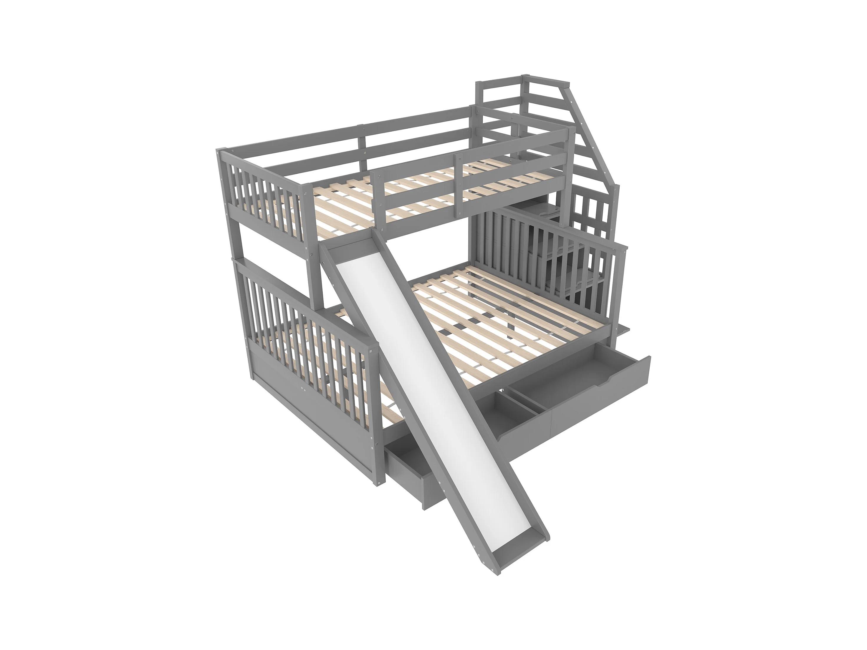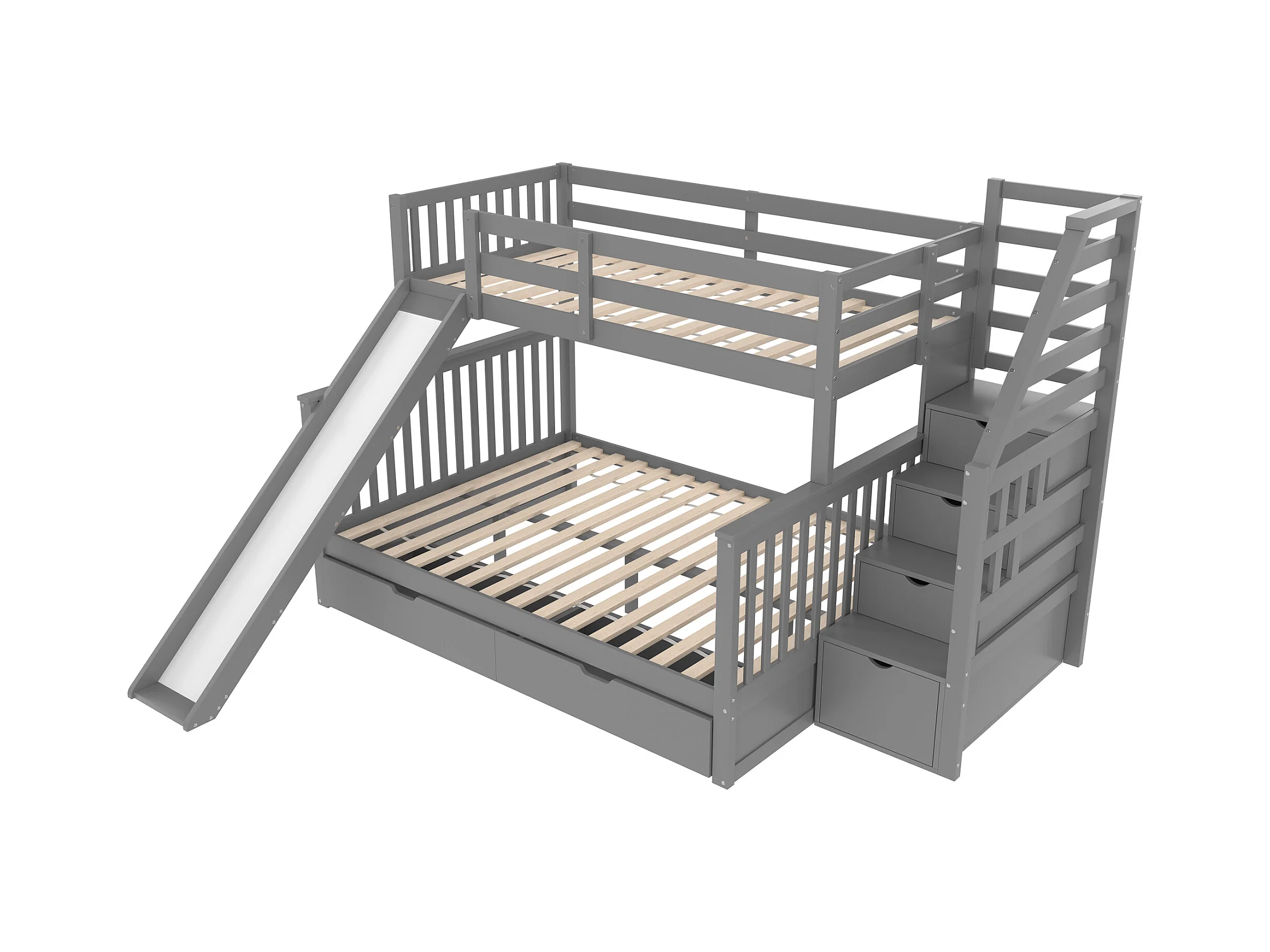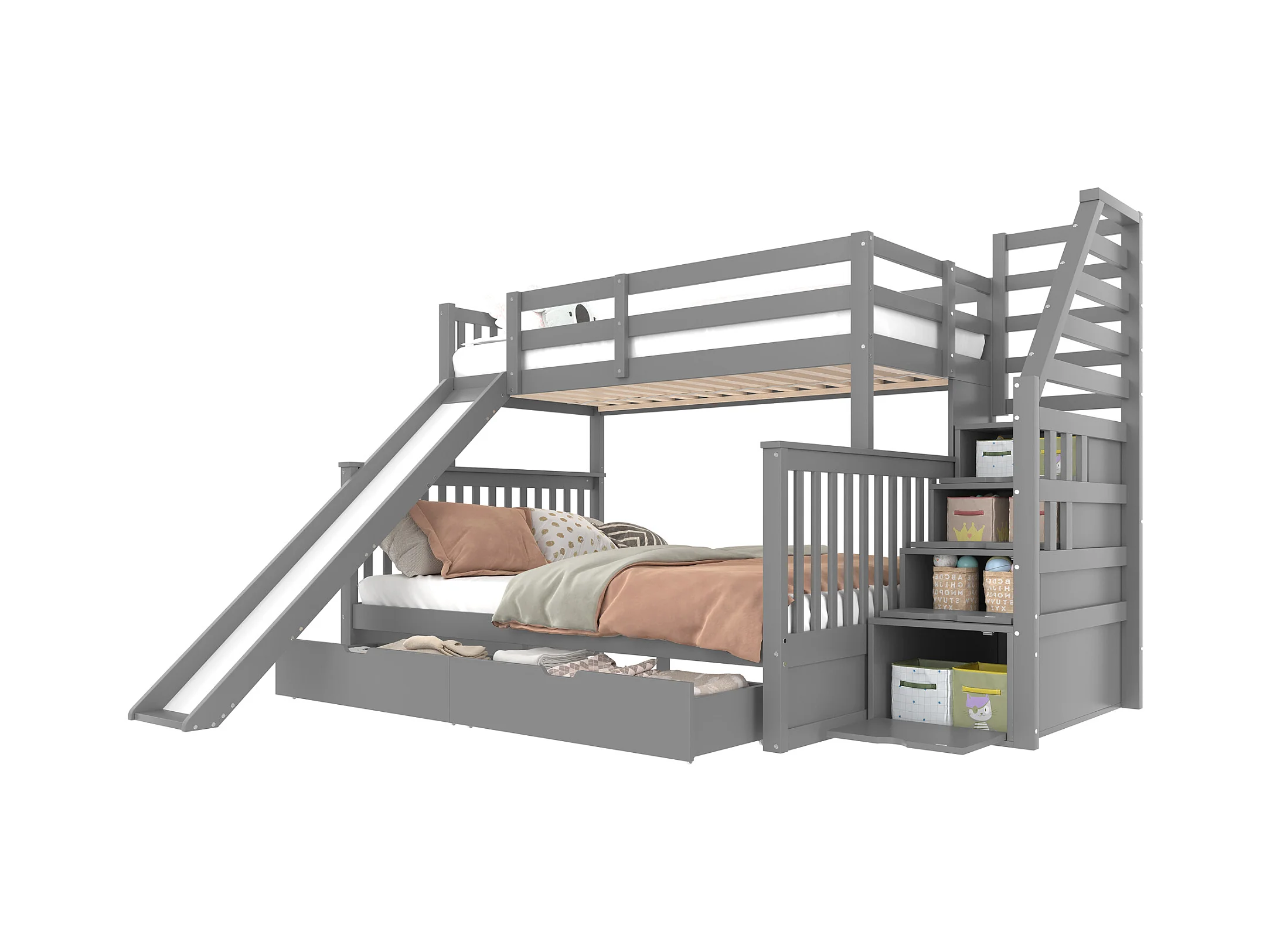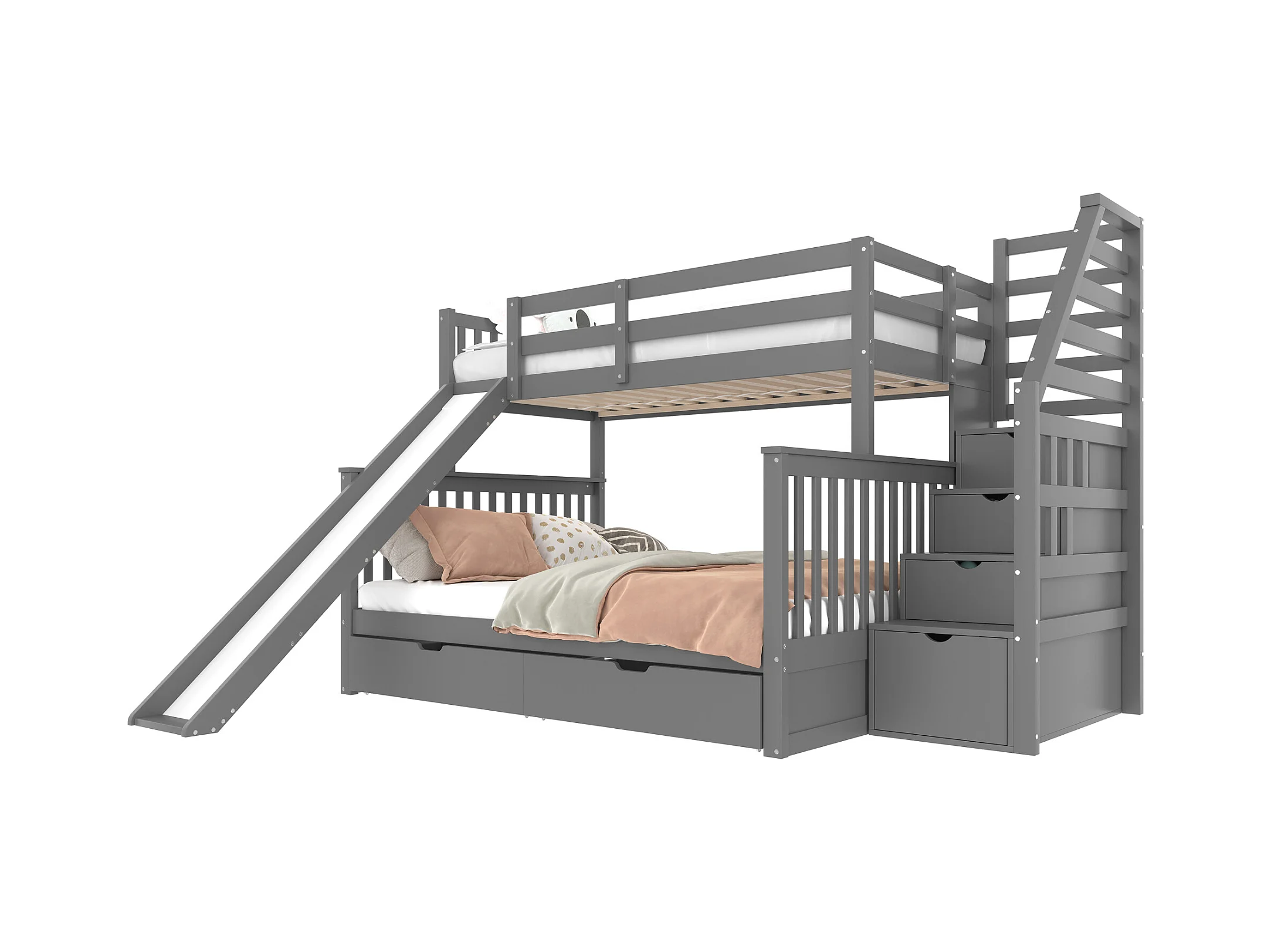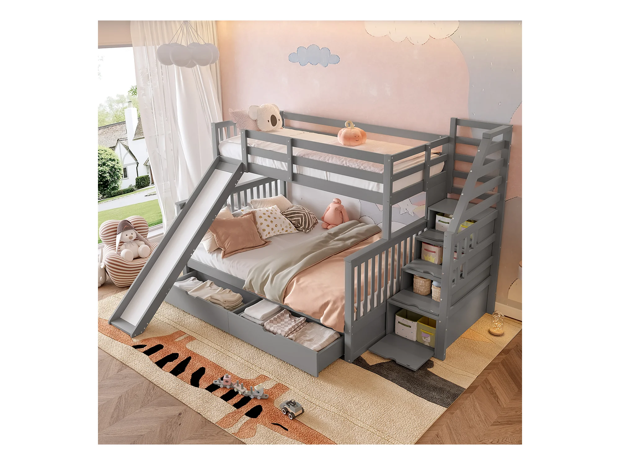 Lit superposé 90x200/140x200 cm, avec tiroirs, espace de rangement et toboggan, pin, gris (254x238.5x163 cm)