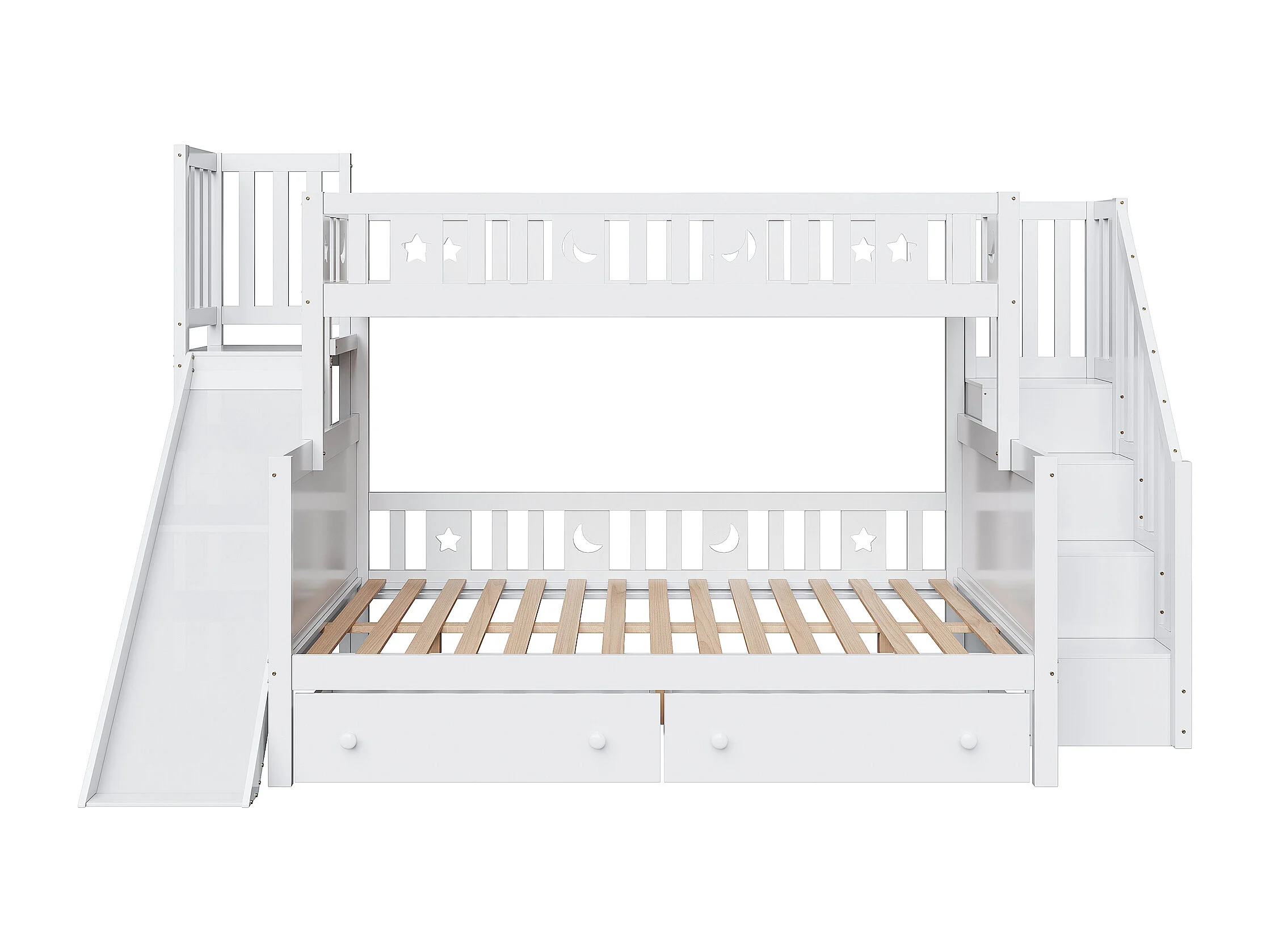 Lit Superposé 90x200/140x200 cm en Bois Massif avec Toboggan, Étageres, 2 Grands Tiroirs et Sommier Inclus - Blanc