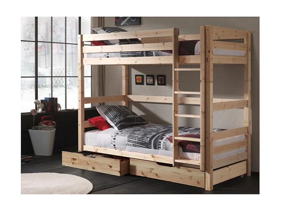 Lit Superposé Haut & 2 Tiroirs de Lit Enfant "Pino" 90x200cm Naturel