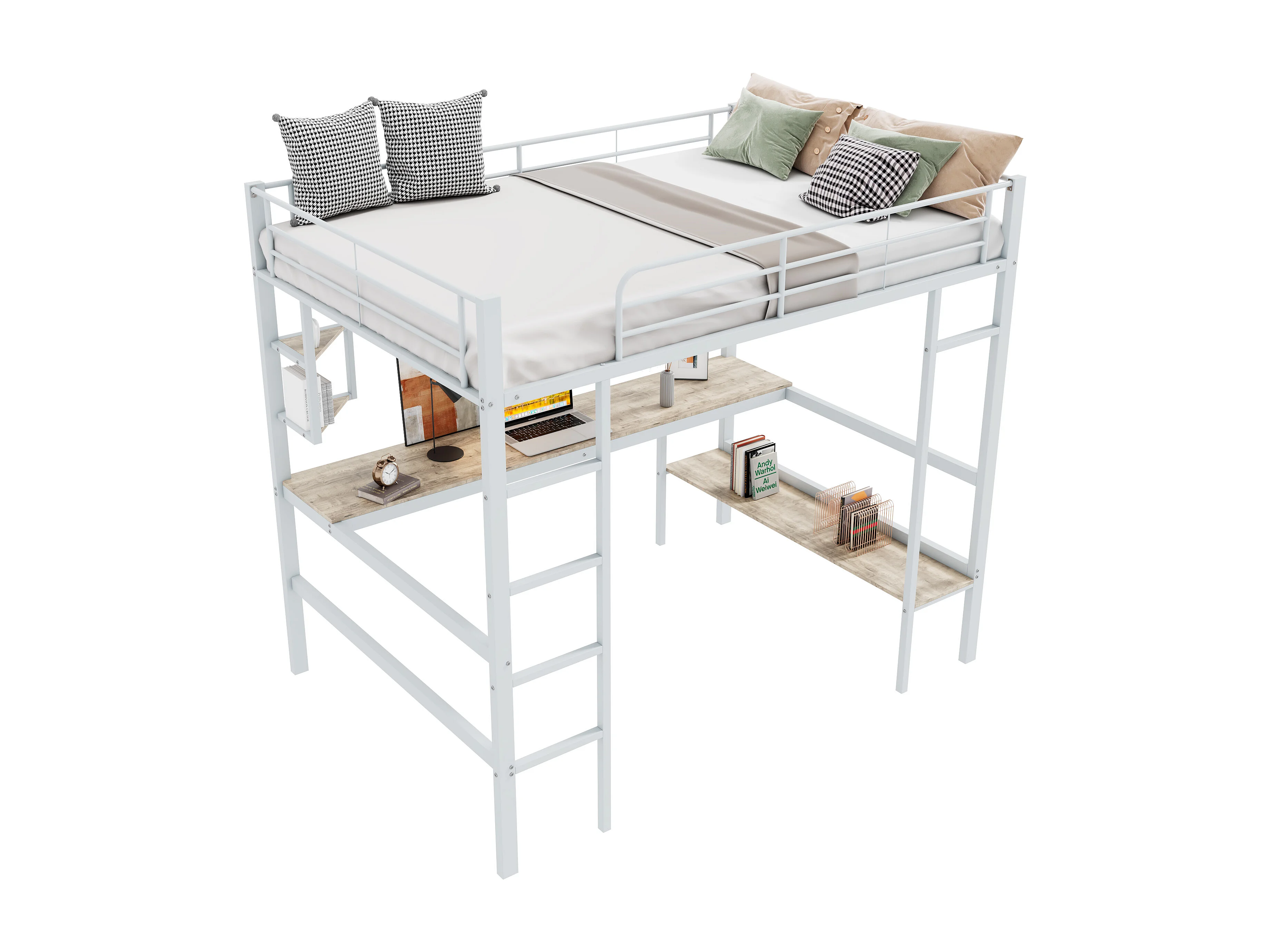 Lit superposé 90x200 cm avec bureau et étagères, design métallique, Blanc (204.5x95x180.5 cm)