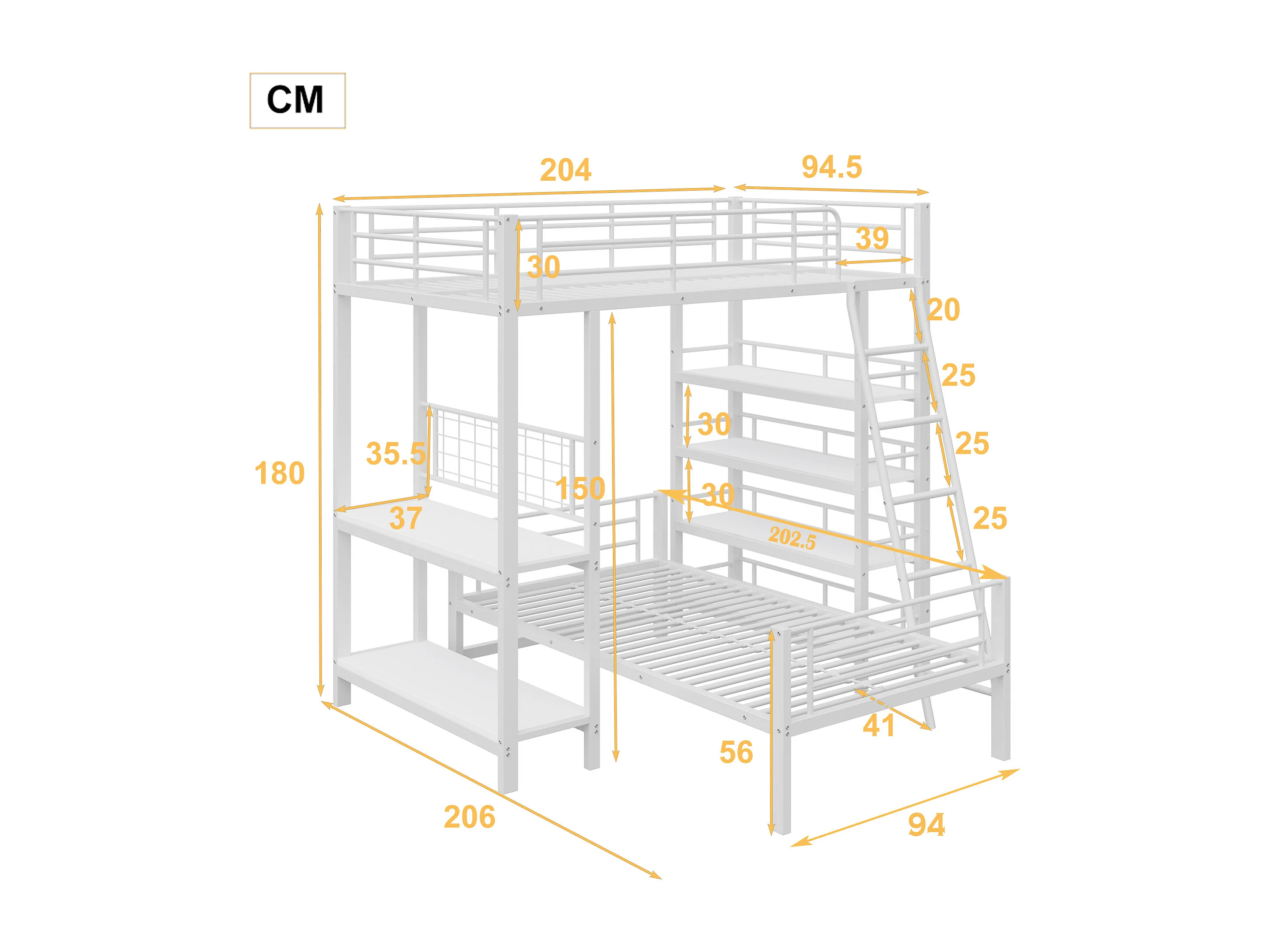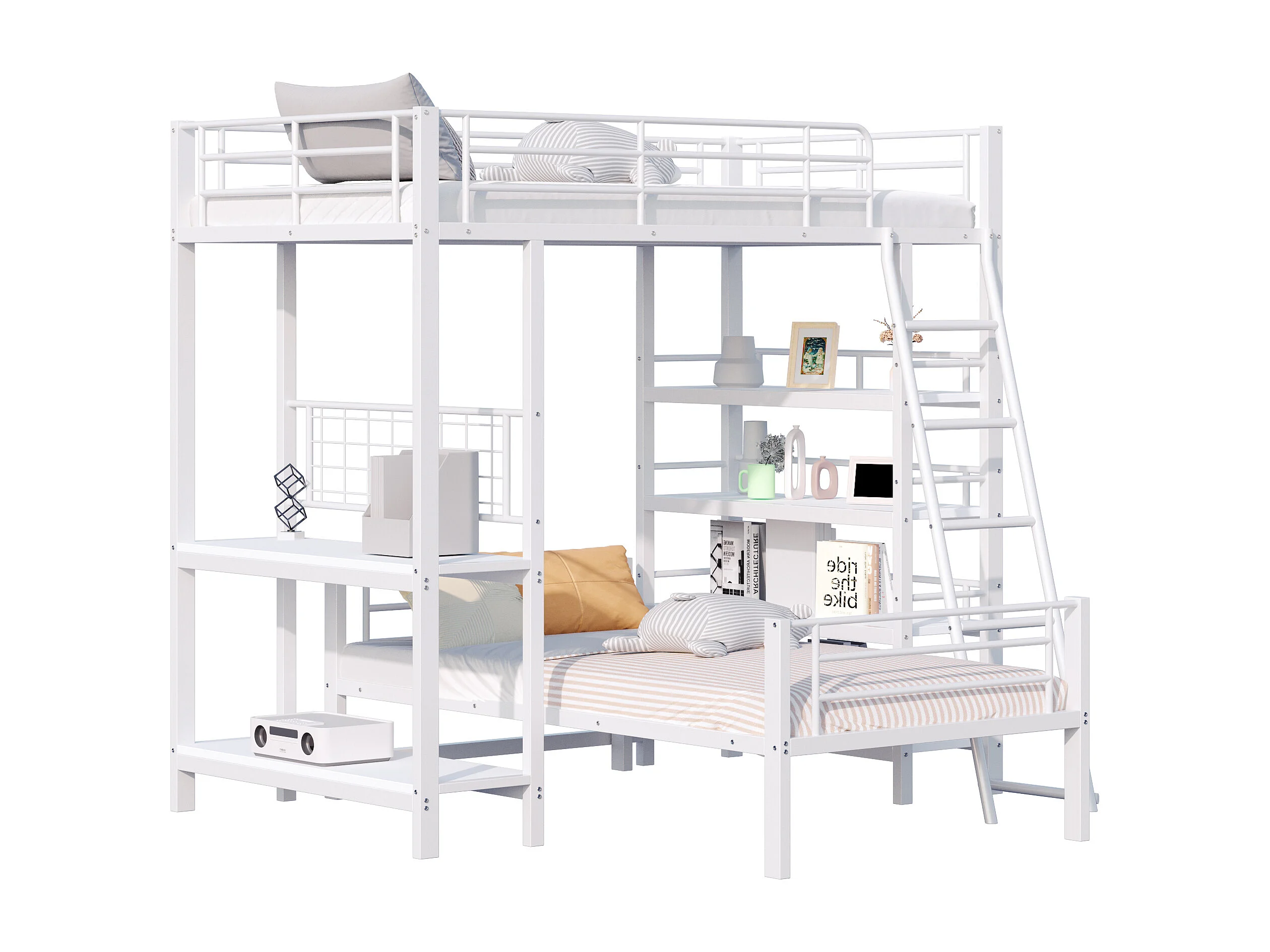 Lit Mezzanine 90 x 200 cm - Lit Superposé Modulable - En Métal - Rangement Intégré, Sommier À Lattes - Sans Matelas - Blanc