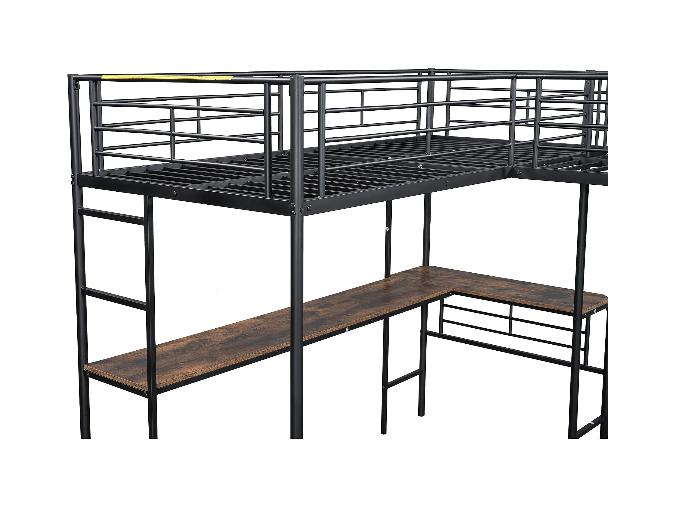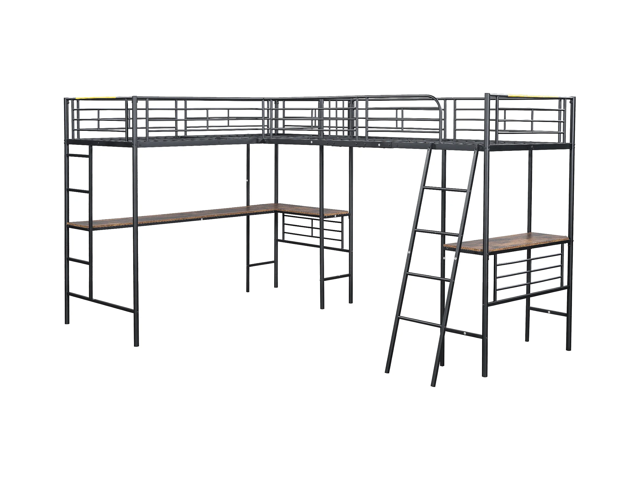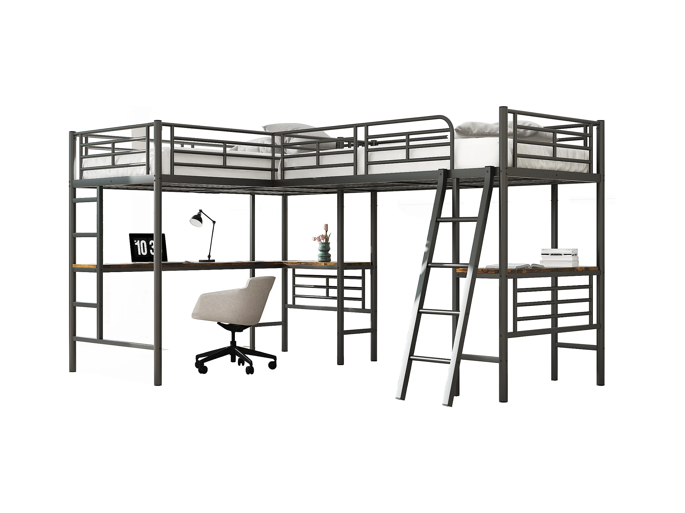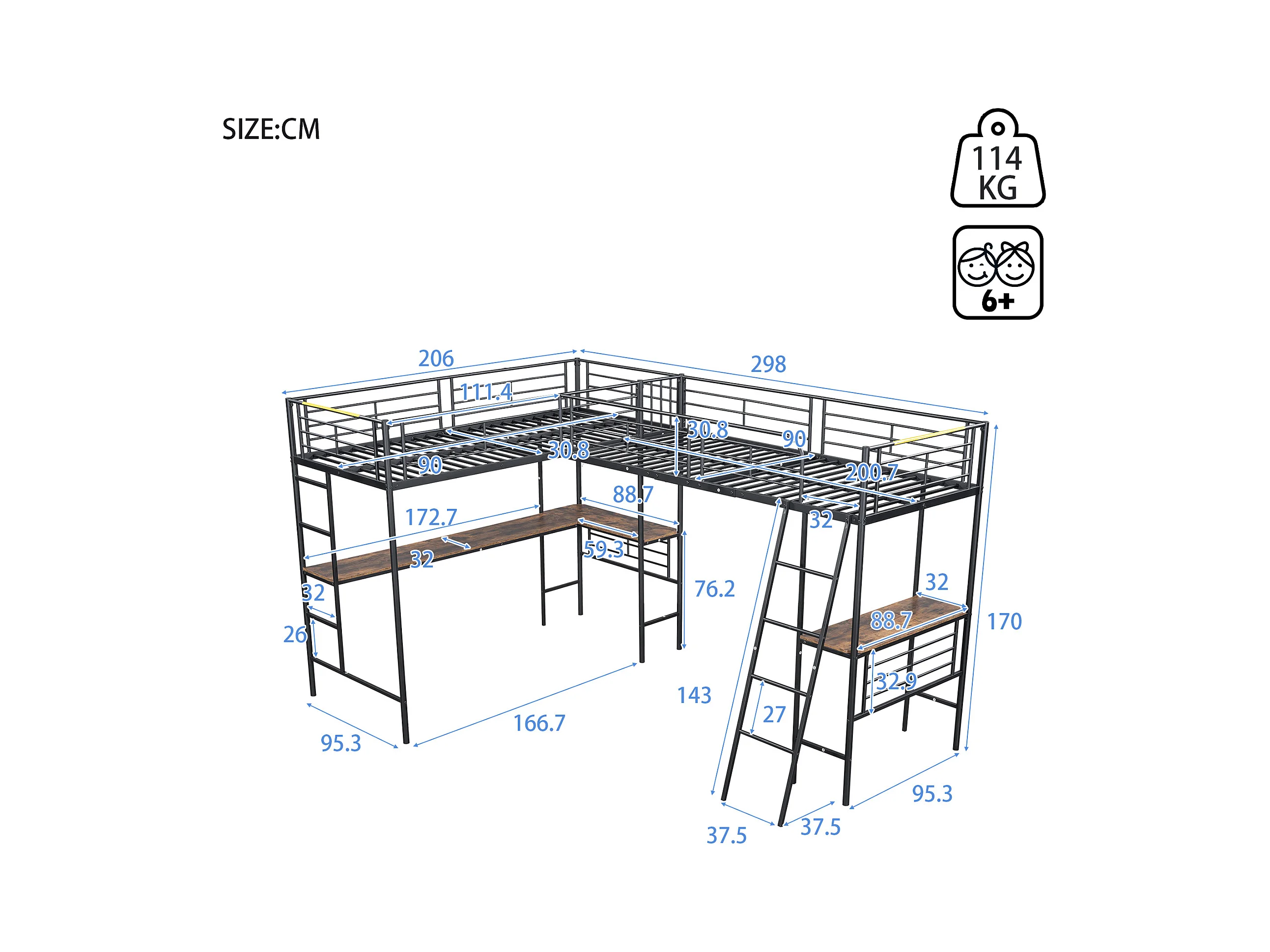 Lit superposé en métal avec table et armoire, étagères et 4 étages, noir et bois foncé, 90x200 cm