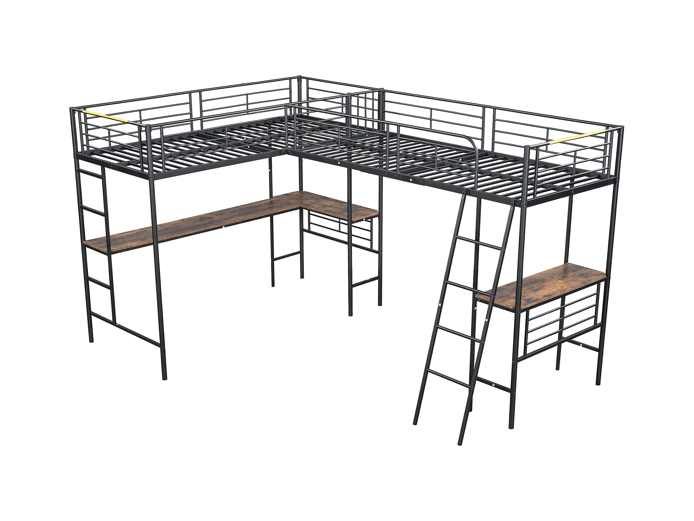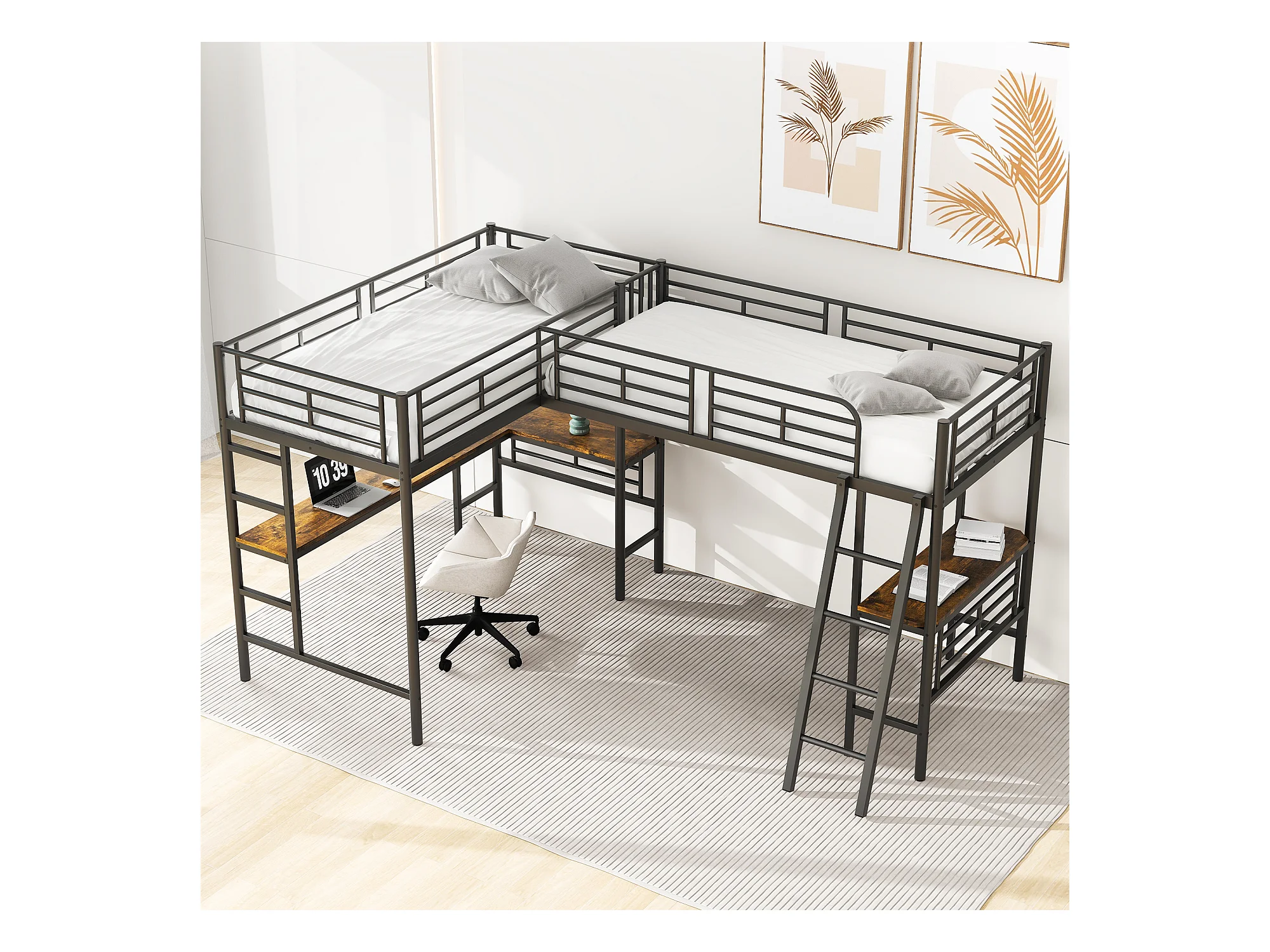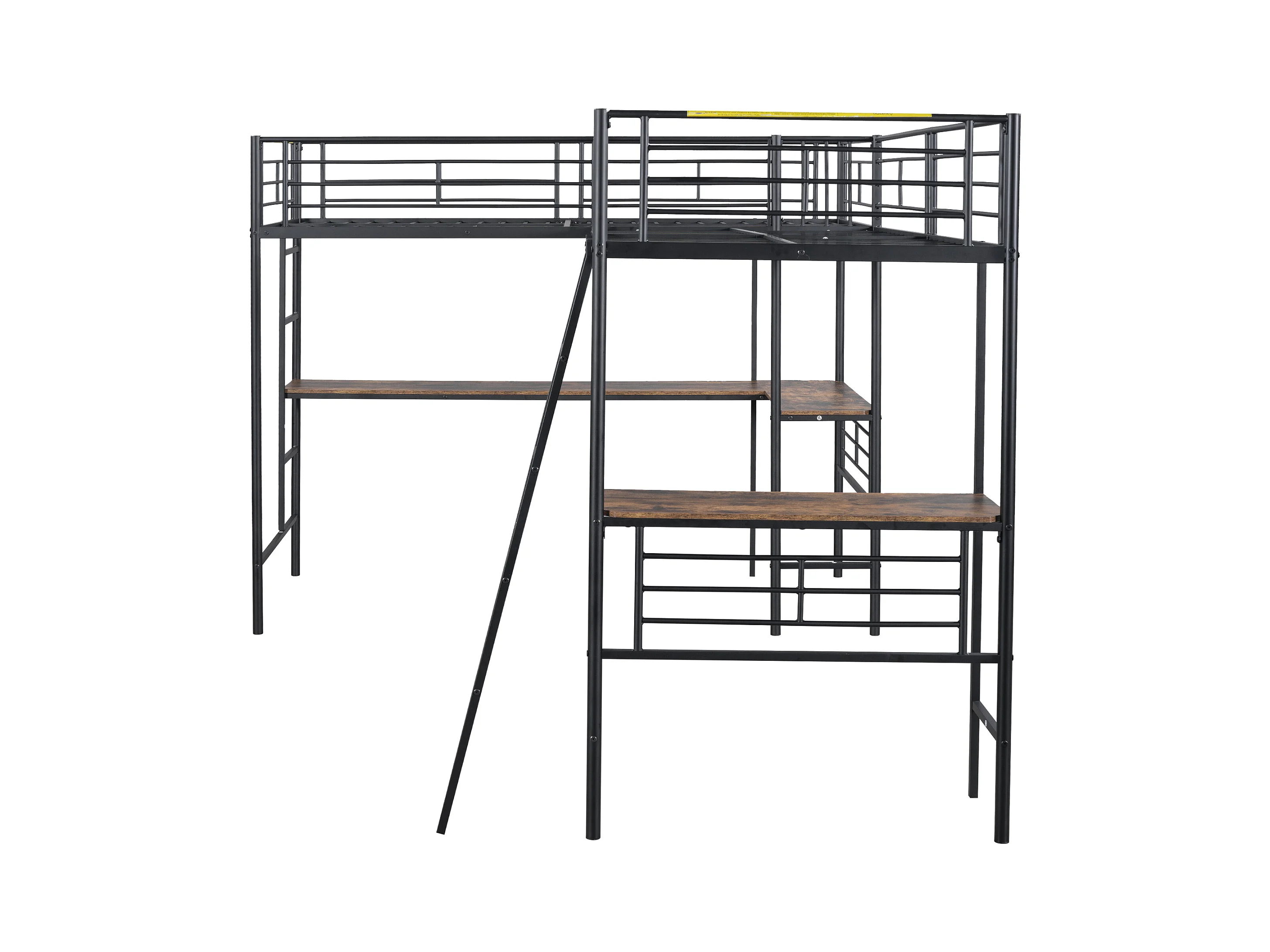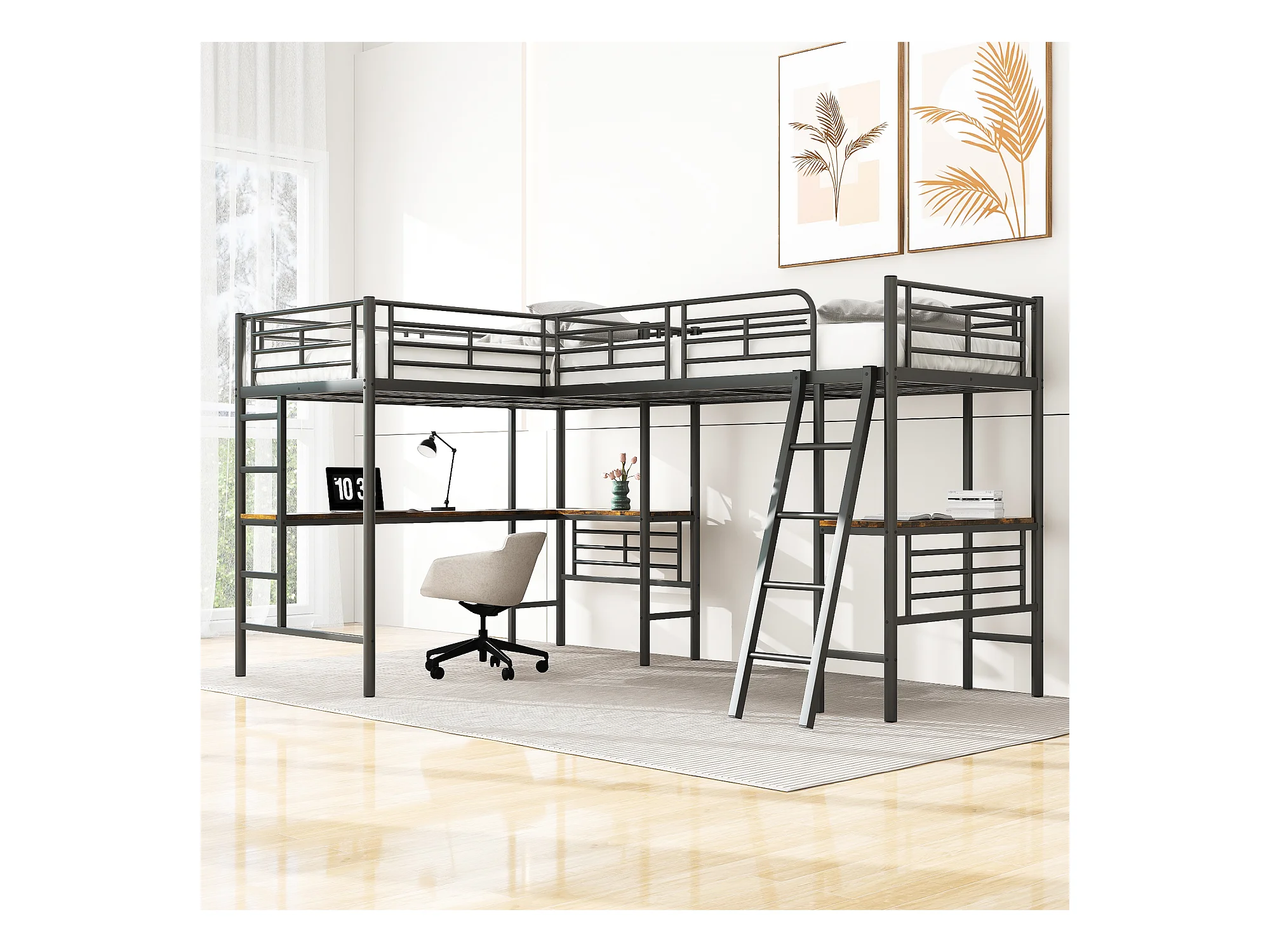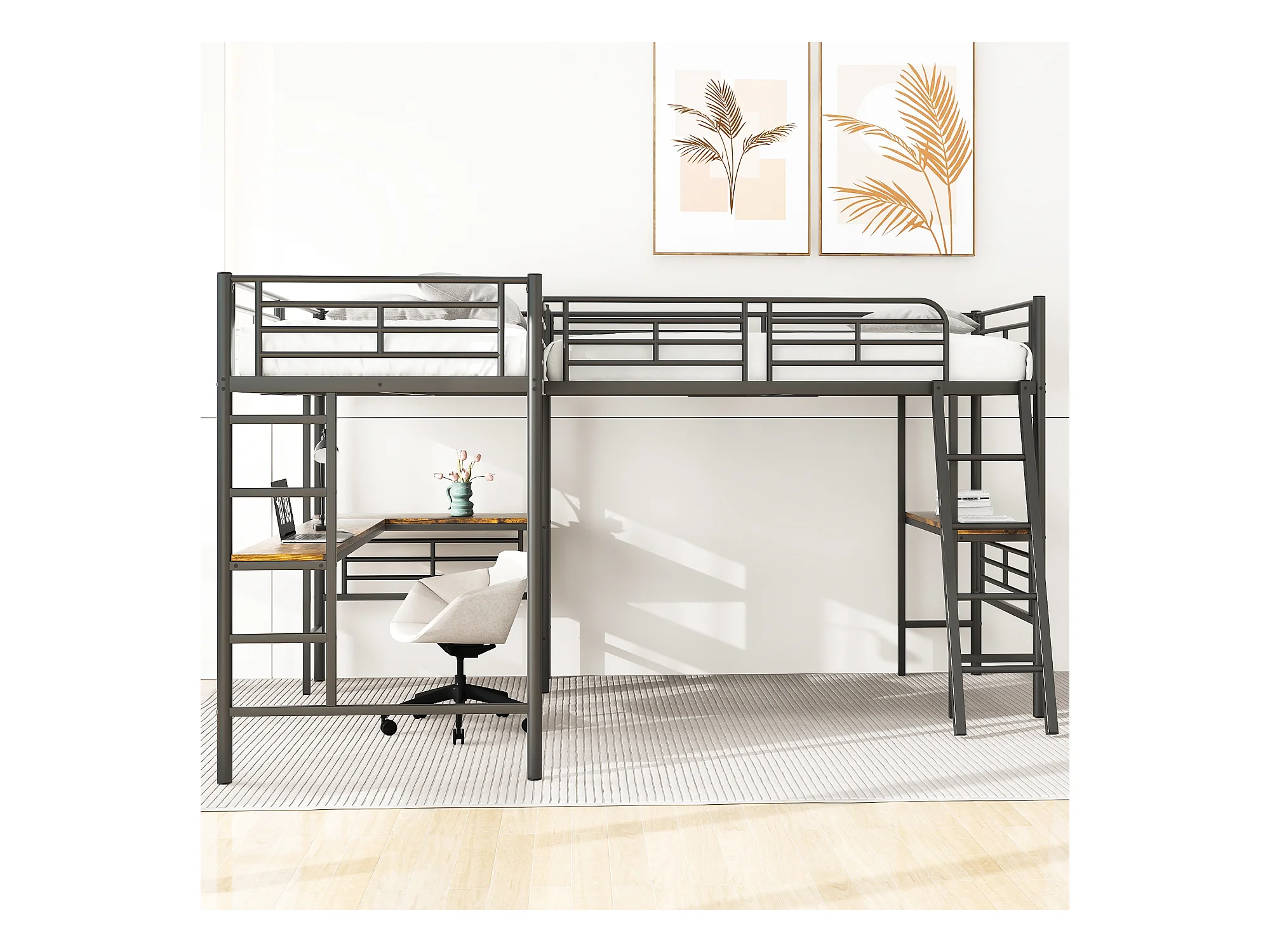 Lit superposé en métal avec table et armoire, étagères et 4 étages, noir et bois foncé, 90x200 cm