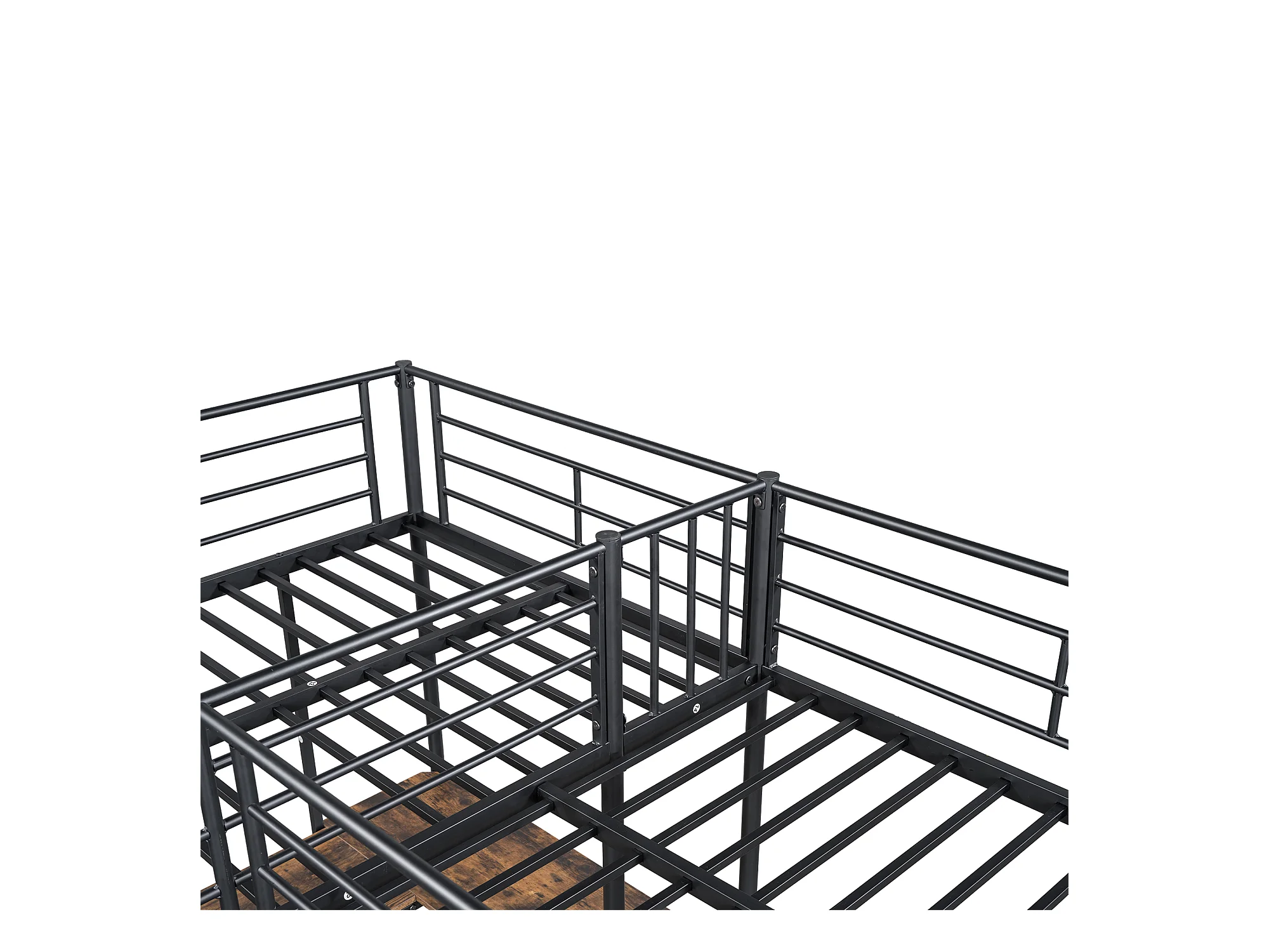 Lit superposé triple avec tiroirs, cadre métallique modulable en lit double 140x200 et deux lits simples 90x200, multifonctionnel, noir (246x206x177.8cm)