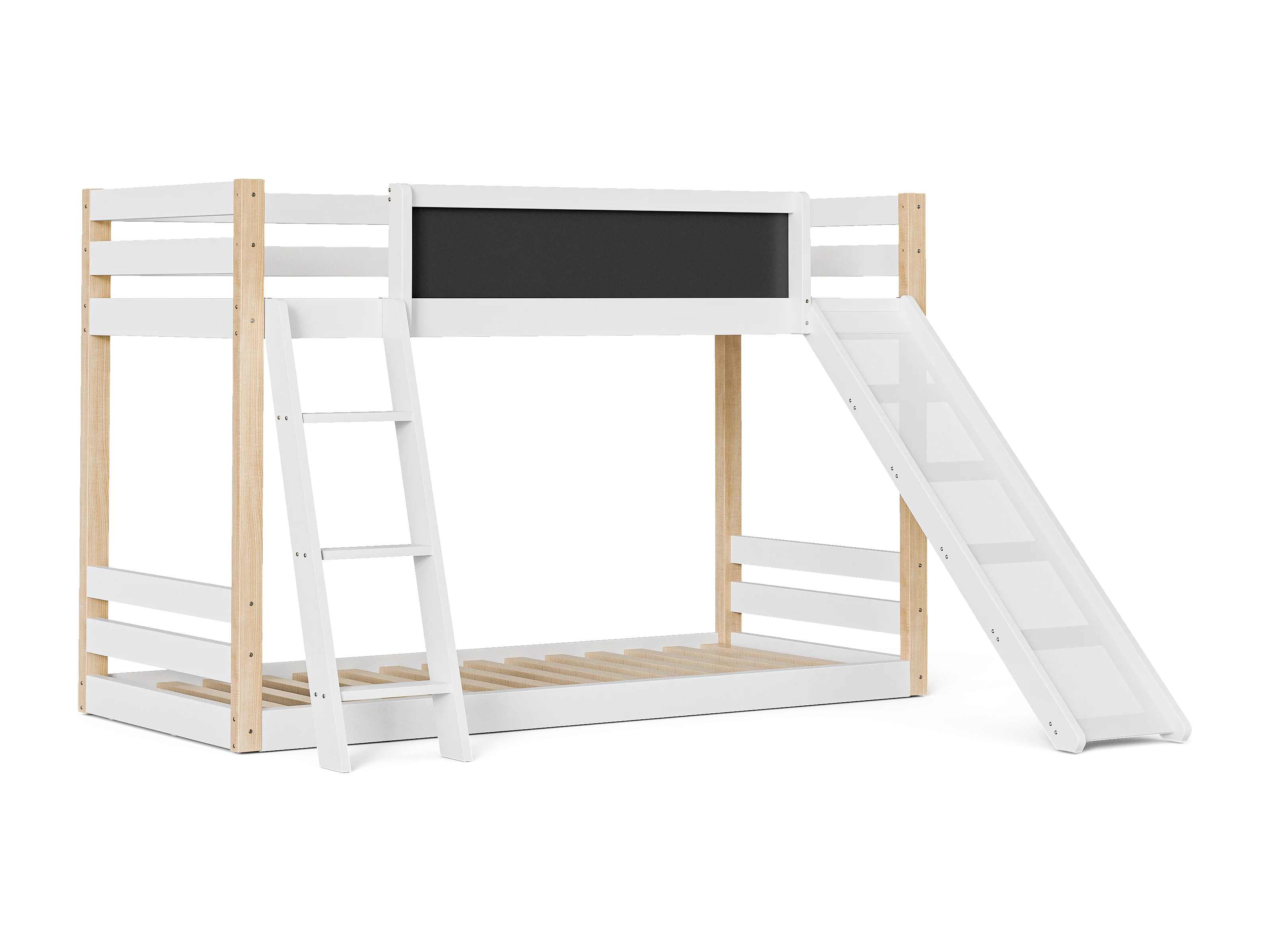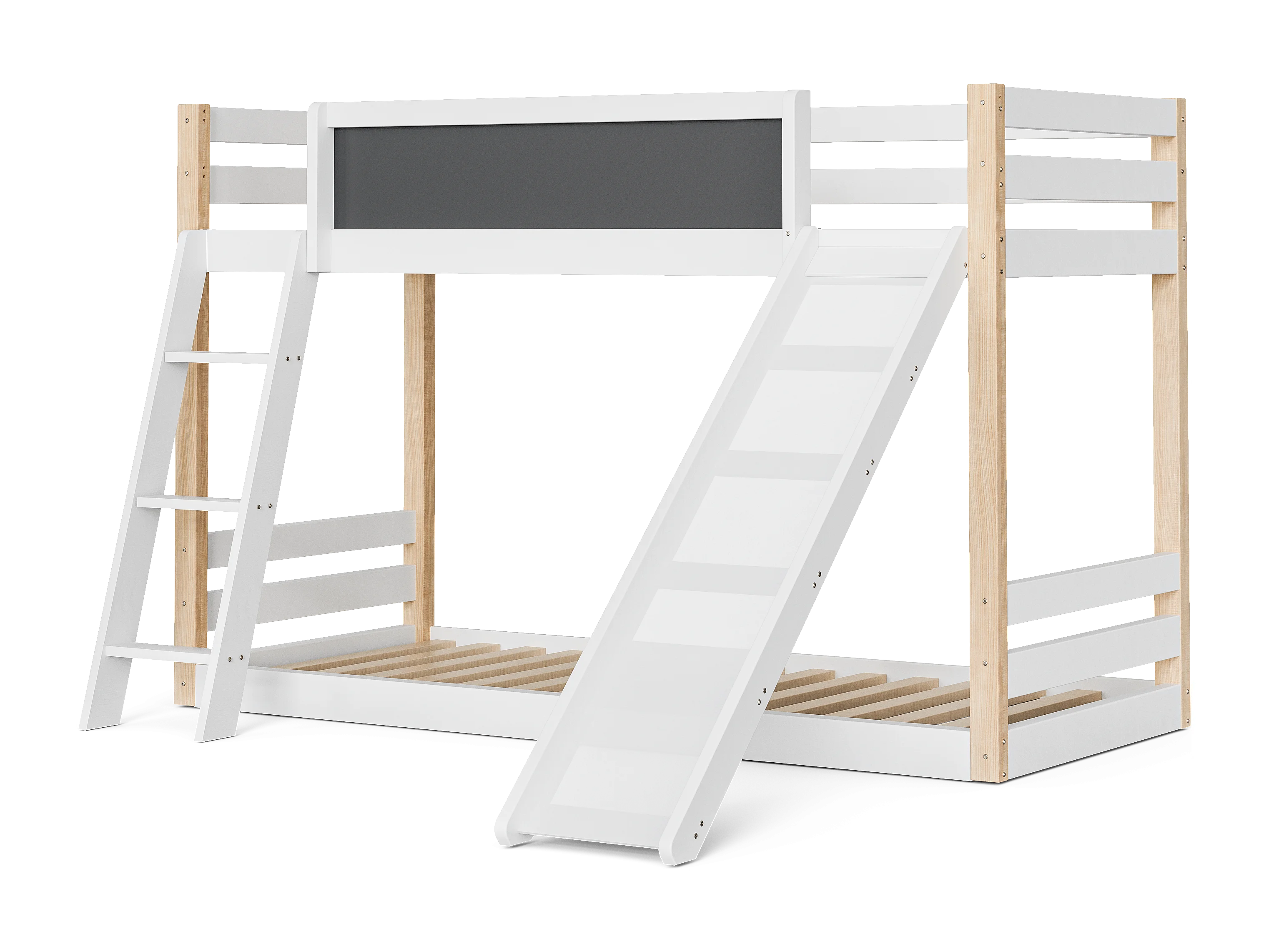 Lit superposé 90×200 cm et 90×190 cm, lit enfant avec toboggan et tableau noir, blanc et naturel