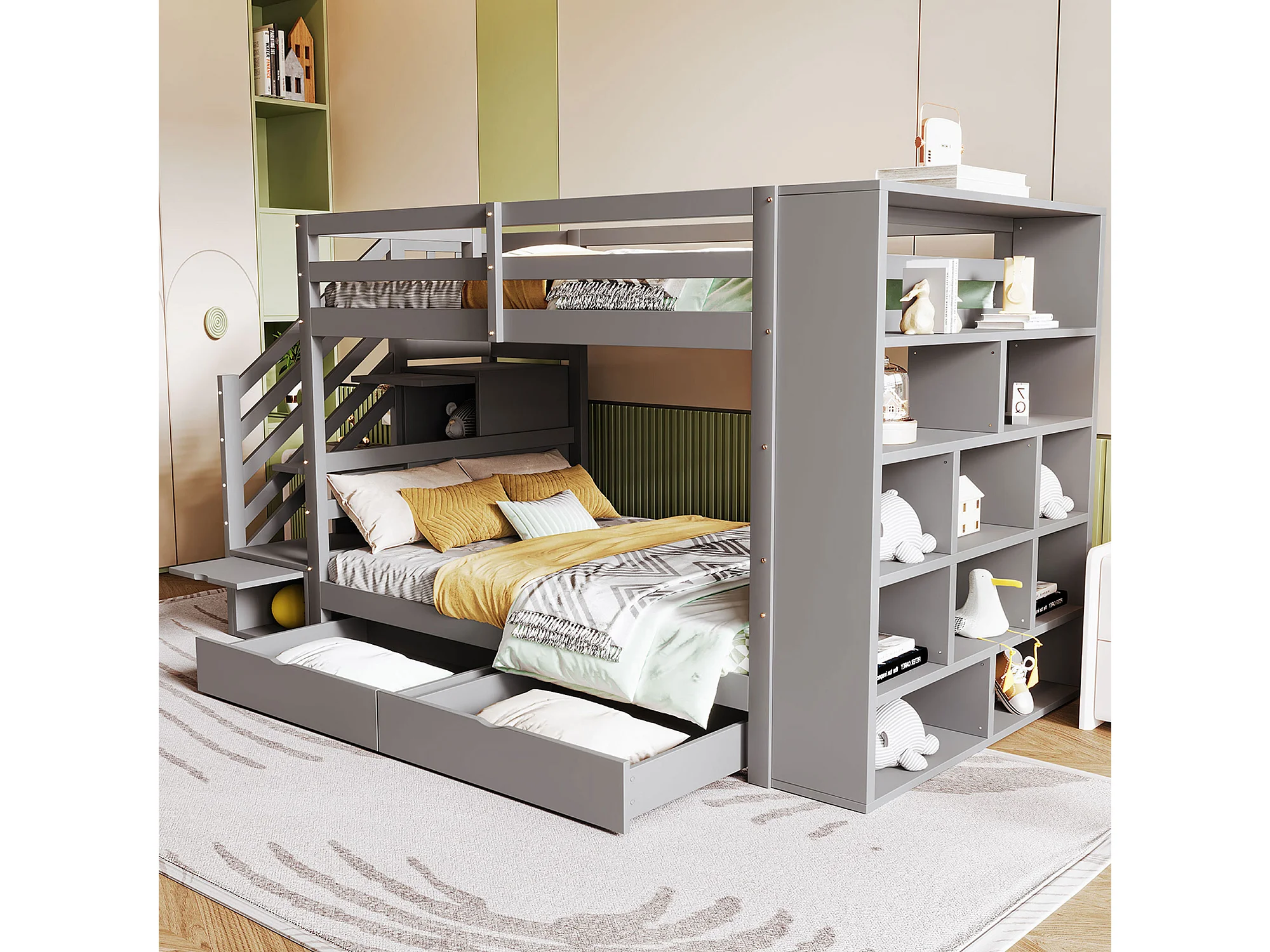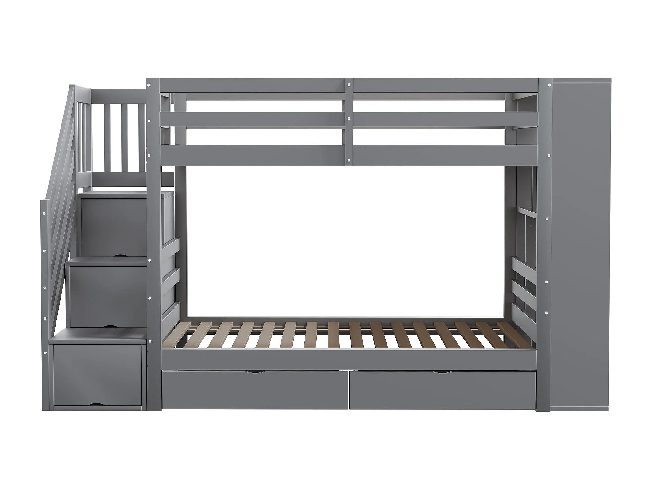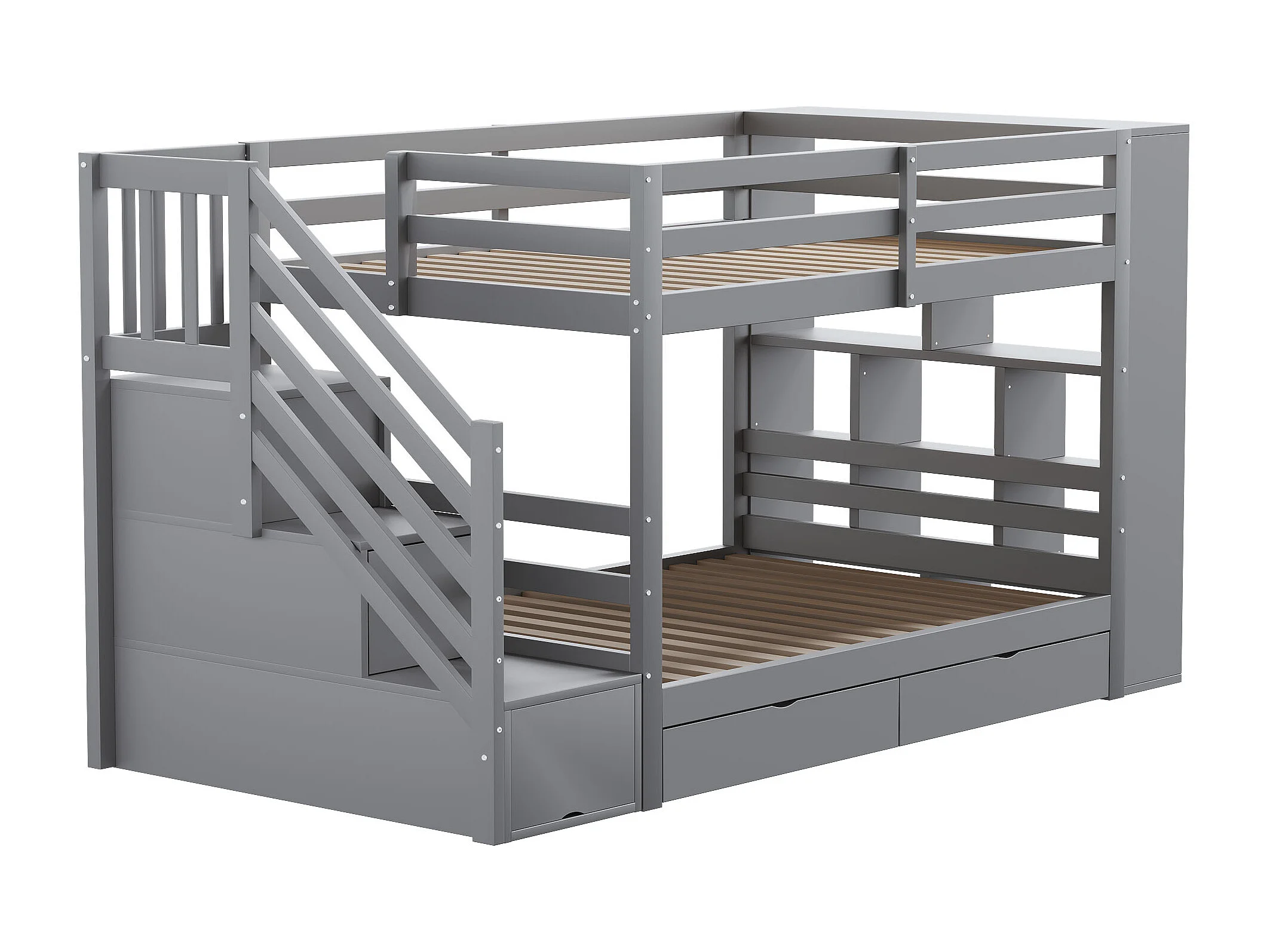 Lit superposé 90x200 cm gris en bois de pin, avec escalier sécurisé, tiroirs et rangements intégrés, barrière haute et sommier inclus