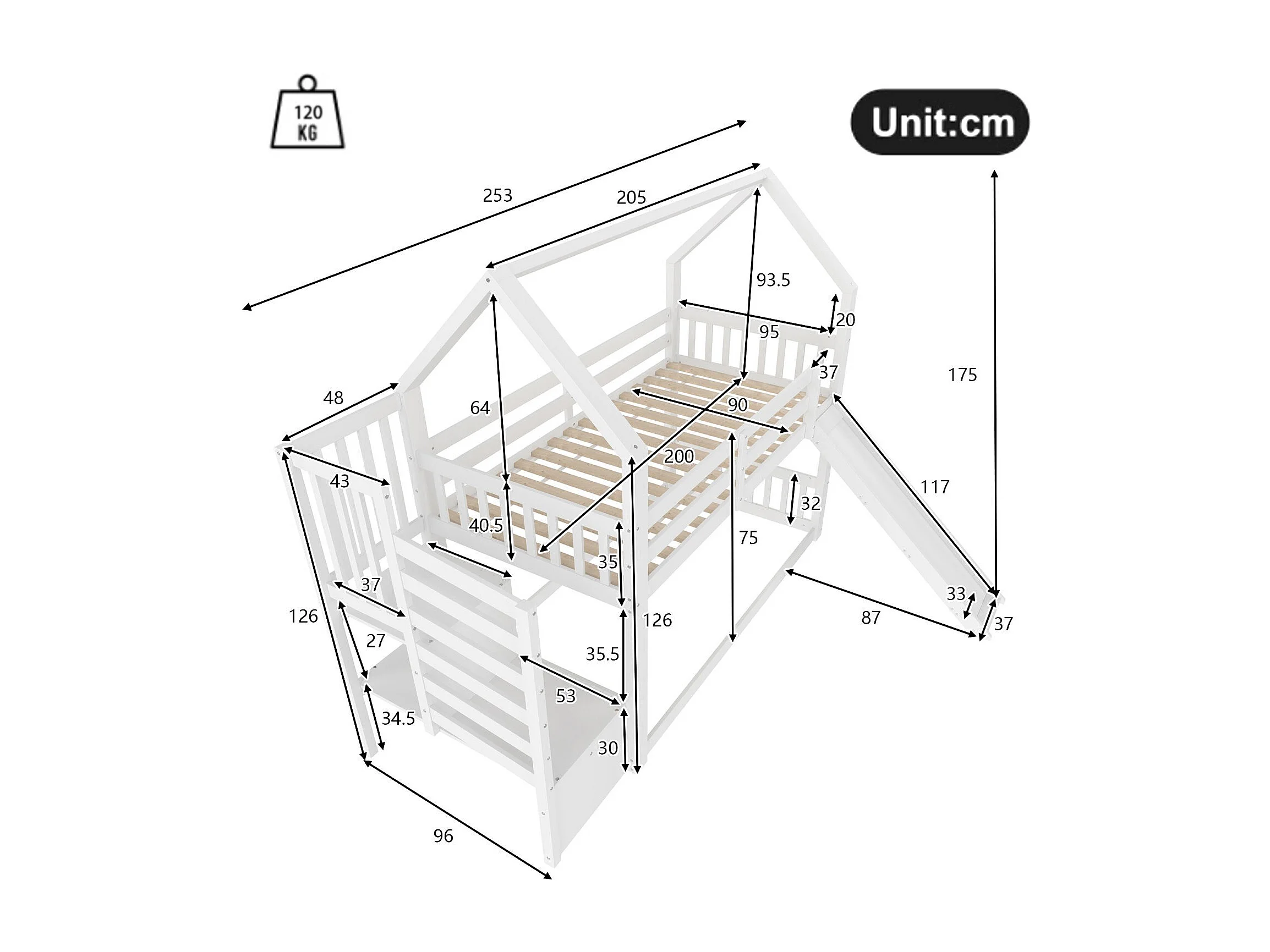 Lit superposé 90x200 cm, lit enfant avec escalier et toboggan, barrière de sécurité - blanc (sans matelas)
