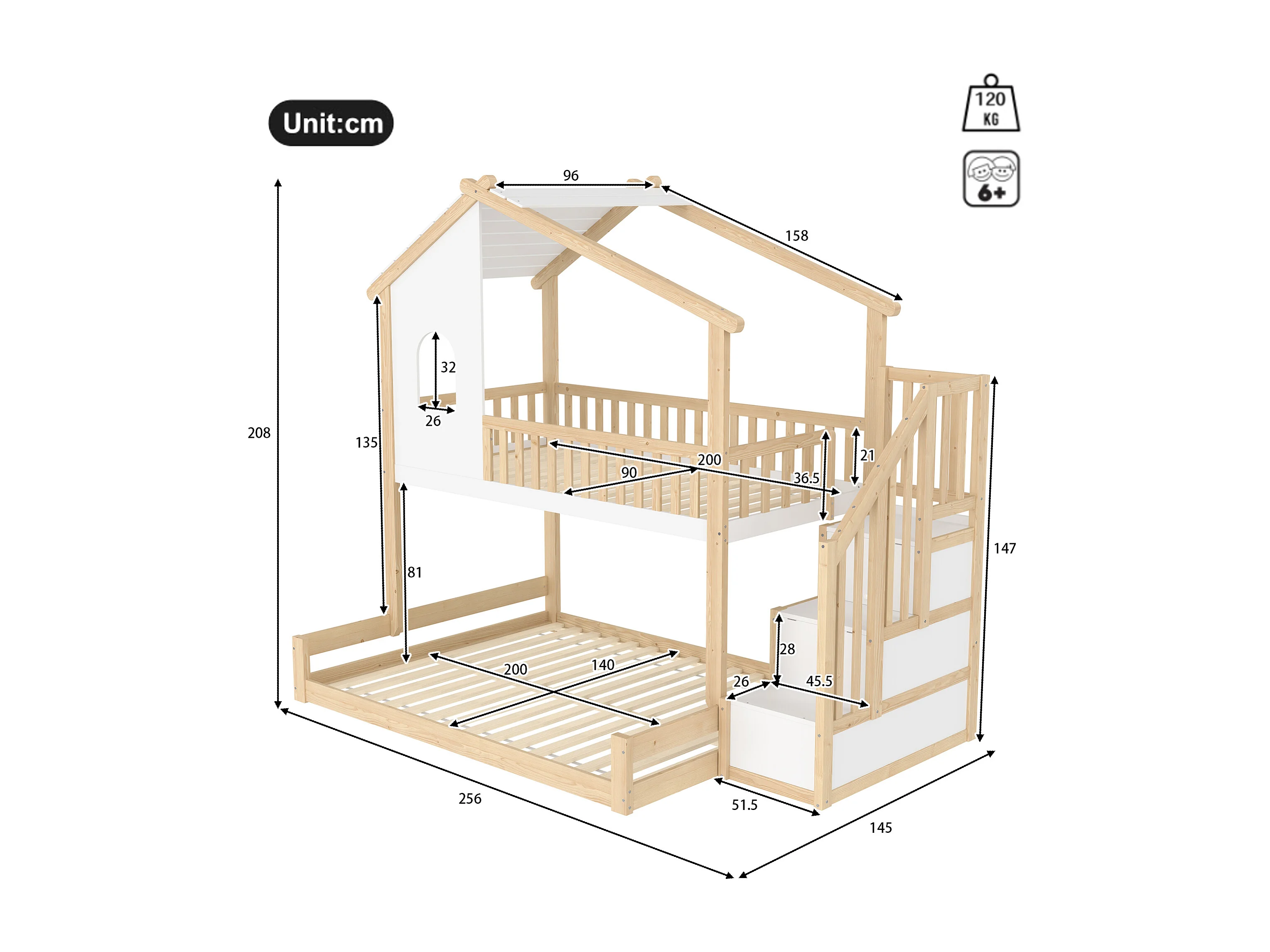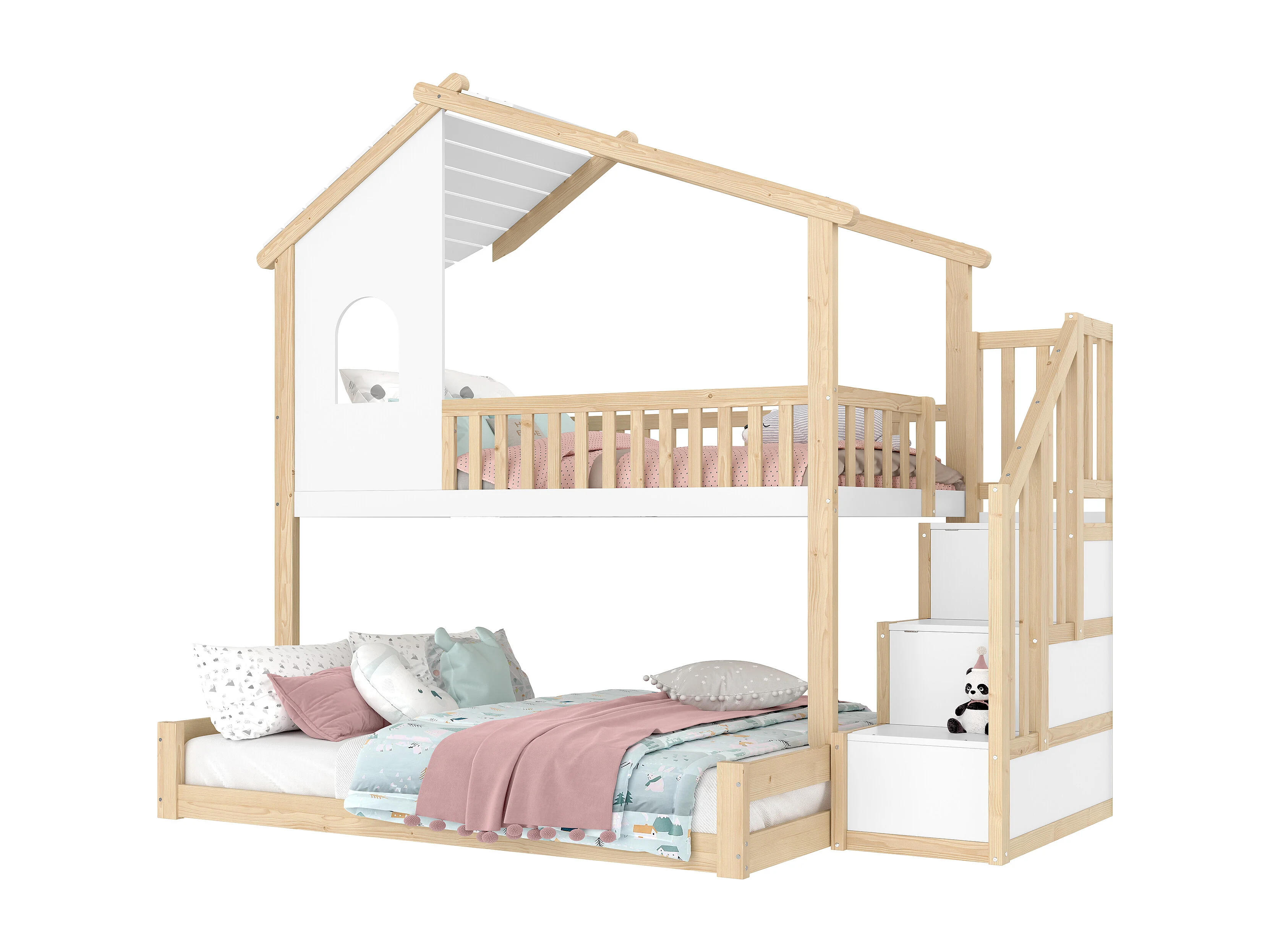 Lit superposé 90x200cm+140x200cm - Barrières de sécurité - Avec échelle de rangement - Naturel + Blanc (sans matelas)
