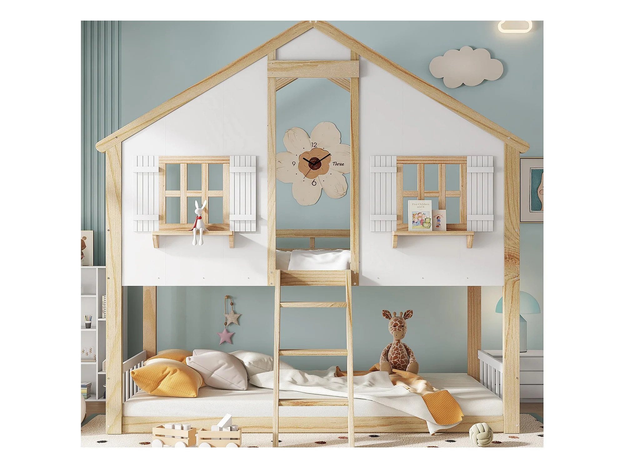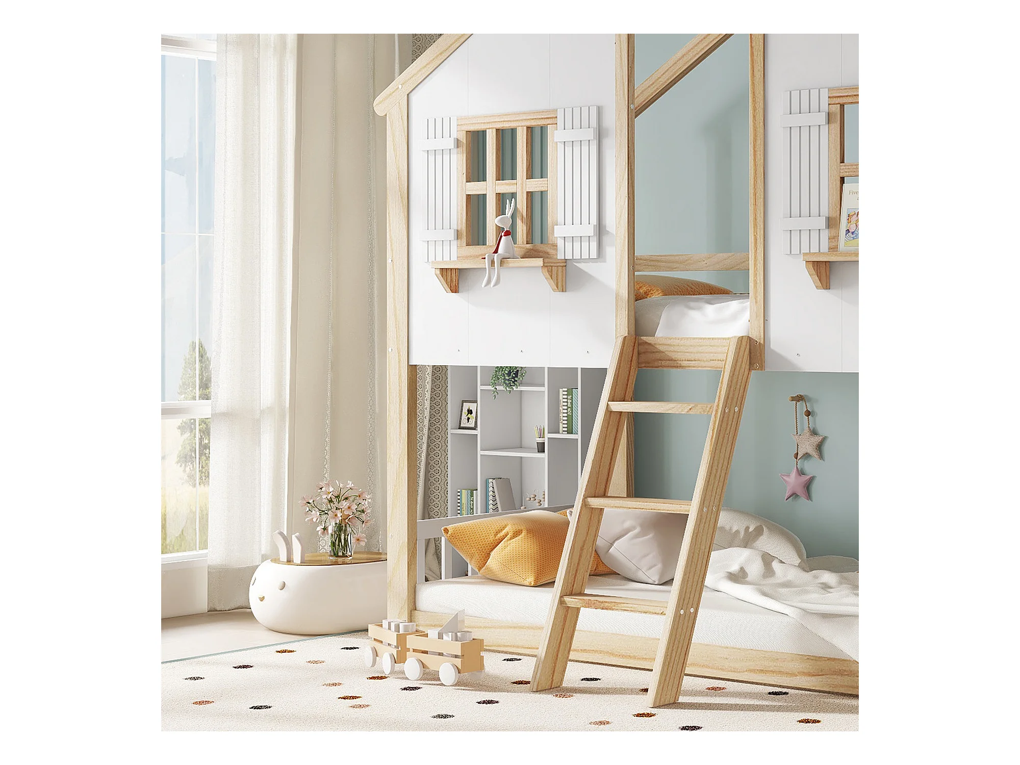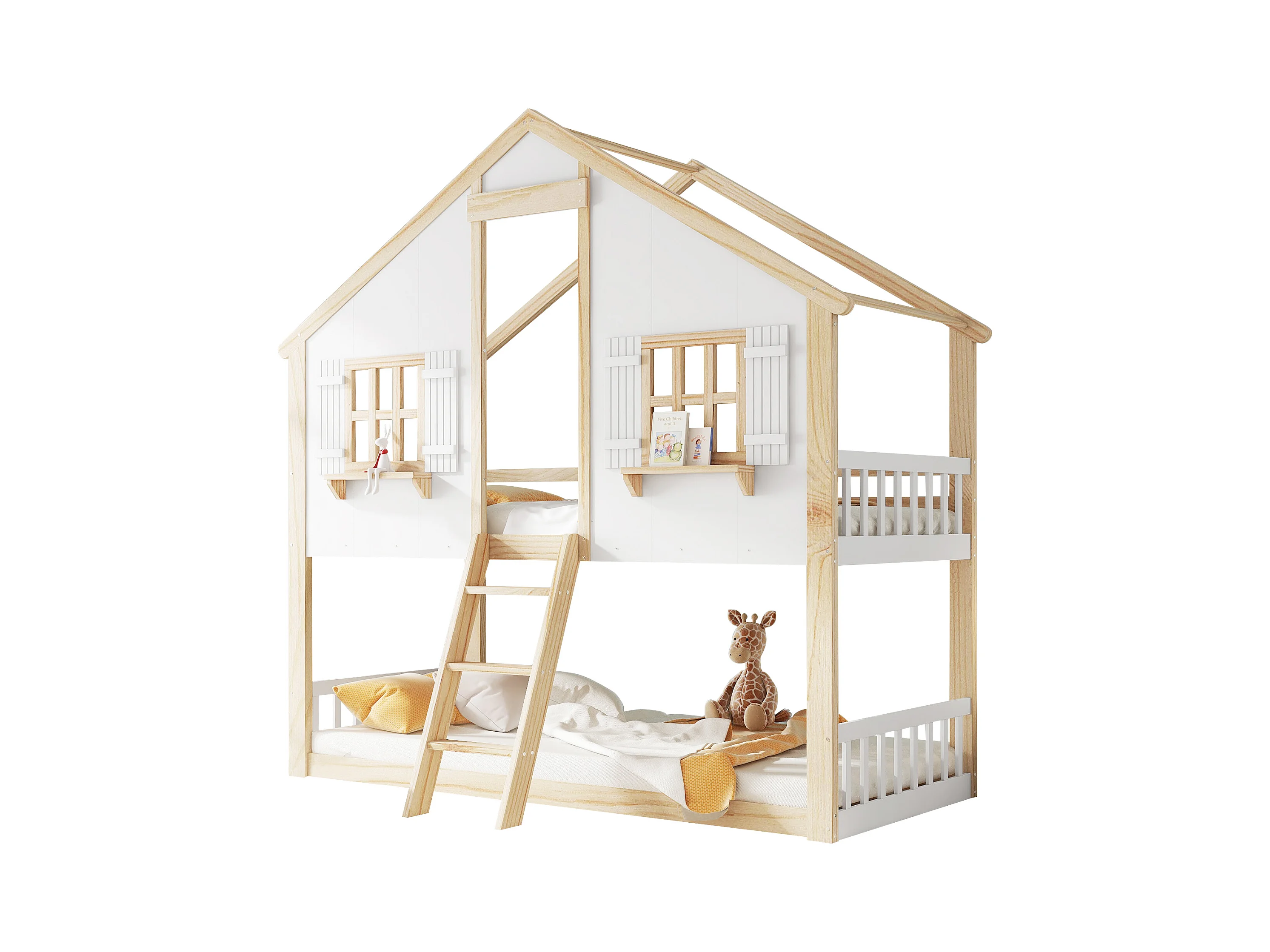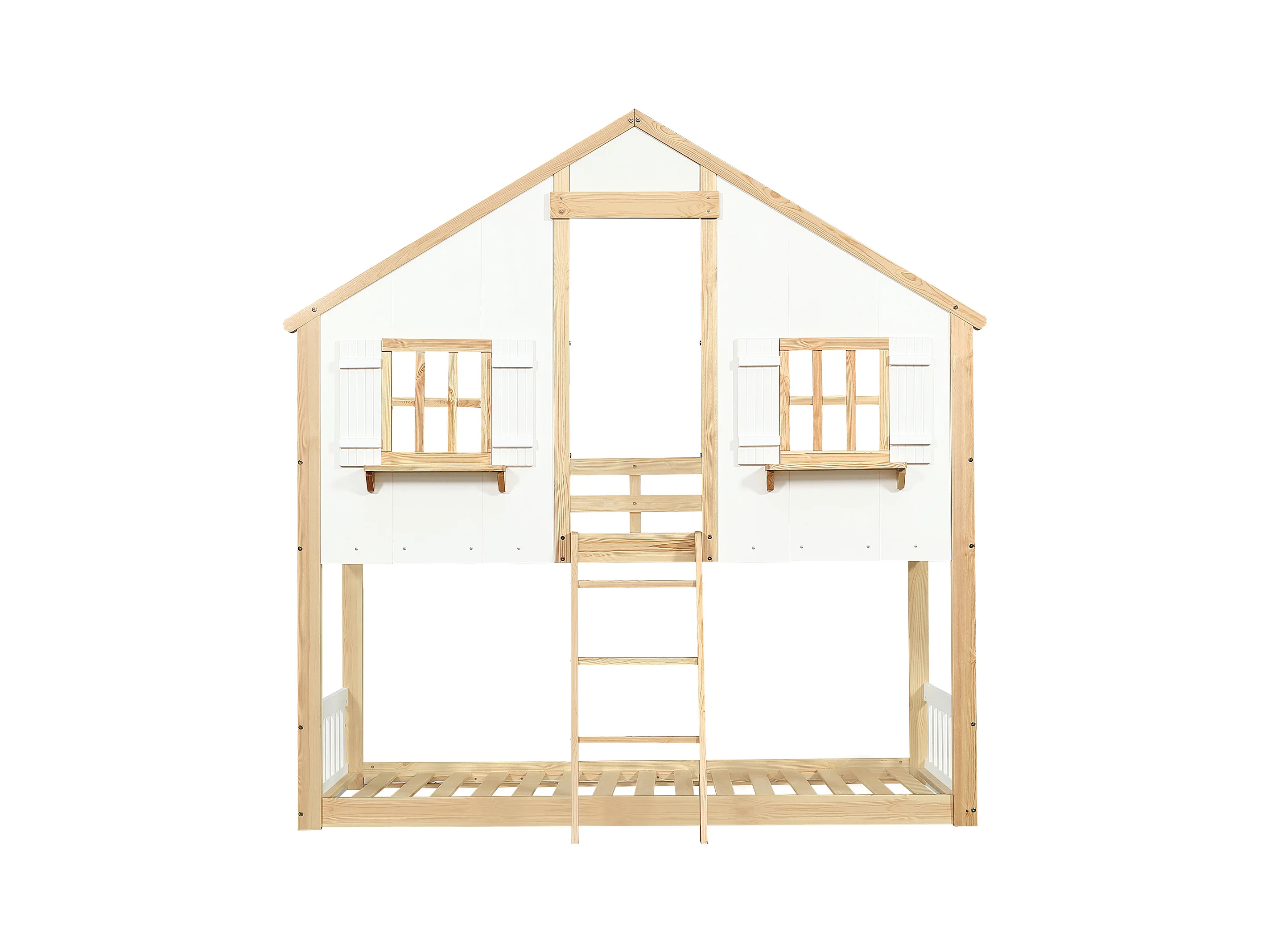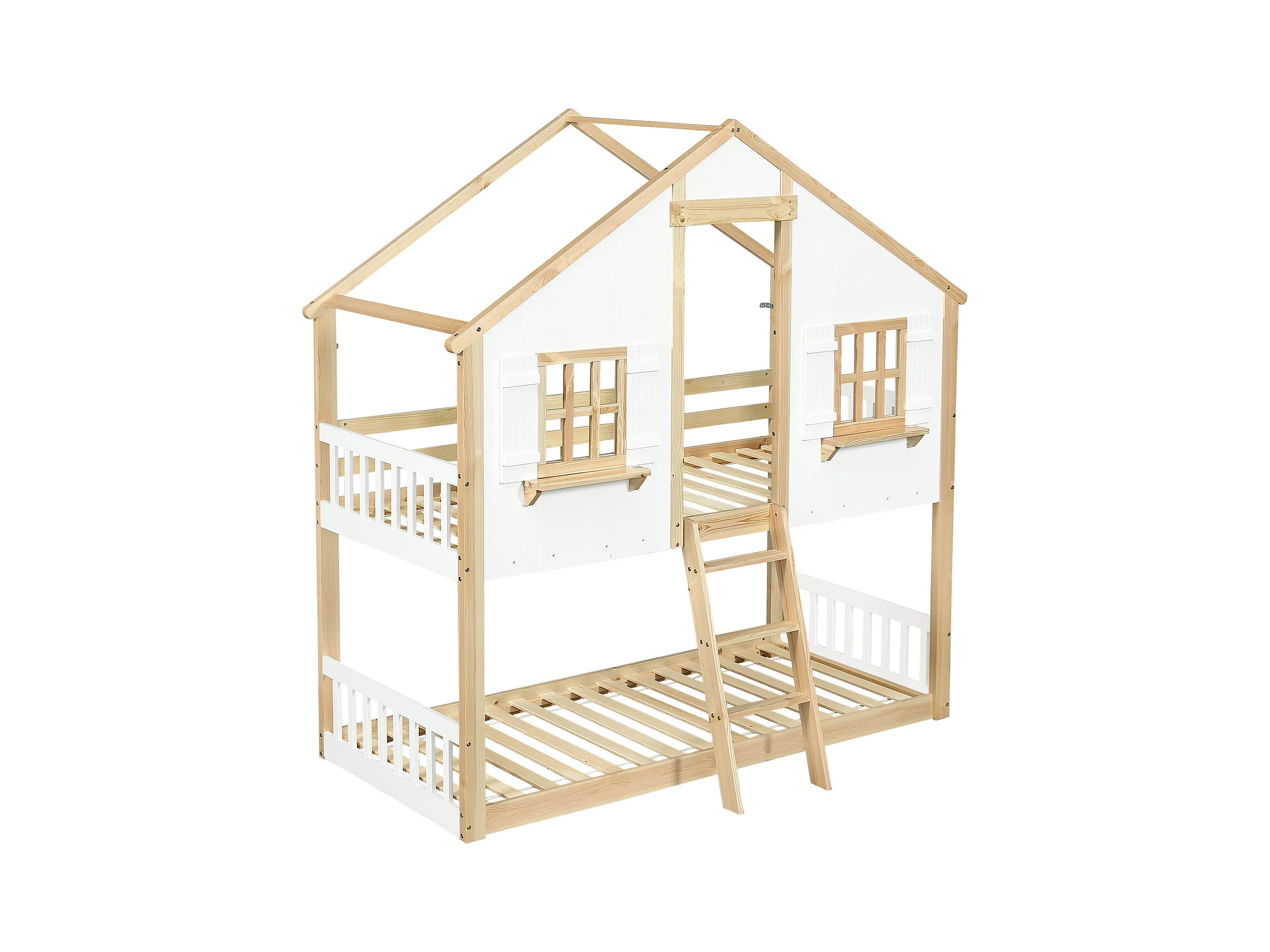 Lit superposé 90x200cm - avec échelle et garde-corps - avec des fenêtres et une forme de maison - Bois massif + MDF - Blanc + Naturel
