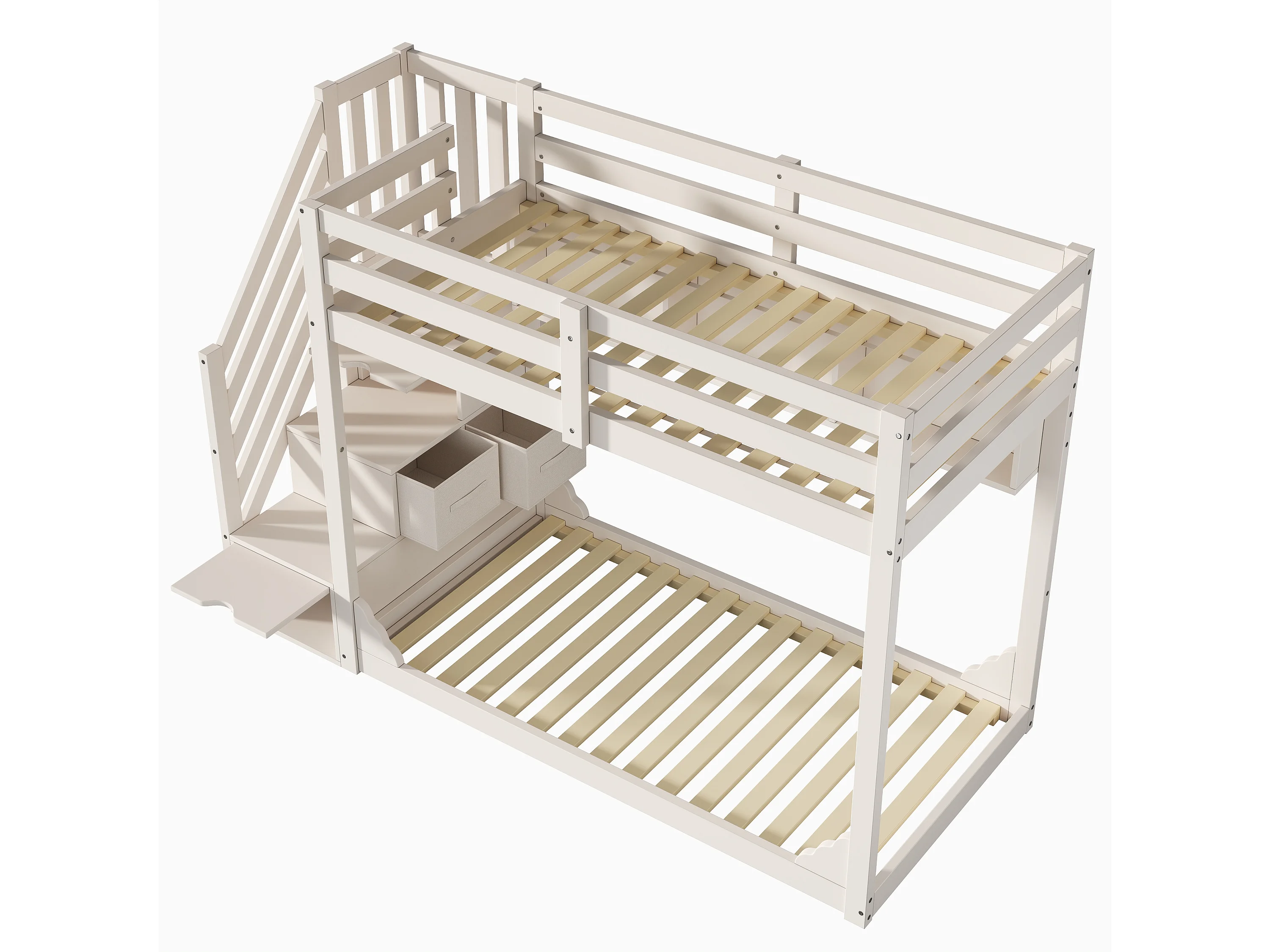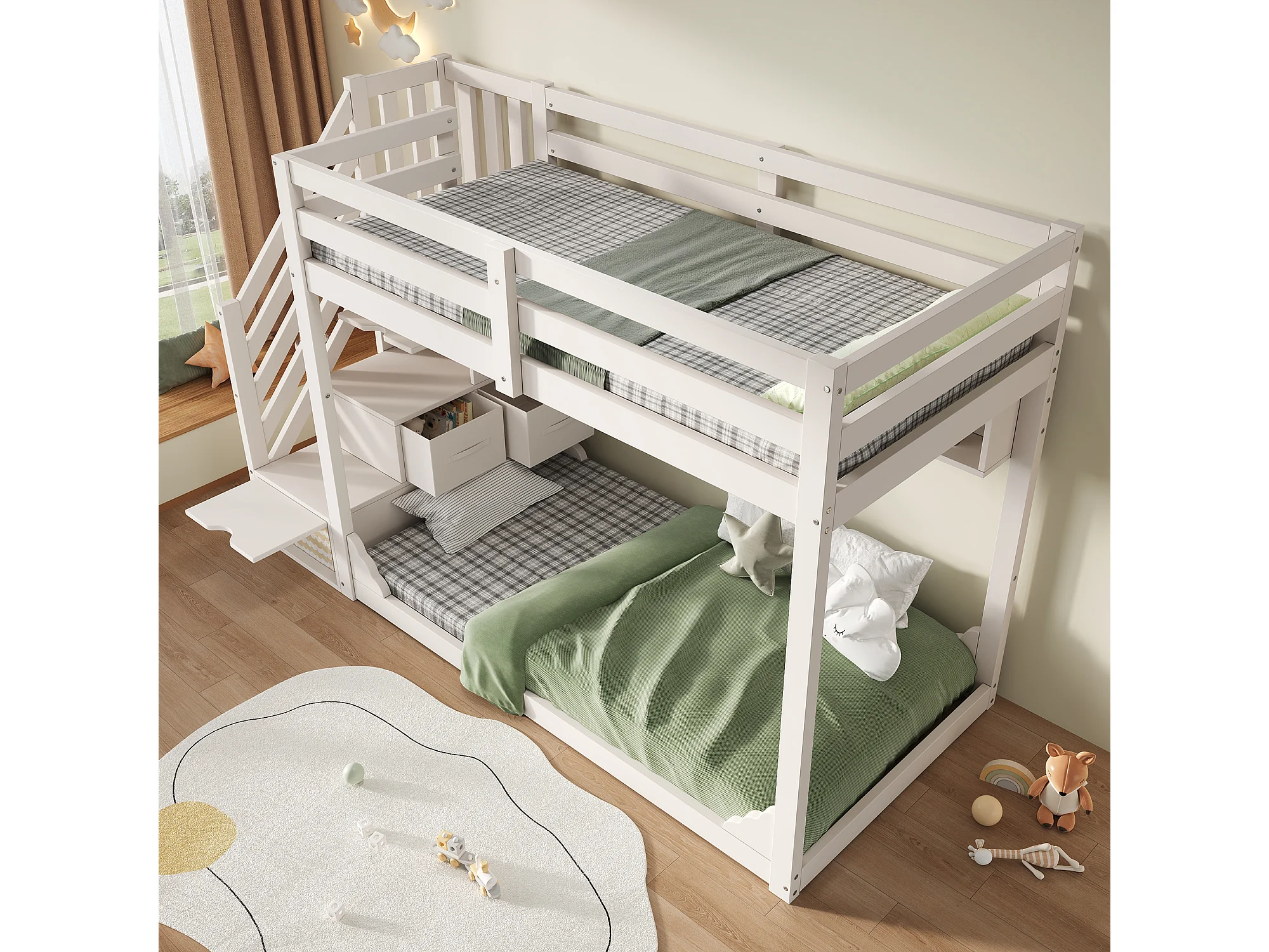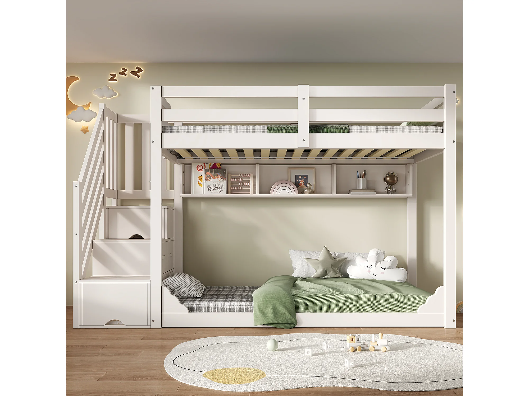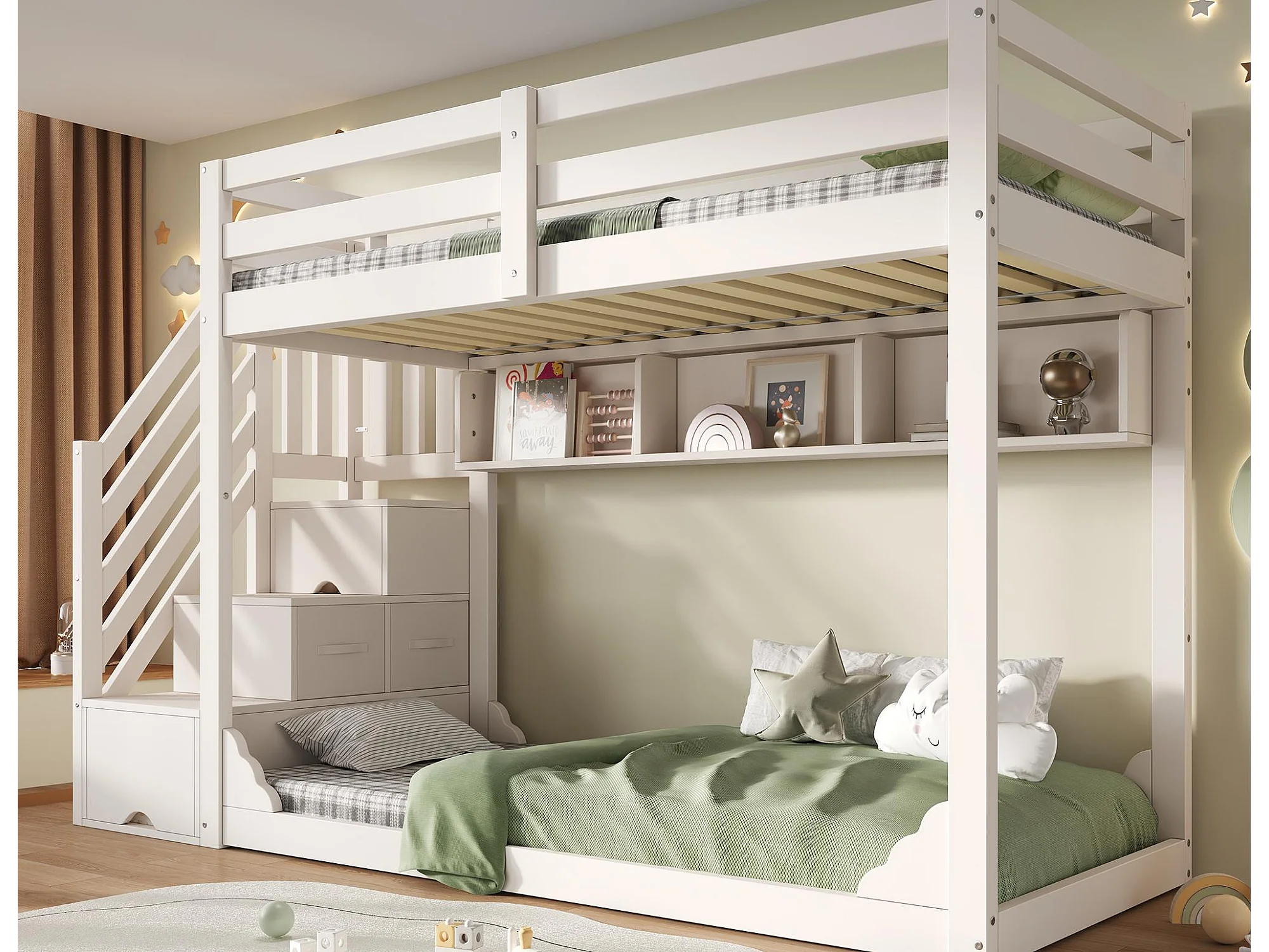 Lit superposé 90x200cm - avec escalier de rangement et étagères - avec 2 tiroirs - Bois massif + panneaux de particules - Blanc (sans matelas)