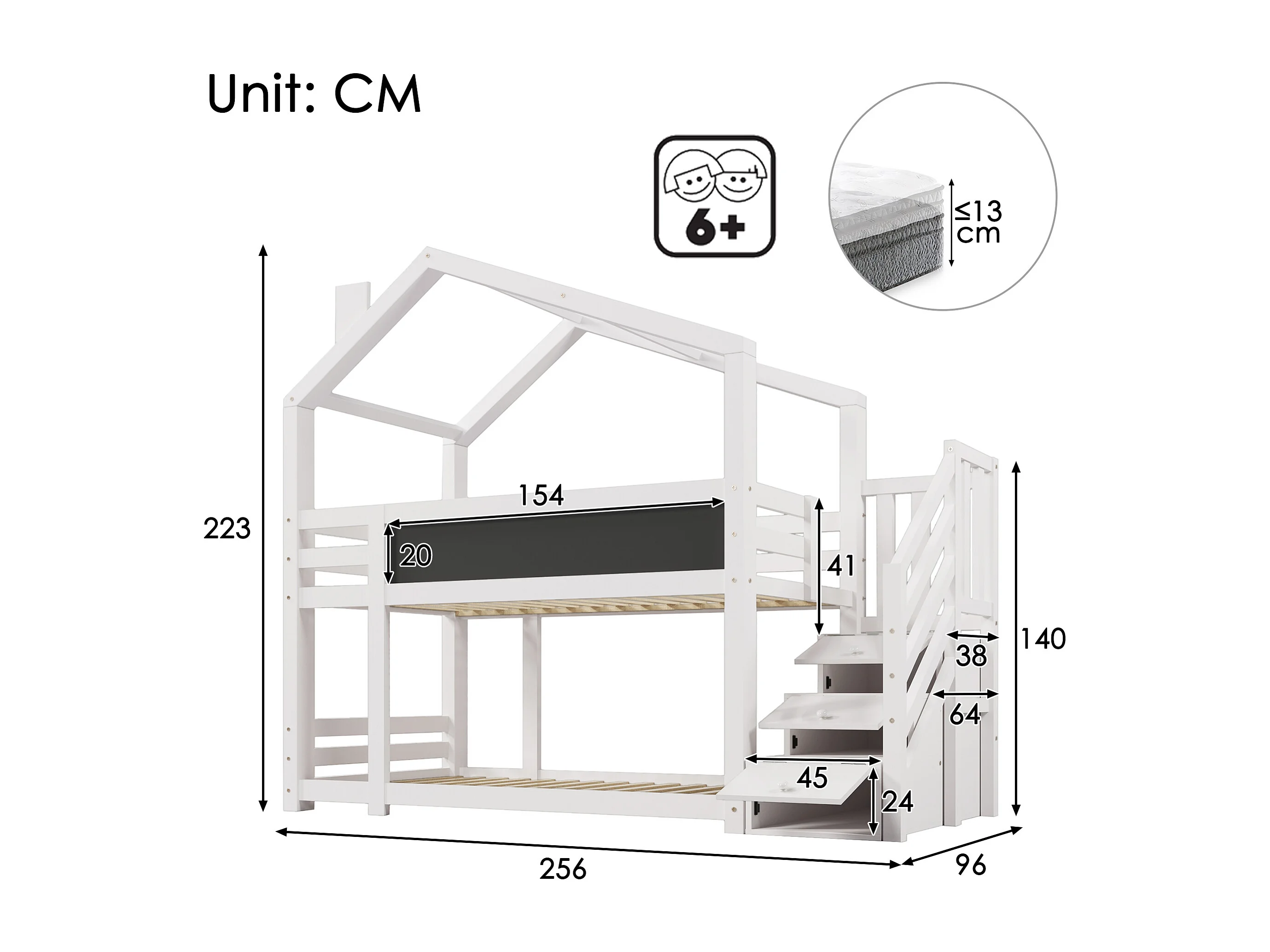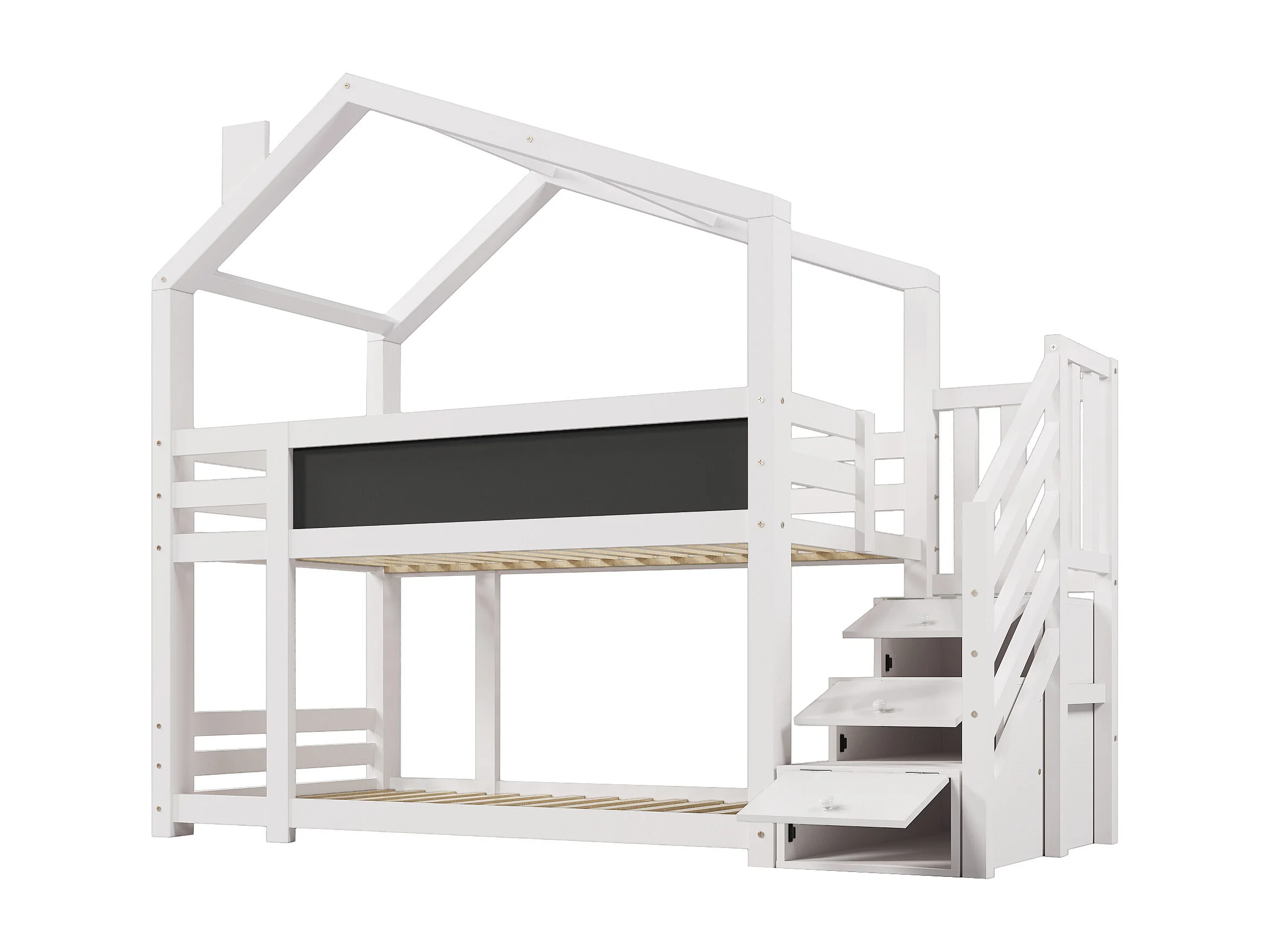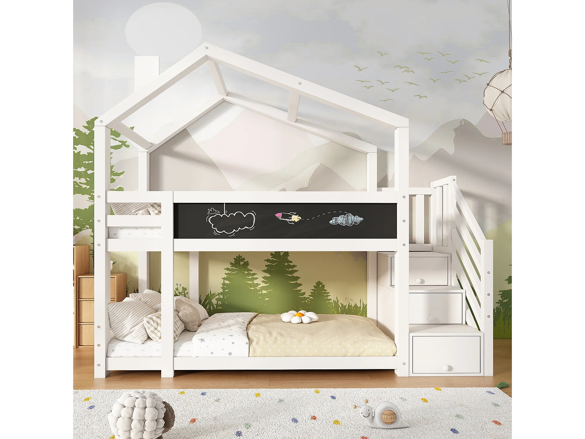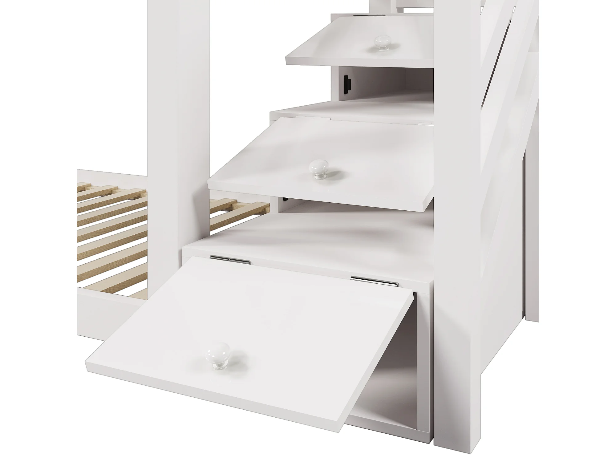 Lit superposé 90x200cm Escalier sécurisé poignées larges coffre de rangement Bois massif et MDF Blanc (Sans matelas)