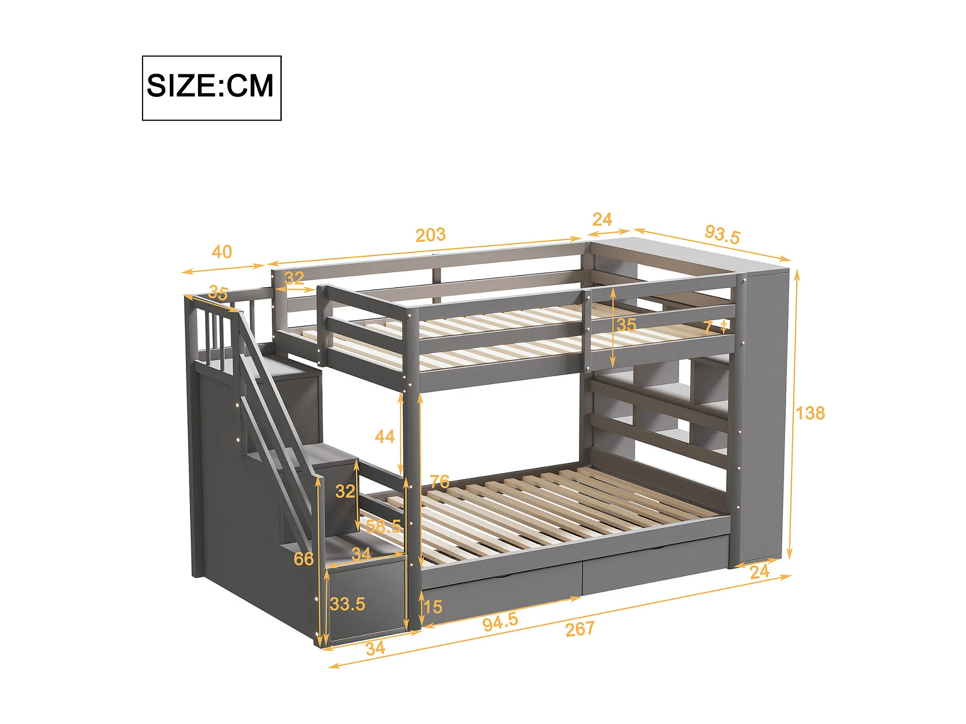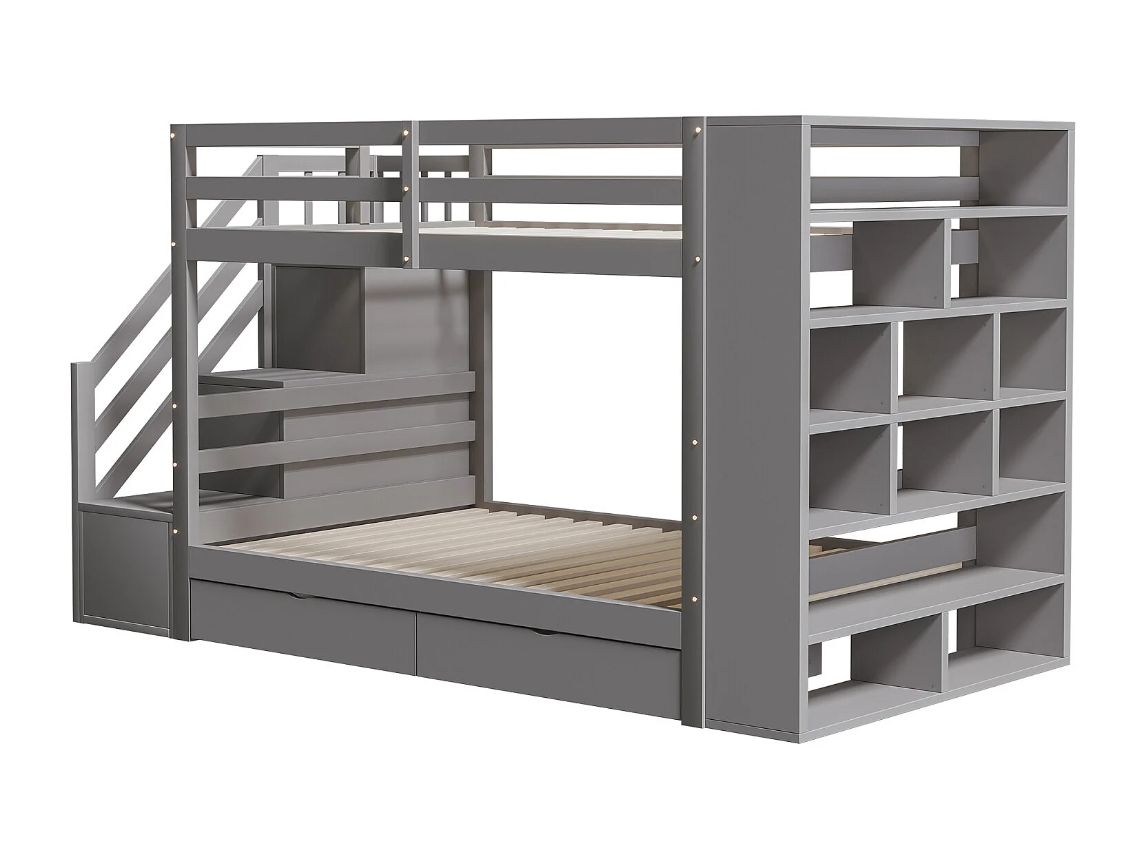 Lit superposé 90x200cm - lit enfant avec 2x sommier à lattes, escalier avec rangement, 2 tiroirs et grands casiers - lit en pin Gris