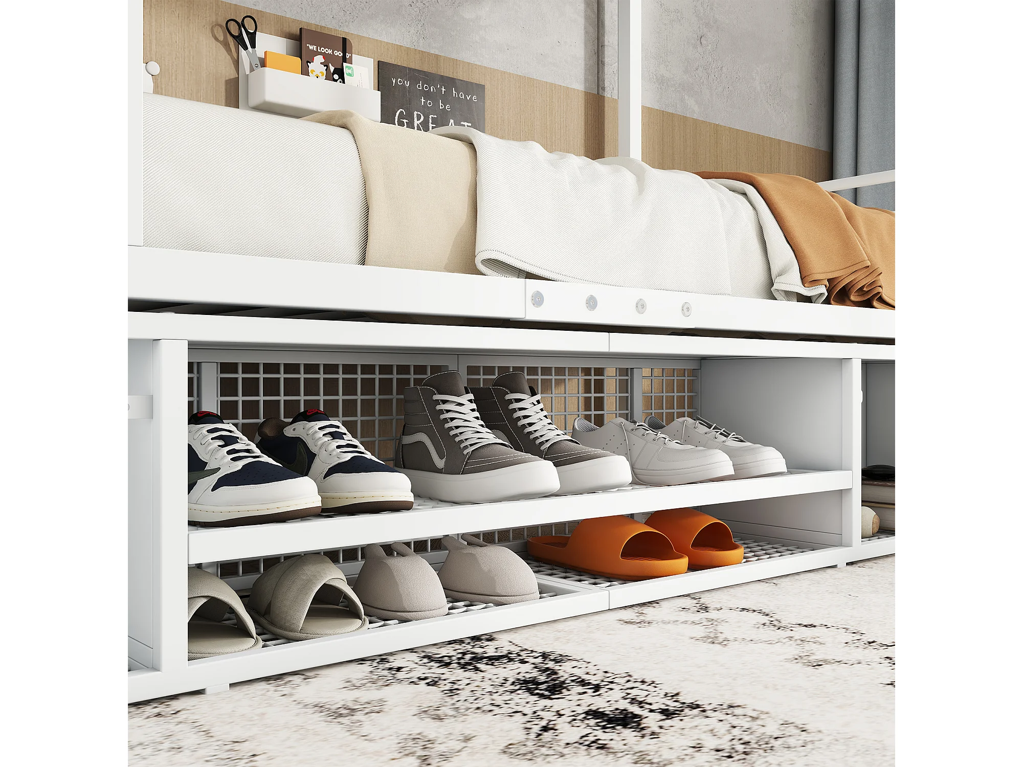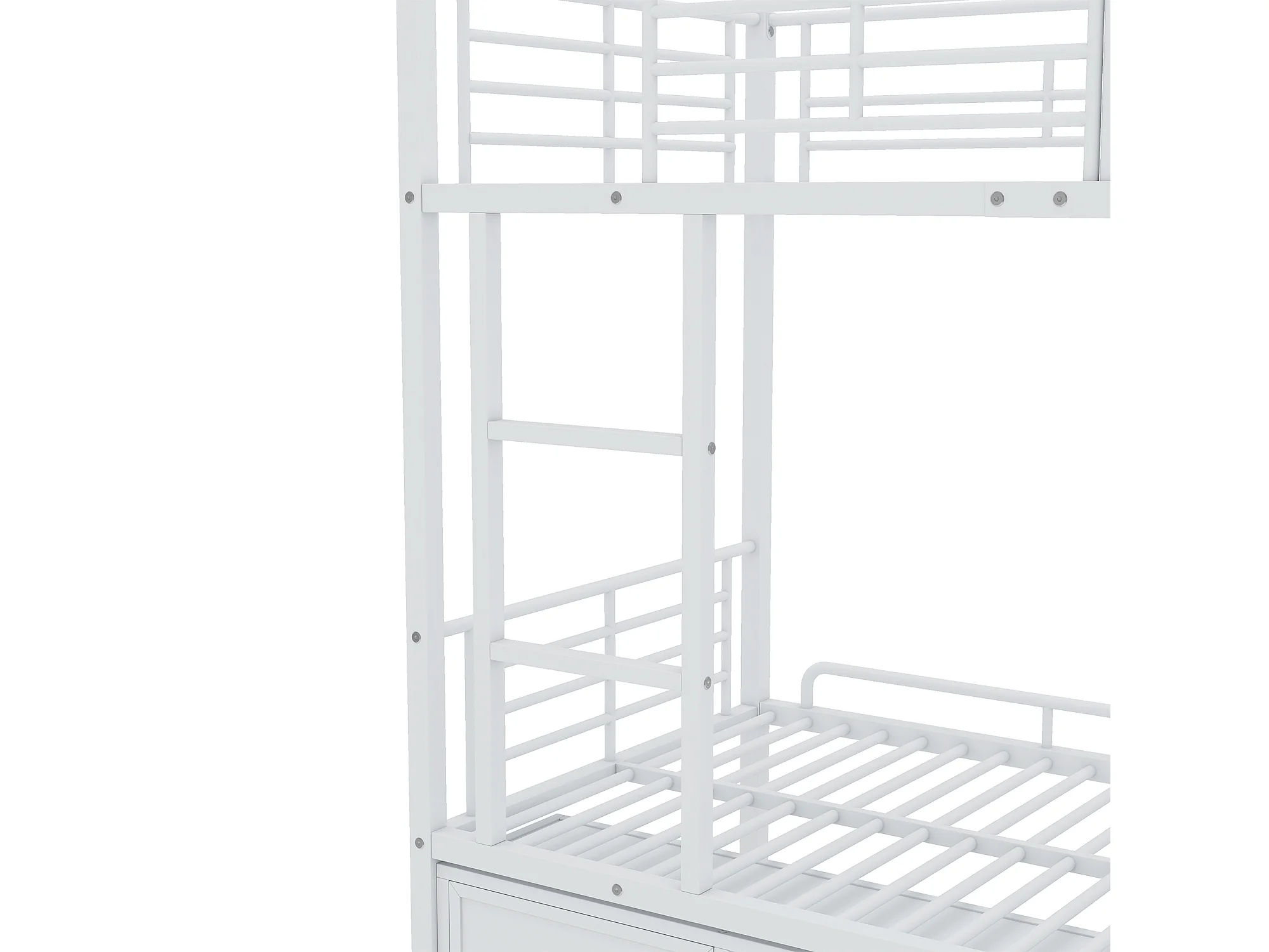 Lit superposé 90x200cm deux couchages séparés, rangement sous-lit et escalier sécurisé métal blanc Sans matelas