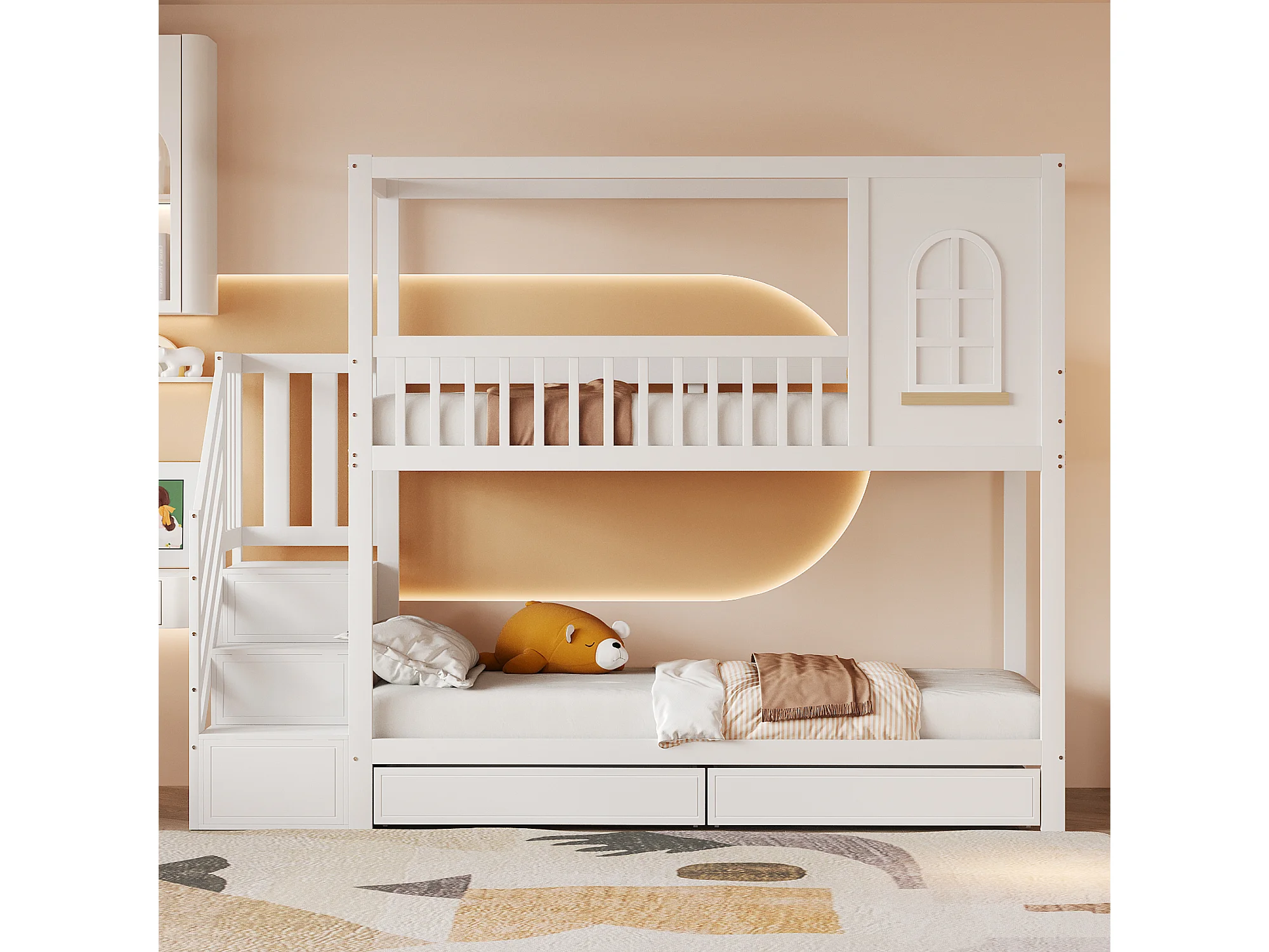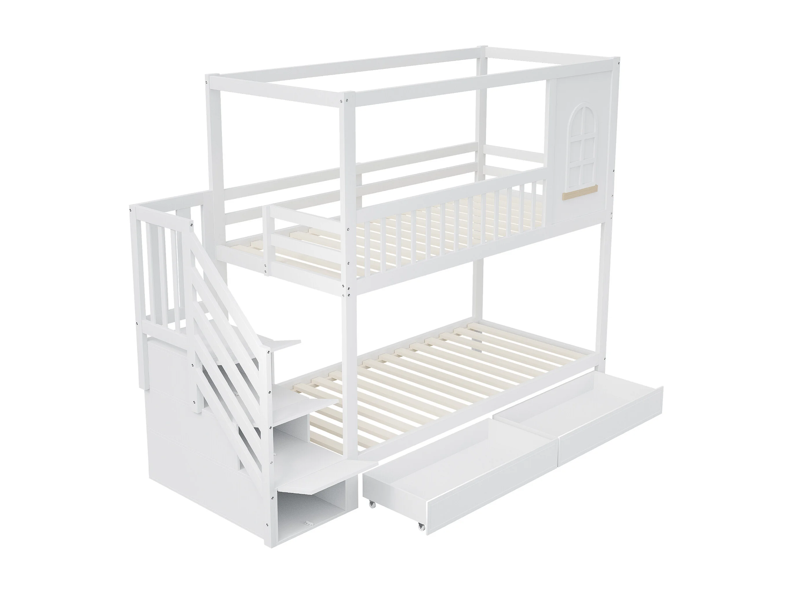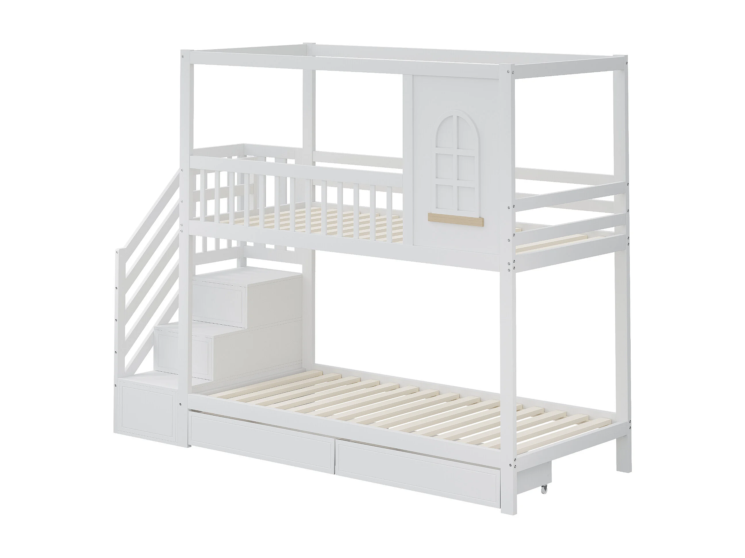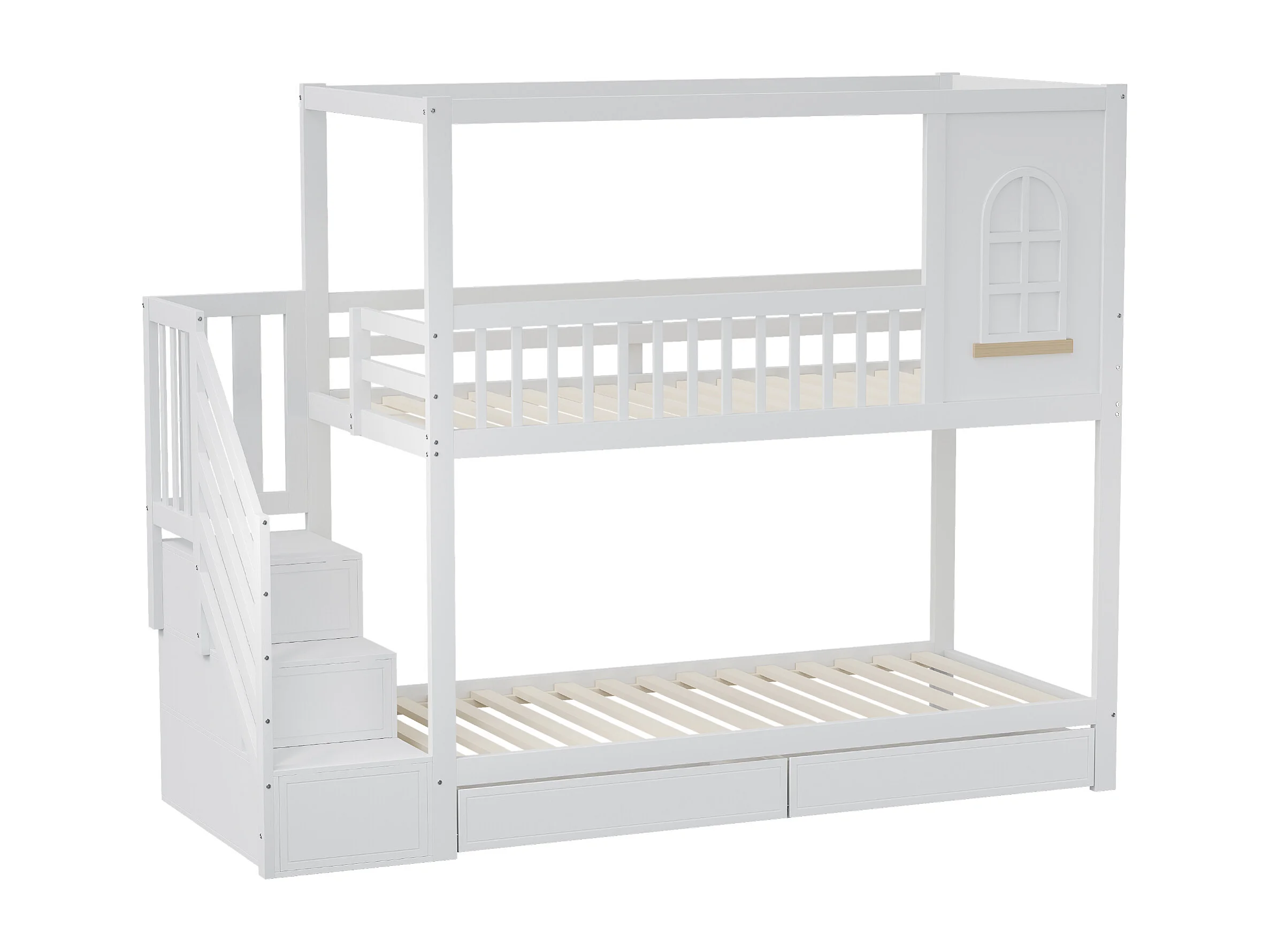 Lit superposé enfant 90x200 cm avec échelle et tiroirs de rangement, avec barrières de sécurité, en bois, blanc (Sans matelas)