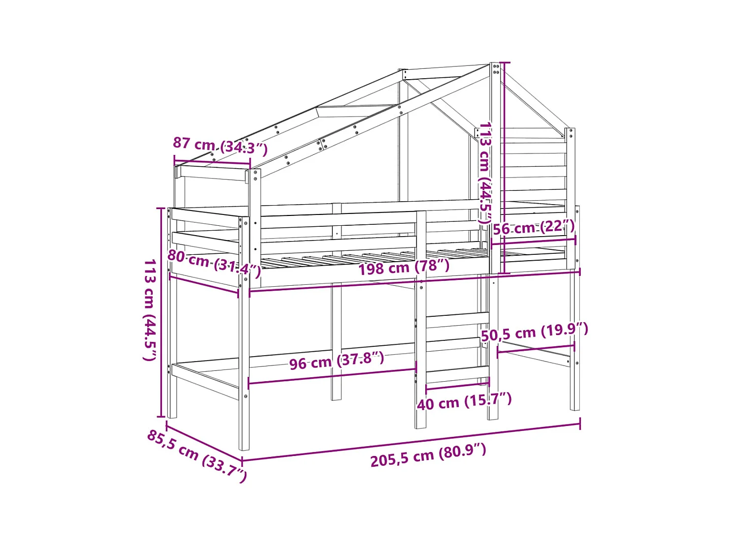 Lit superposé avec échelle et toit sans matelas 80x200 cm