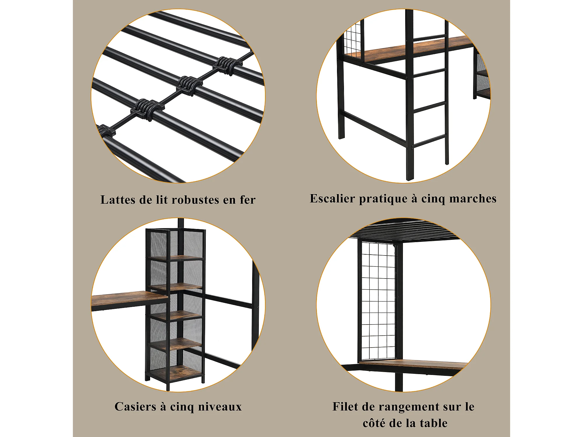 Lit superposé avec étagères, bureau et rideau, cadre en métal et MDF, Noir + Bois foncé (204x95x230 cm)