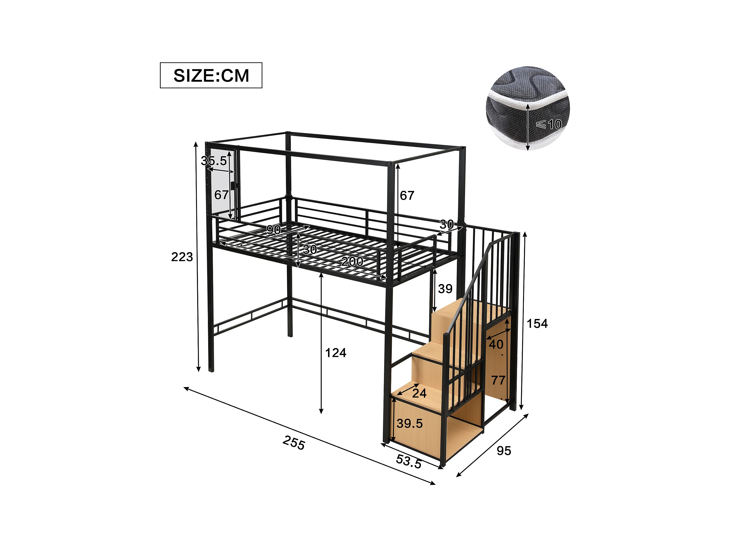 Lit superposé avec fenêtre acrylique magnétique, escalier avec penderie et étagères, cadre en métal et MDF, Noir + Naturel (255x95x223 cm)