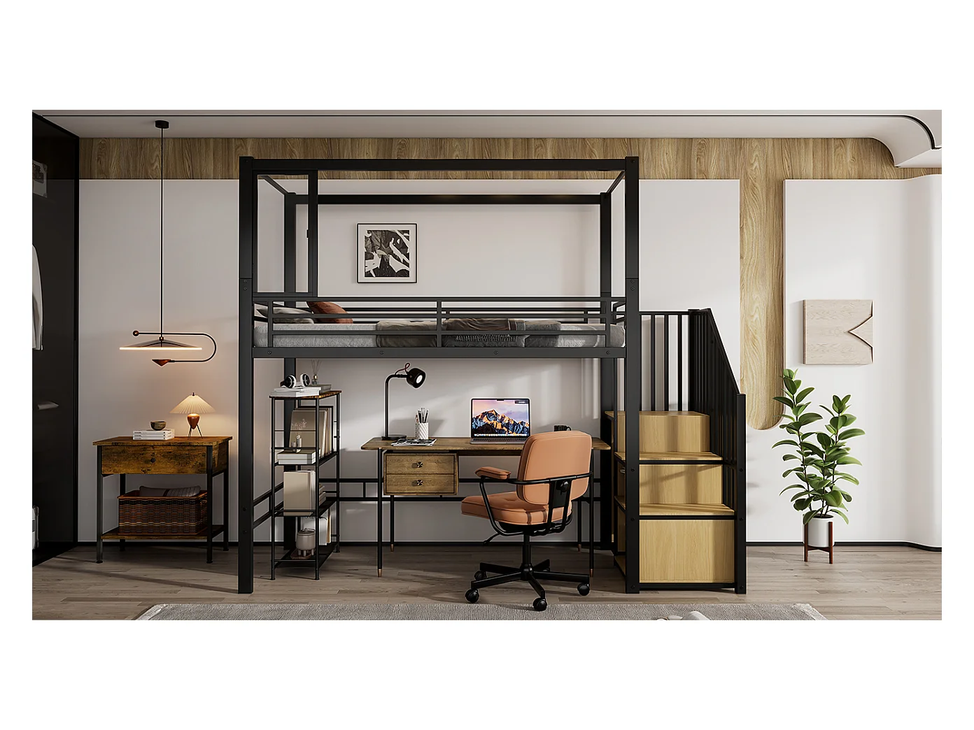 Lit superposé en métal avec table et armoire, étagères et 4 étages, noir et bois foncé, 90x200 cm