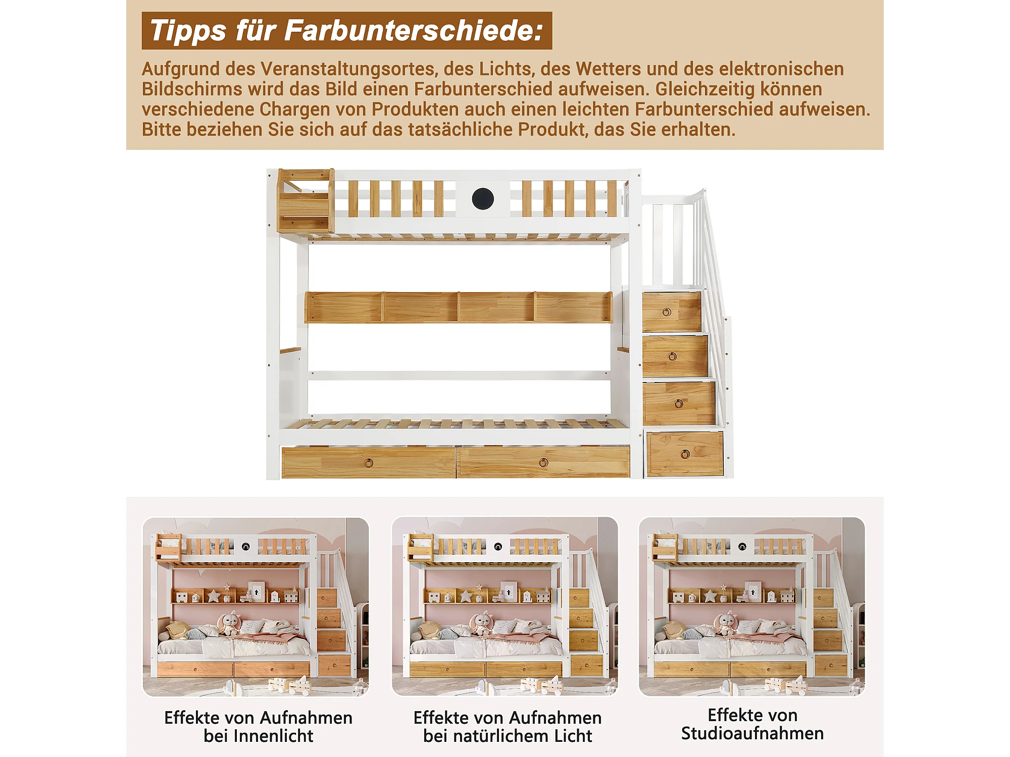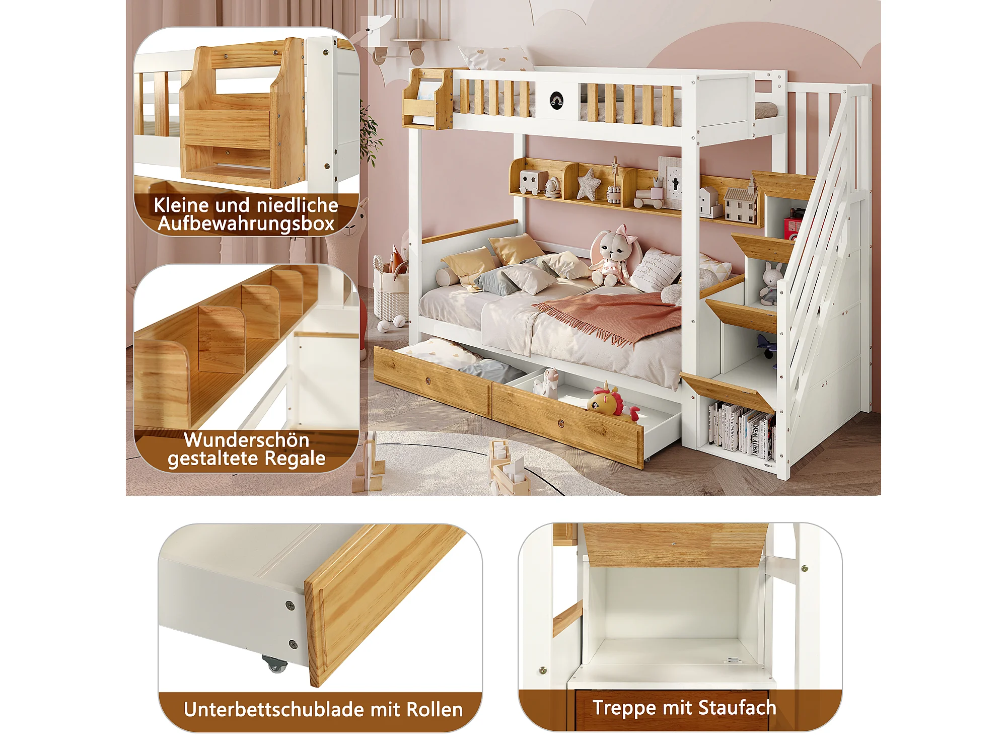 Lit superposé avec rangement, échelle, garde-corps, 4 compartiments rangement, pin massif + MDF, blanc + naturel (254x128.5x148 cm)