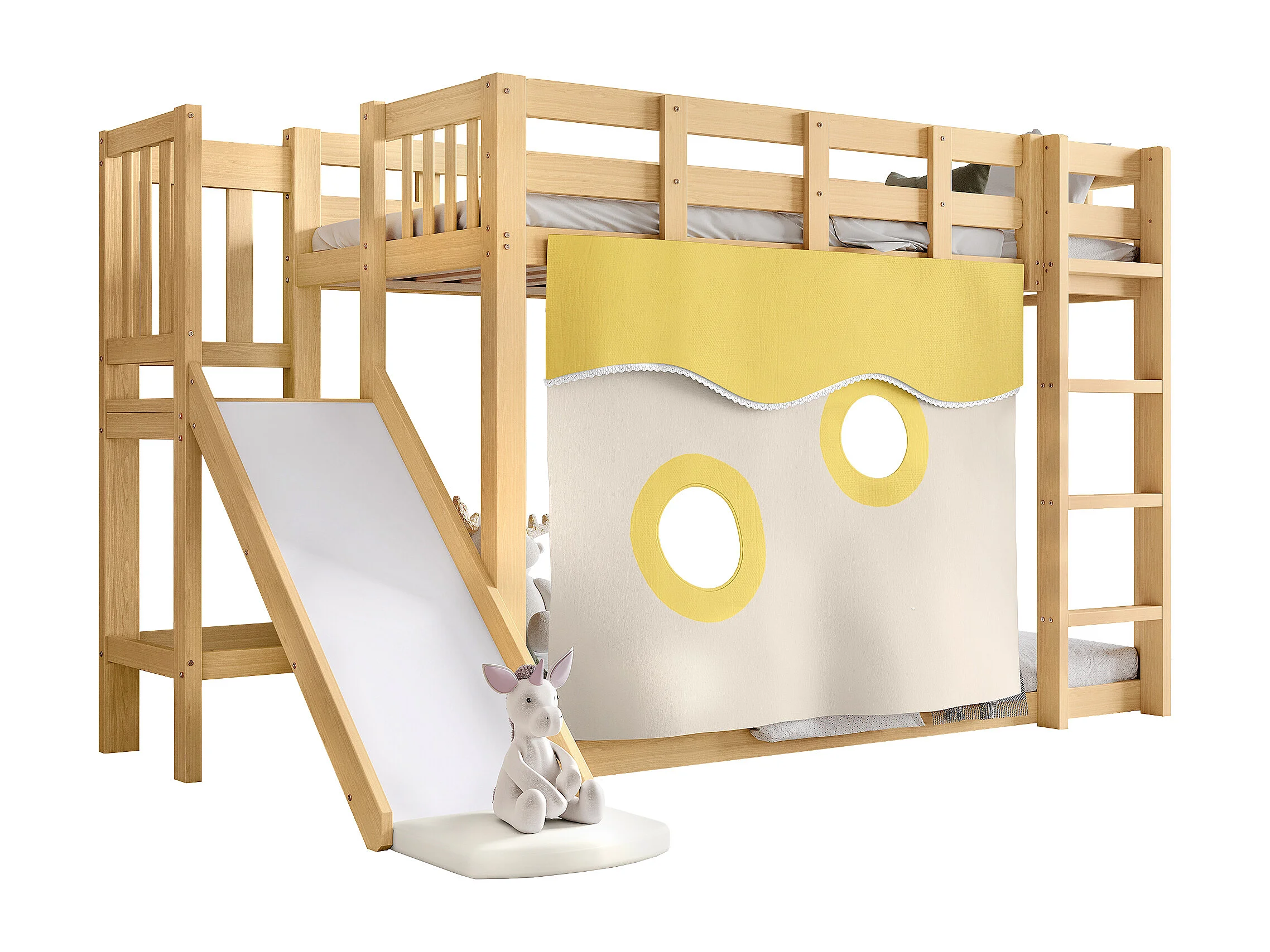 Lit superposé 90x200cm - avec échelle et rambarde - avec rideaux de lit et toboggan - MDF + bois massif - Naturel