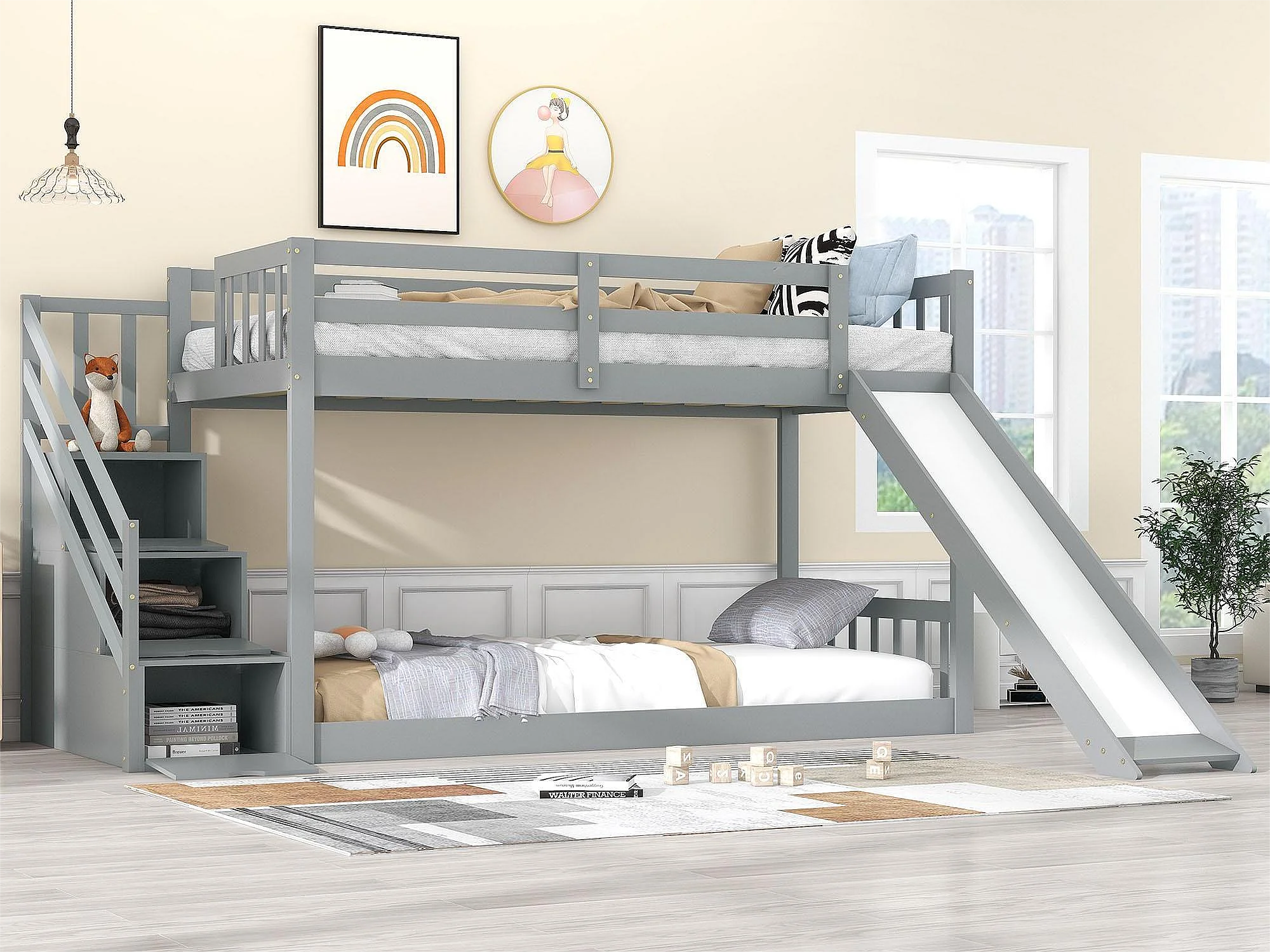 Lit superposé avec tiroirs et toboggan - 2 x 90 x 200 cm - bois massif et MDF - coloris: gris