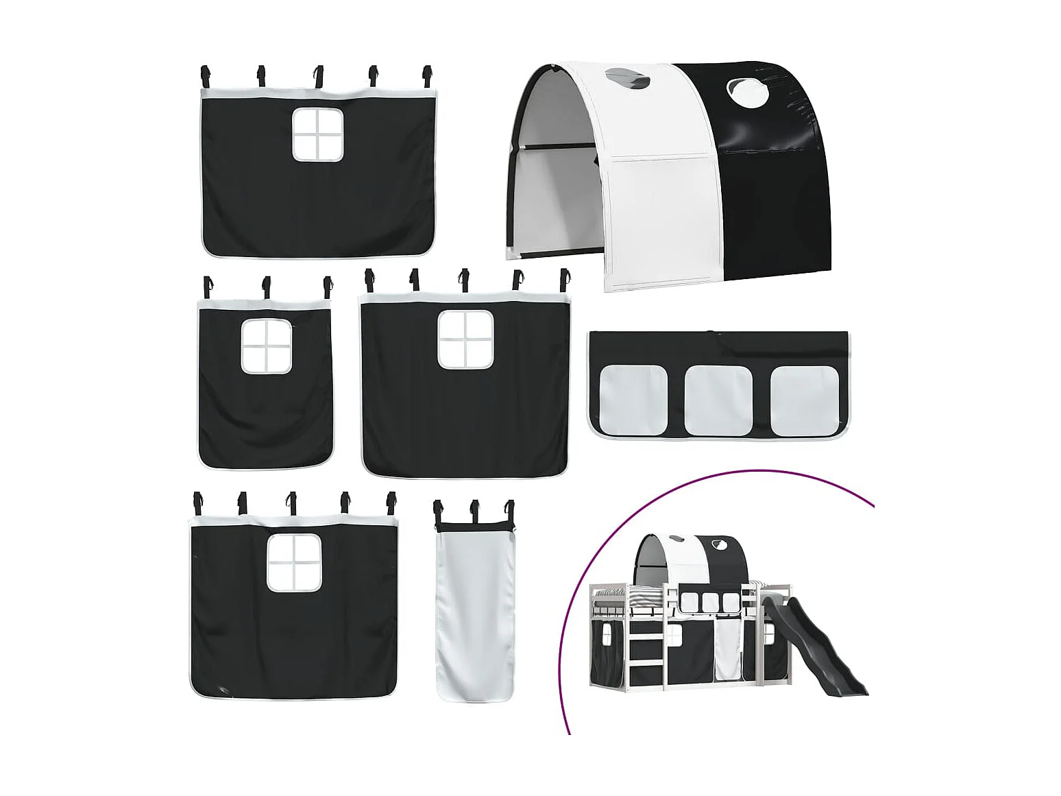 Lit superposé avec toboggan et rideaux blanc et noir 80x200 cm FR17390