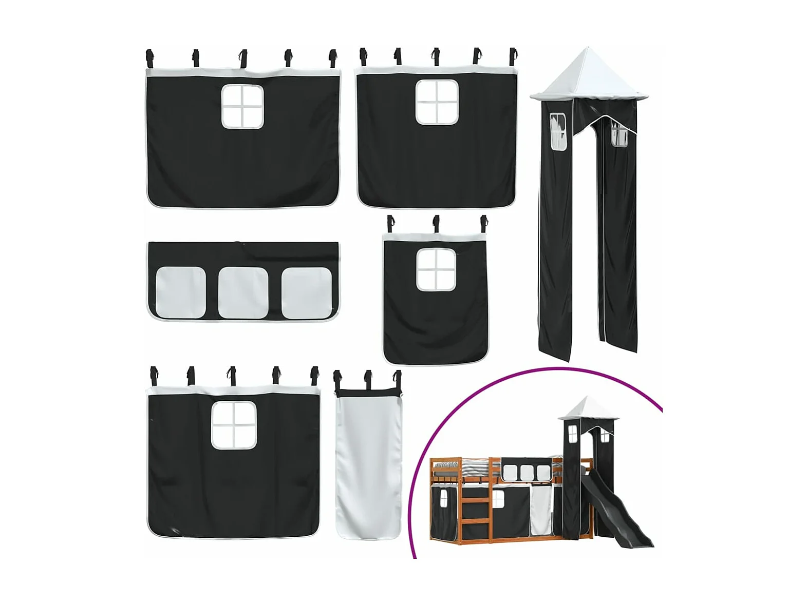 Lit superposé avec toboggan et rideaux blanc et noir 90x200 cm FR24777