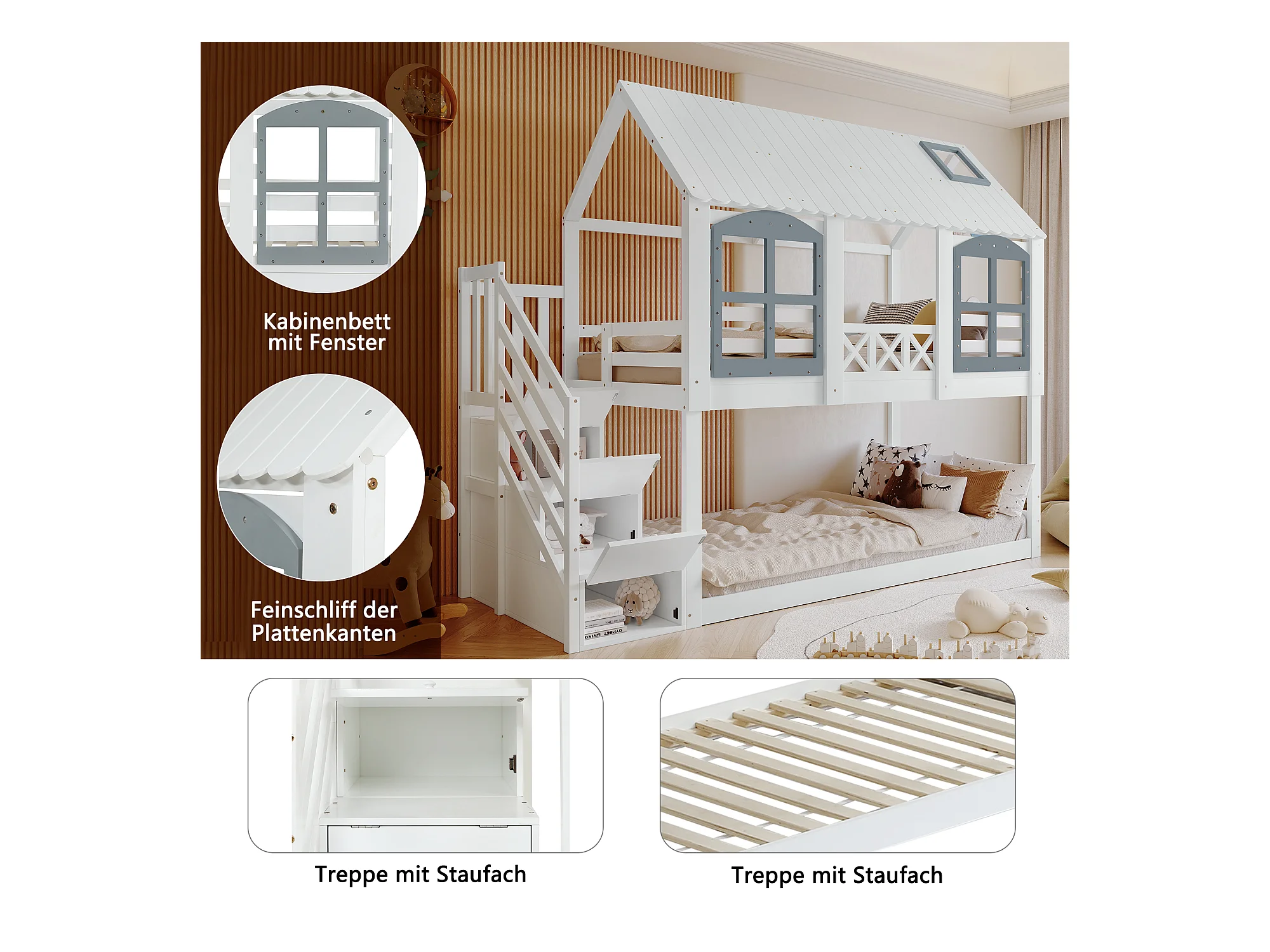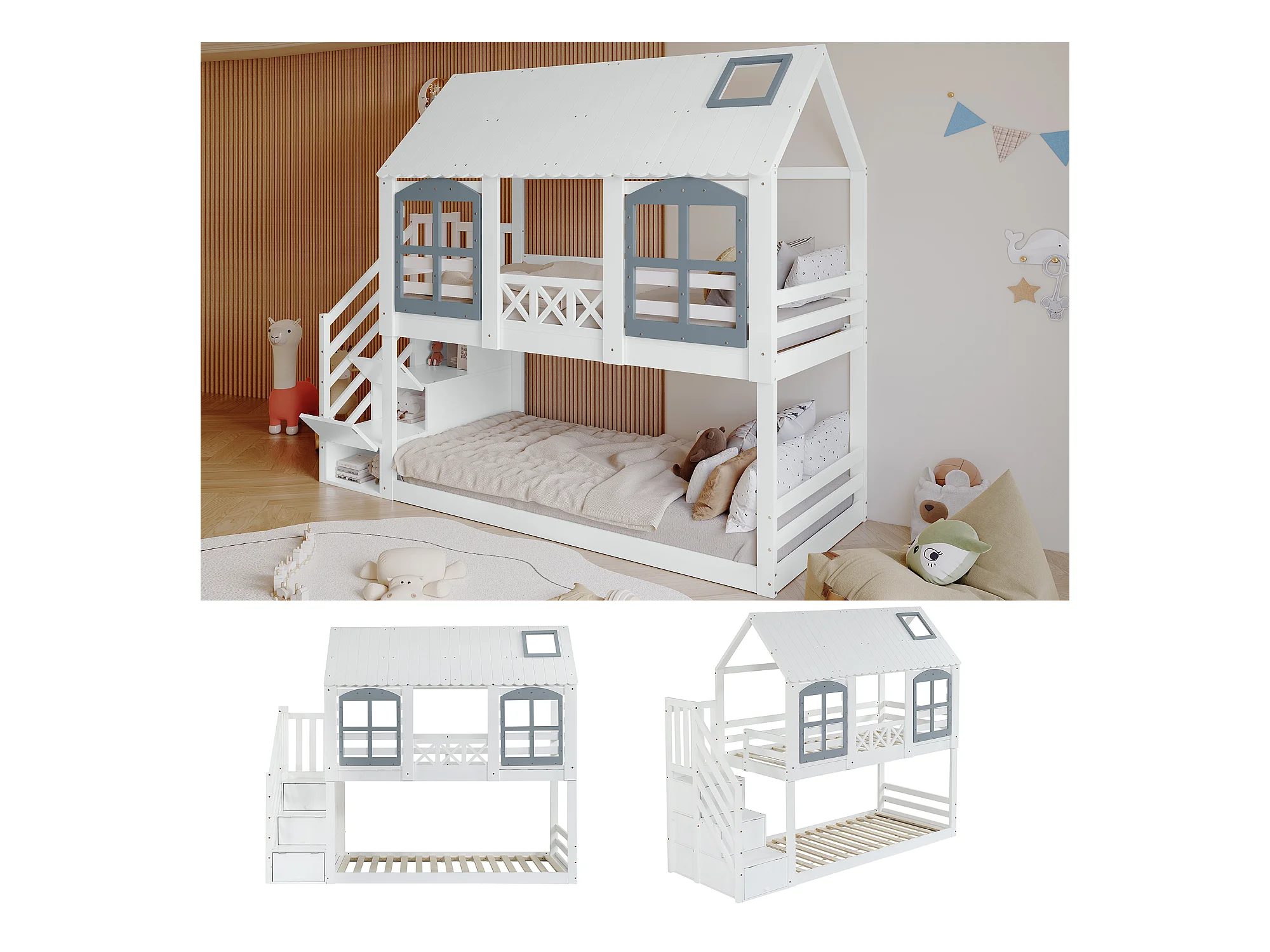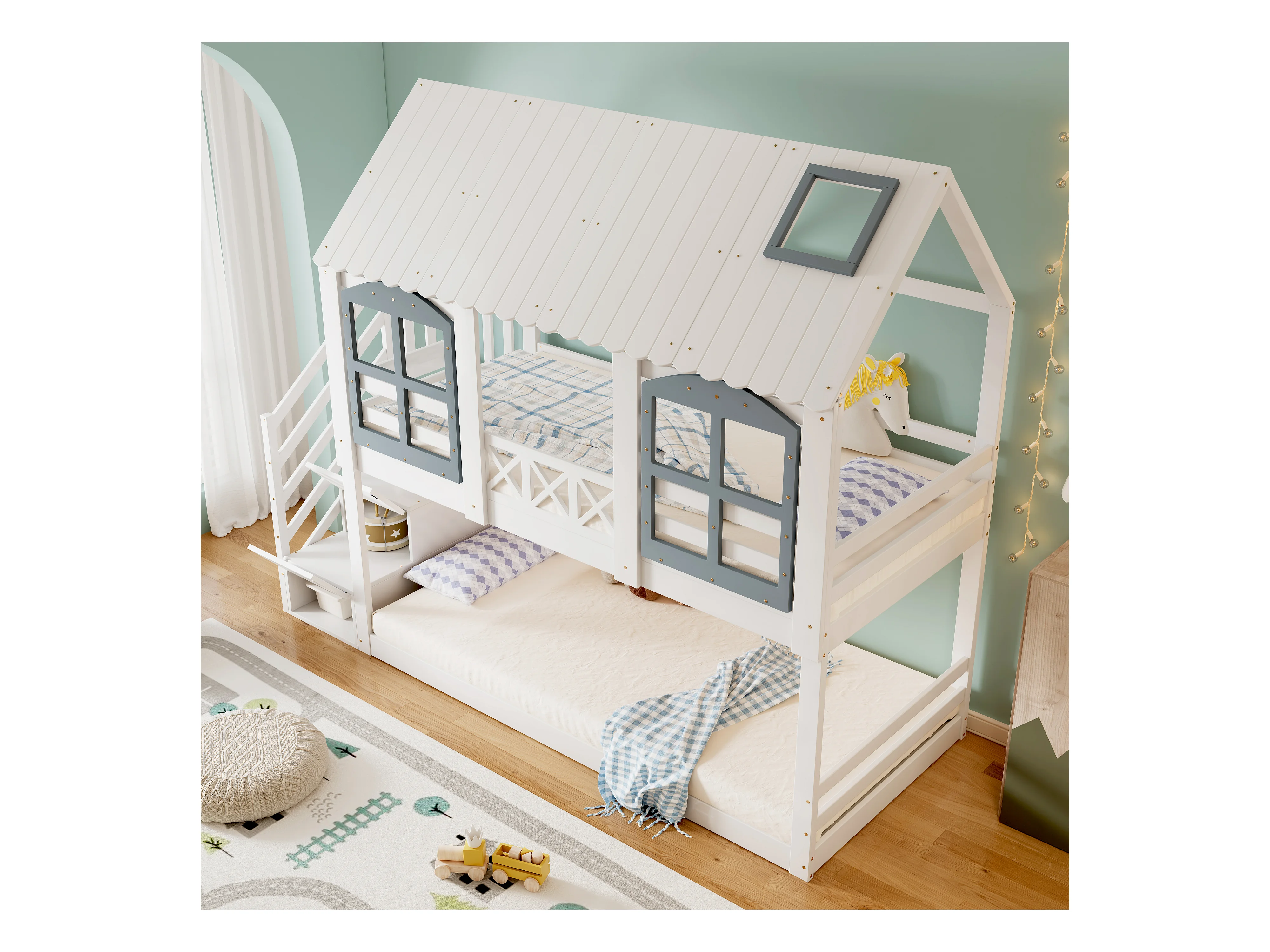 Lit superposé pour enfants avec rangement, toit et fenêtres, bois massif et MDF, blanc et naturel, 90x200 cm