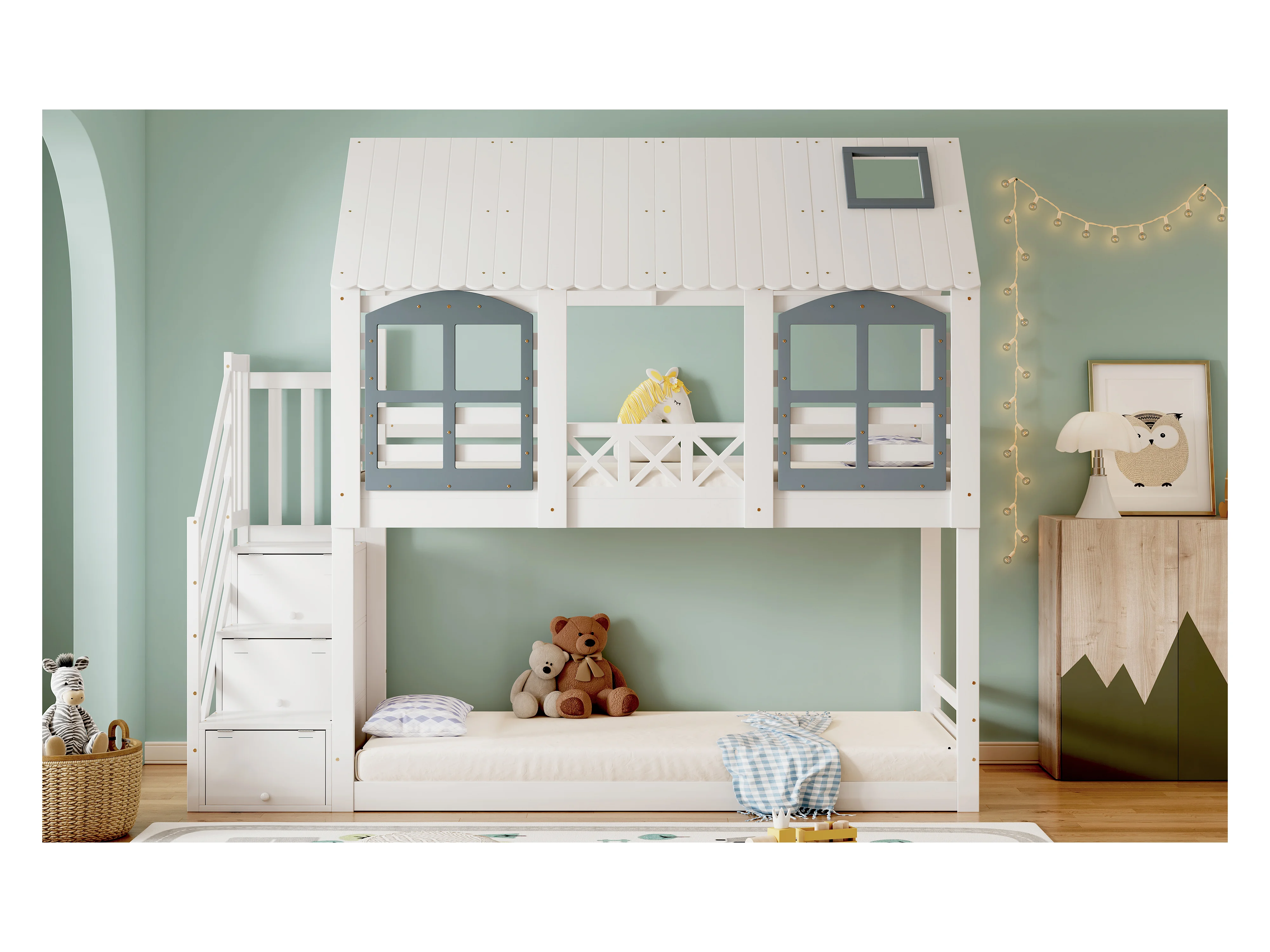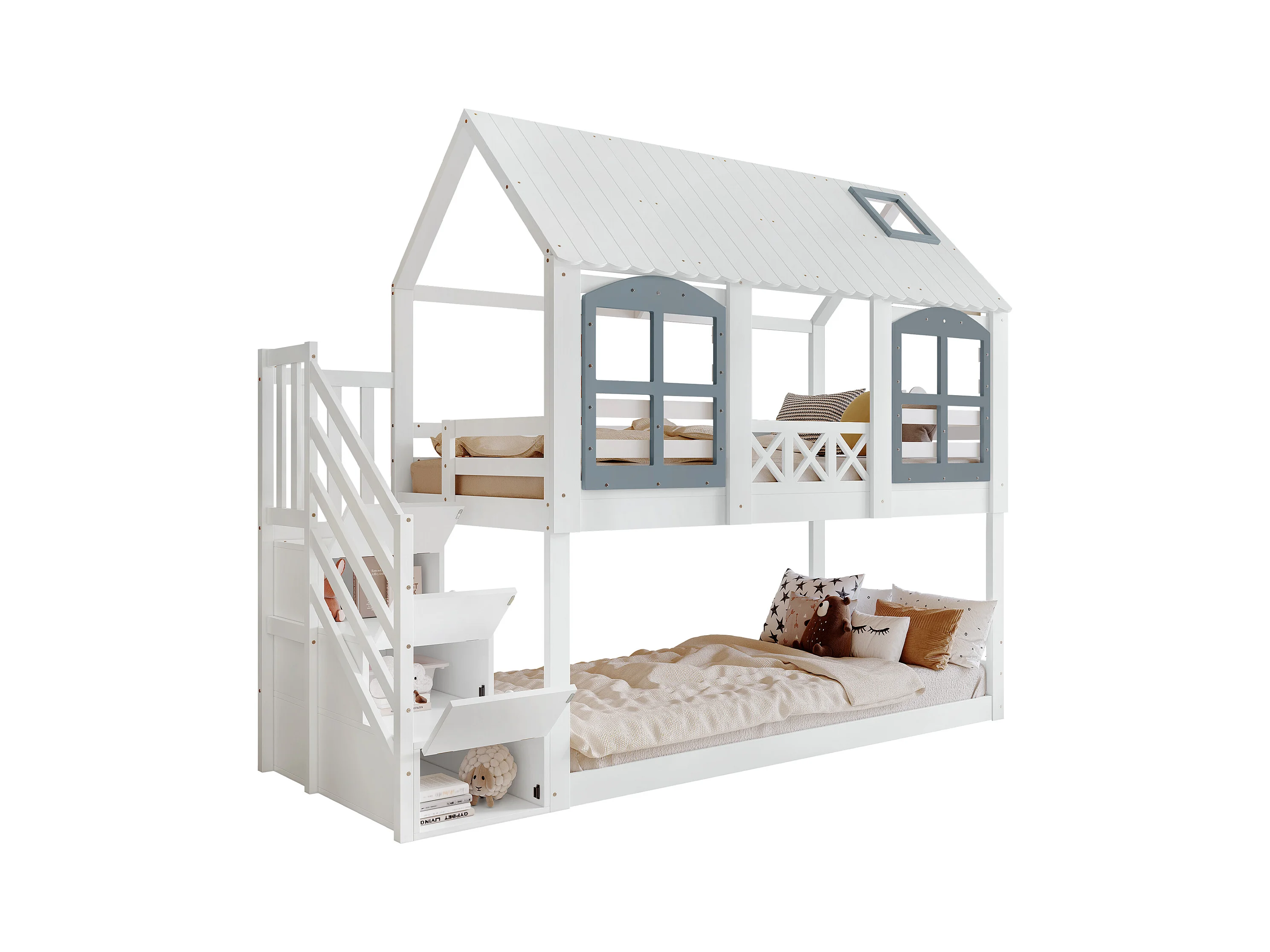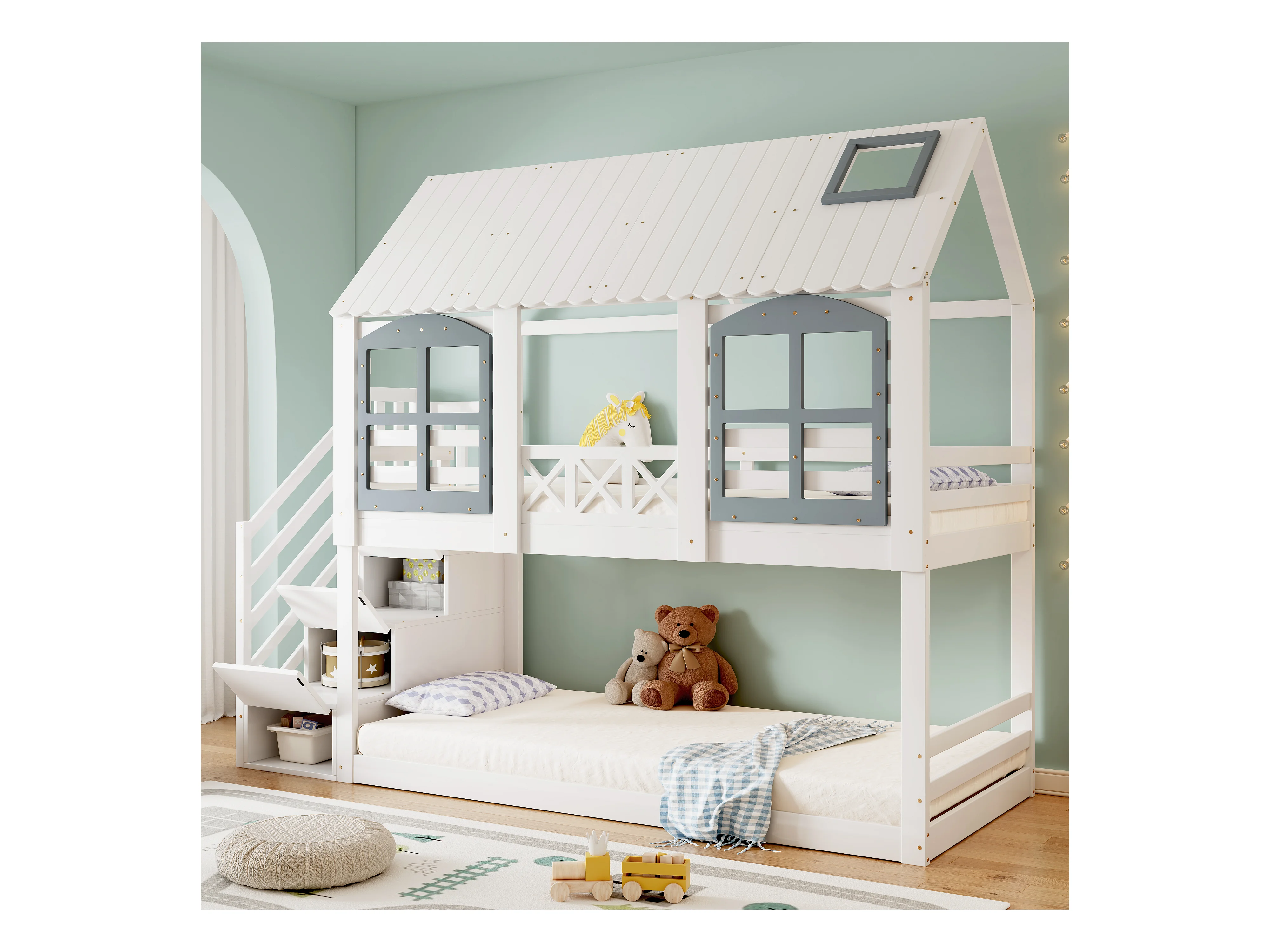 Lit superposé pour enfants avec rangement, toit et fenêtres, bois massif et MDF, blanc et naturel, 90x200 cm