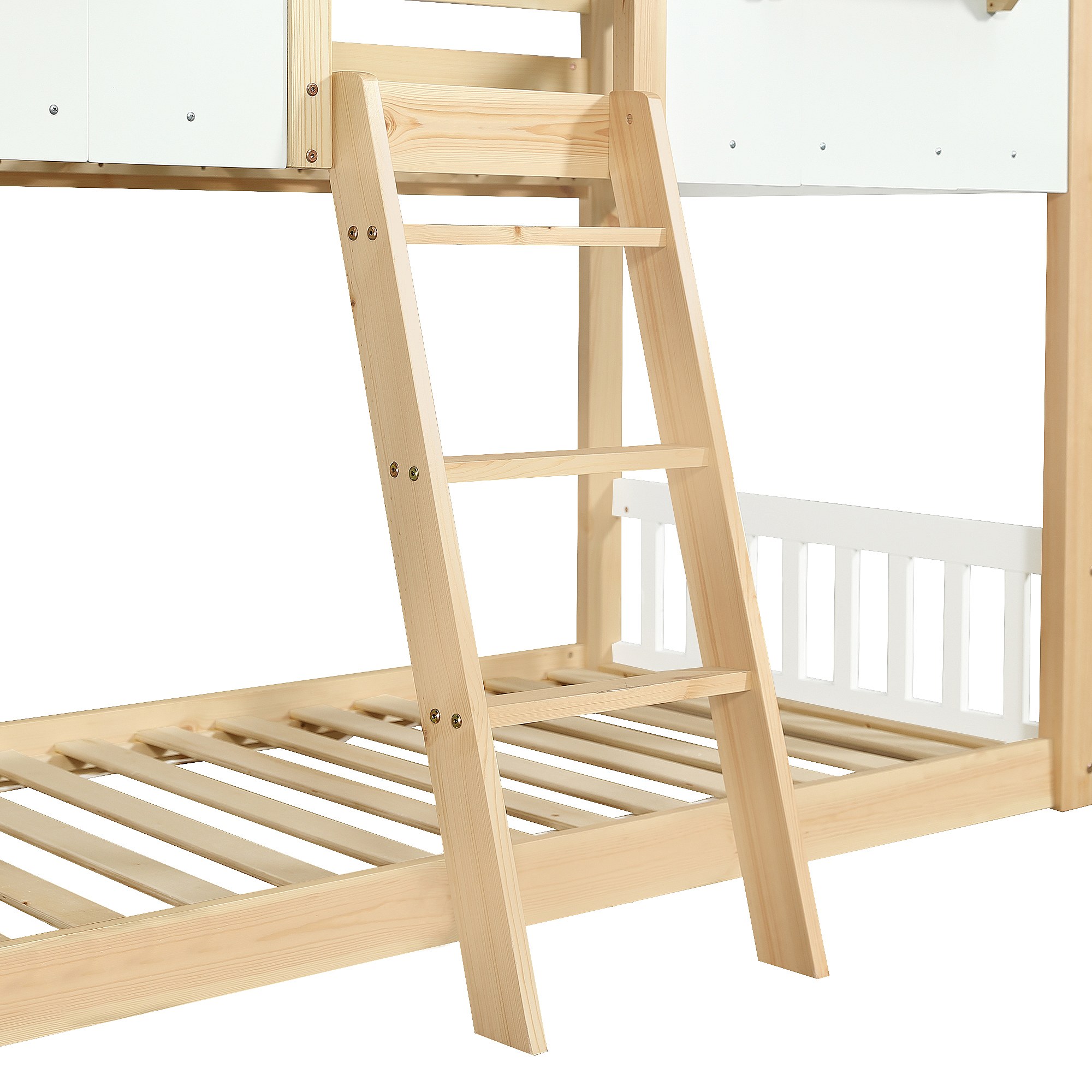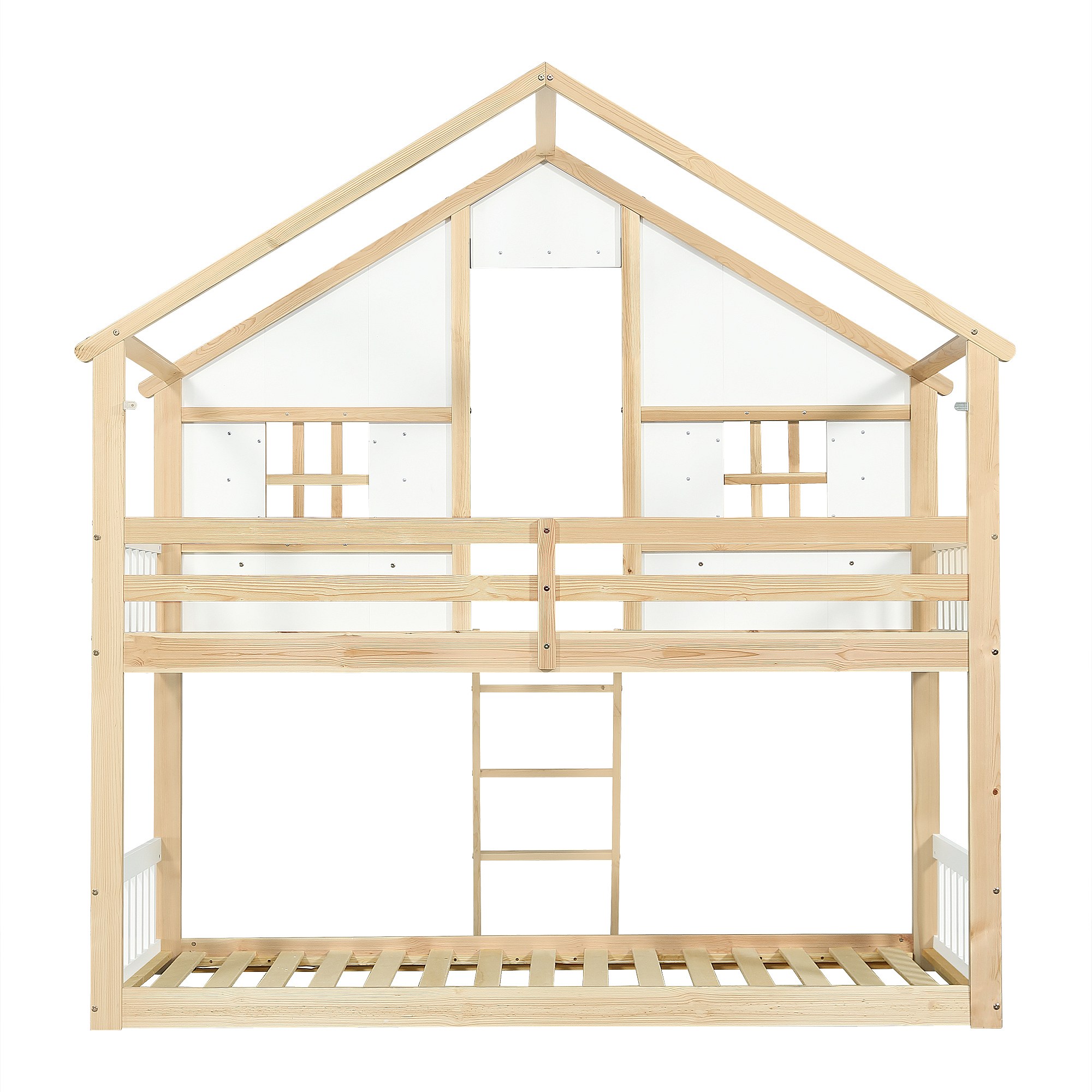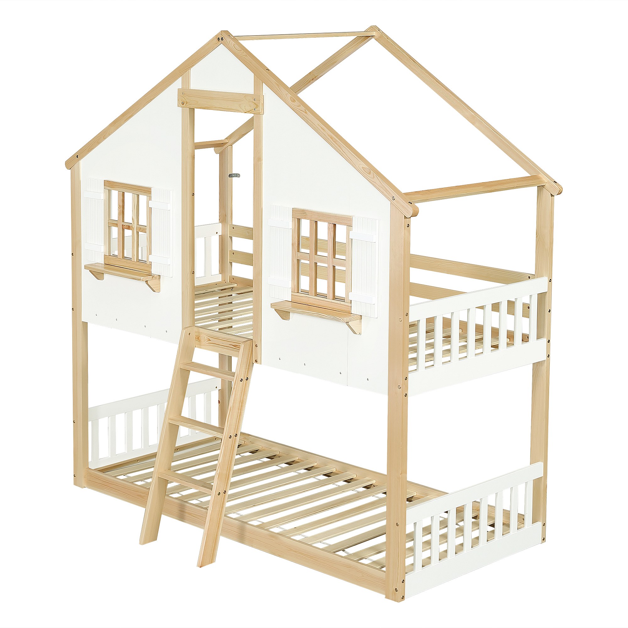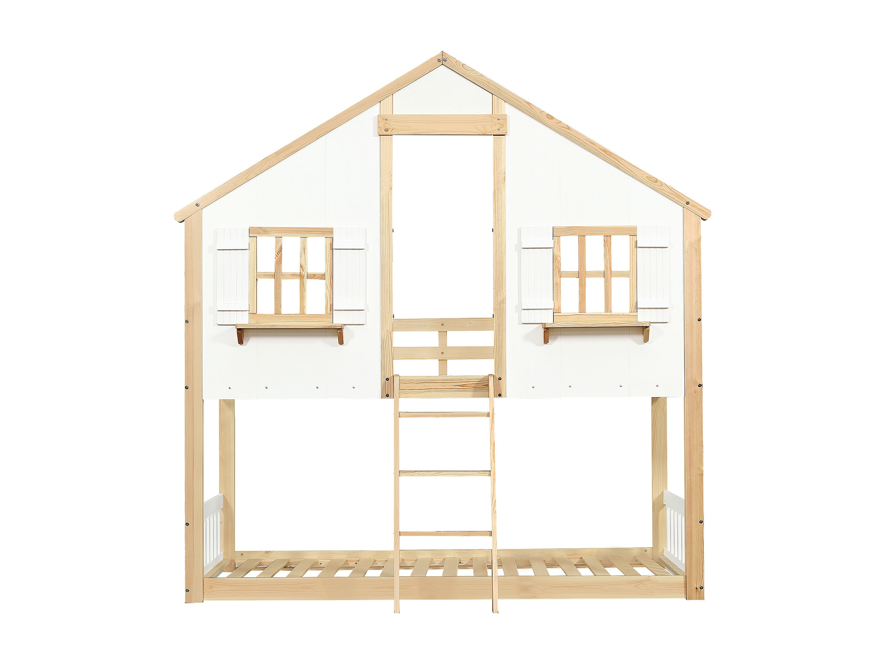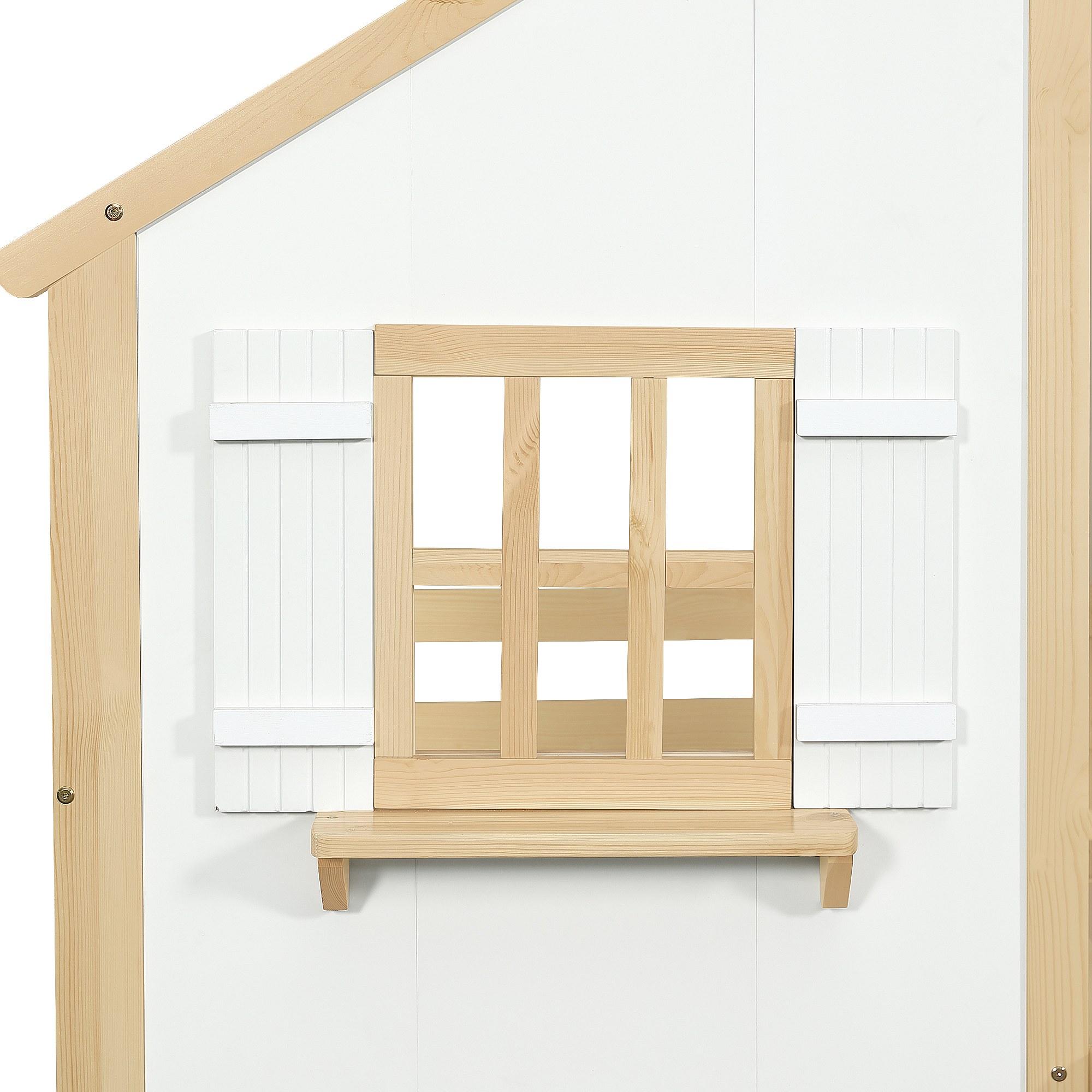 Lit superposé cabane enfant 90x200 cm avec barrière de sécurité et échelle, design fenêtre, couleur blanc et naturel, sans matelas