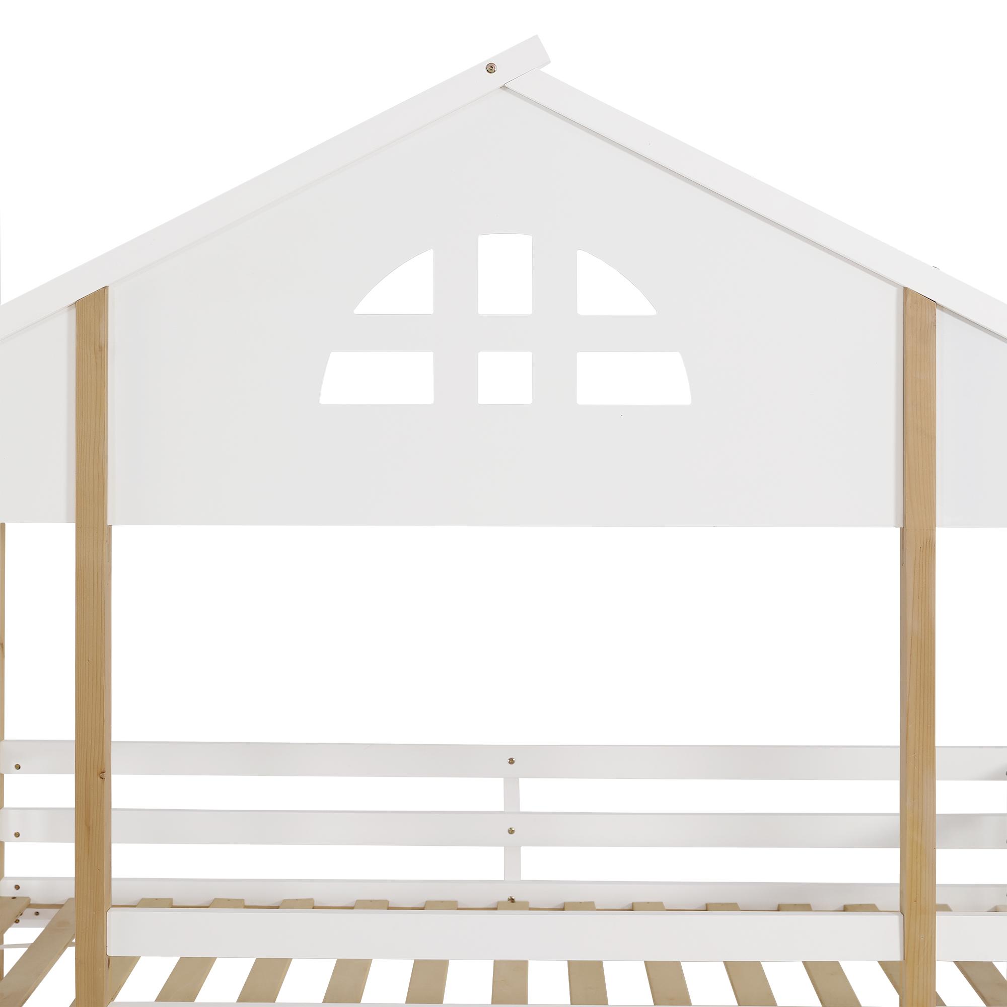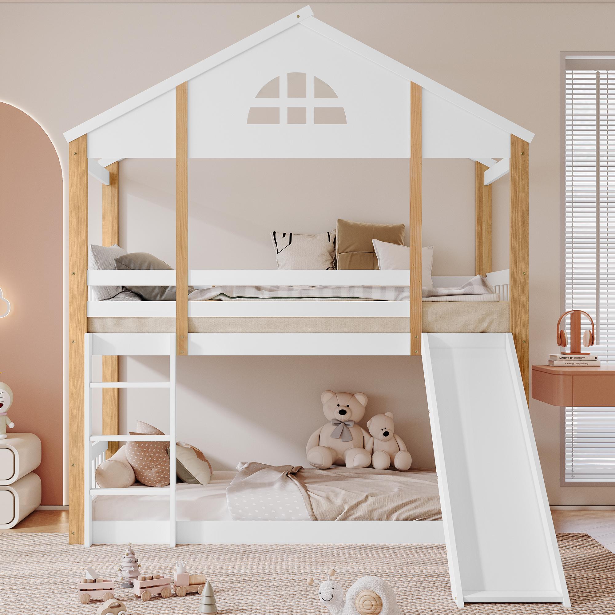 Lit superposé cabane enfant 90x200cm avec toboggan, barrière et escalier, blanc et bois, sans matelas