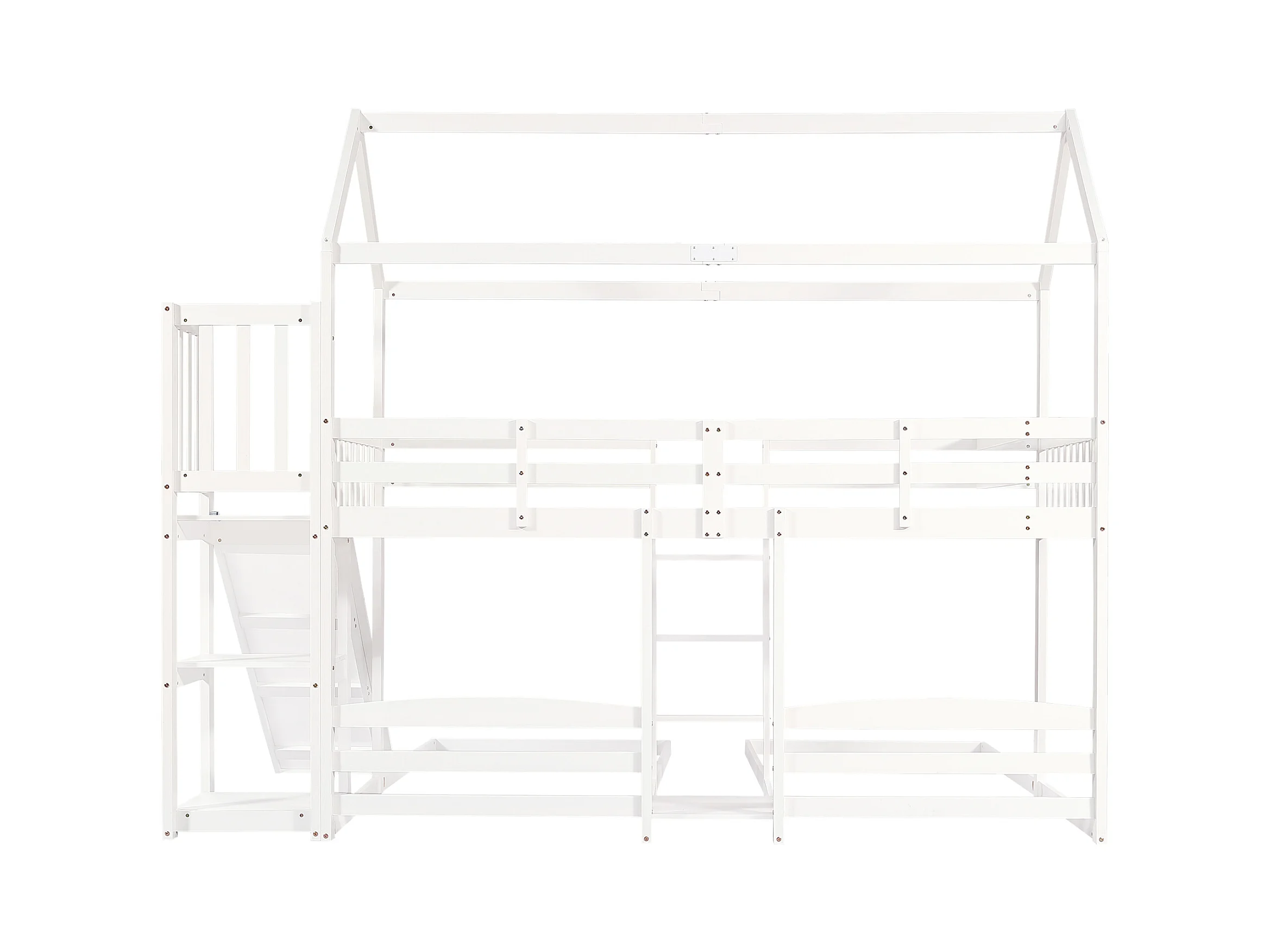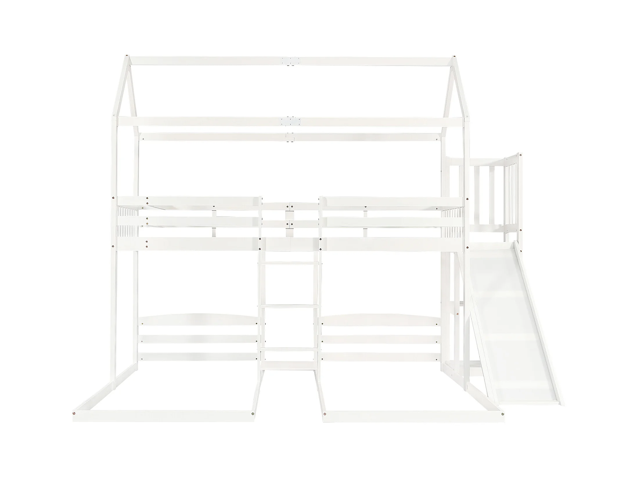 Lit superposé 90x200cm pour 3 enfants - toboggan avec étagères ouvertes - en bois de pin et MDF - Blanc