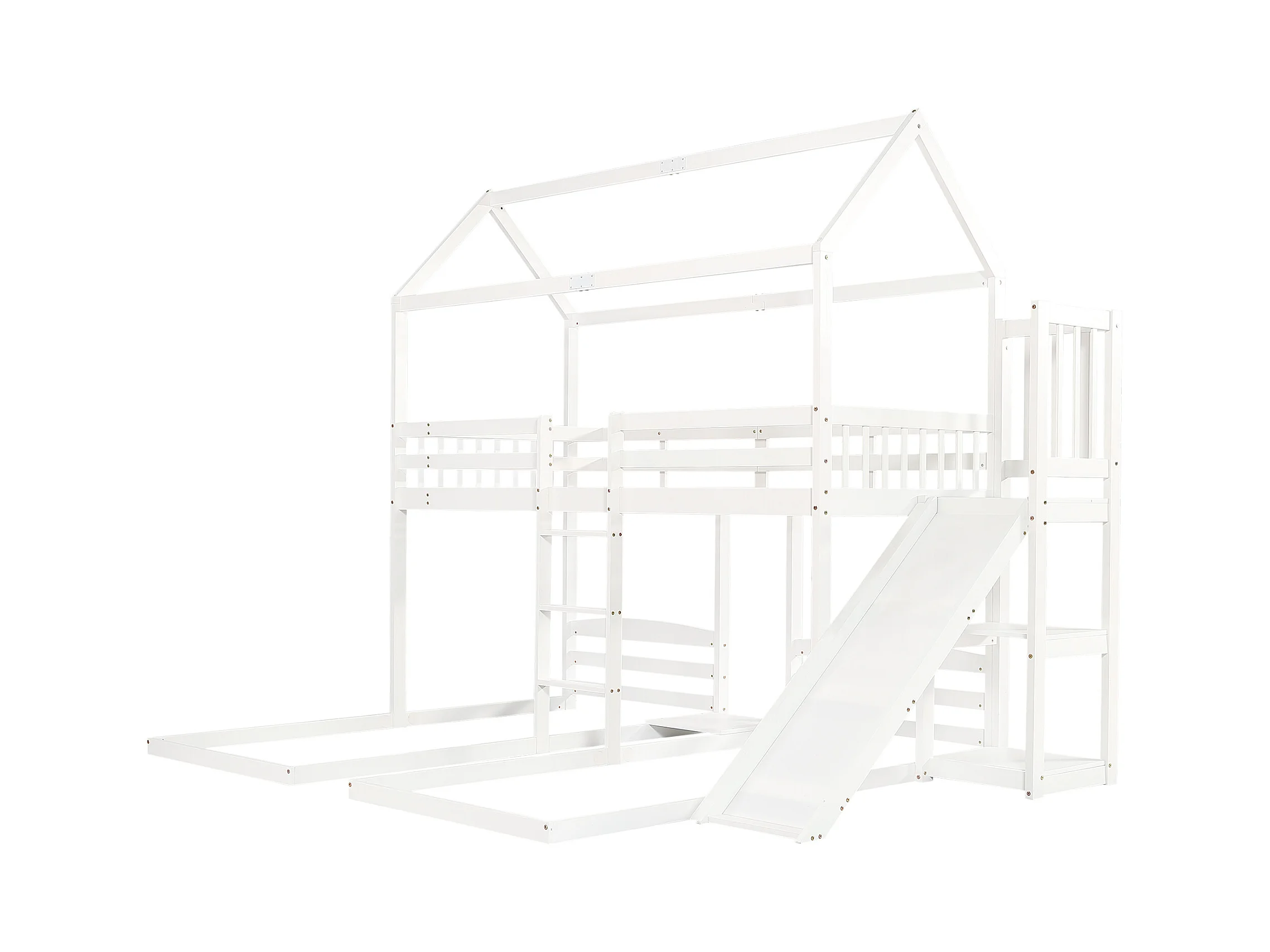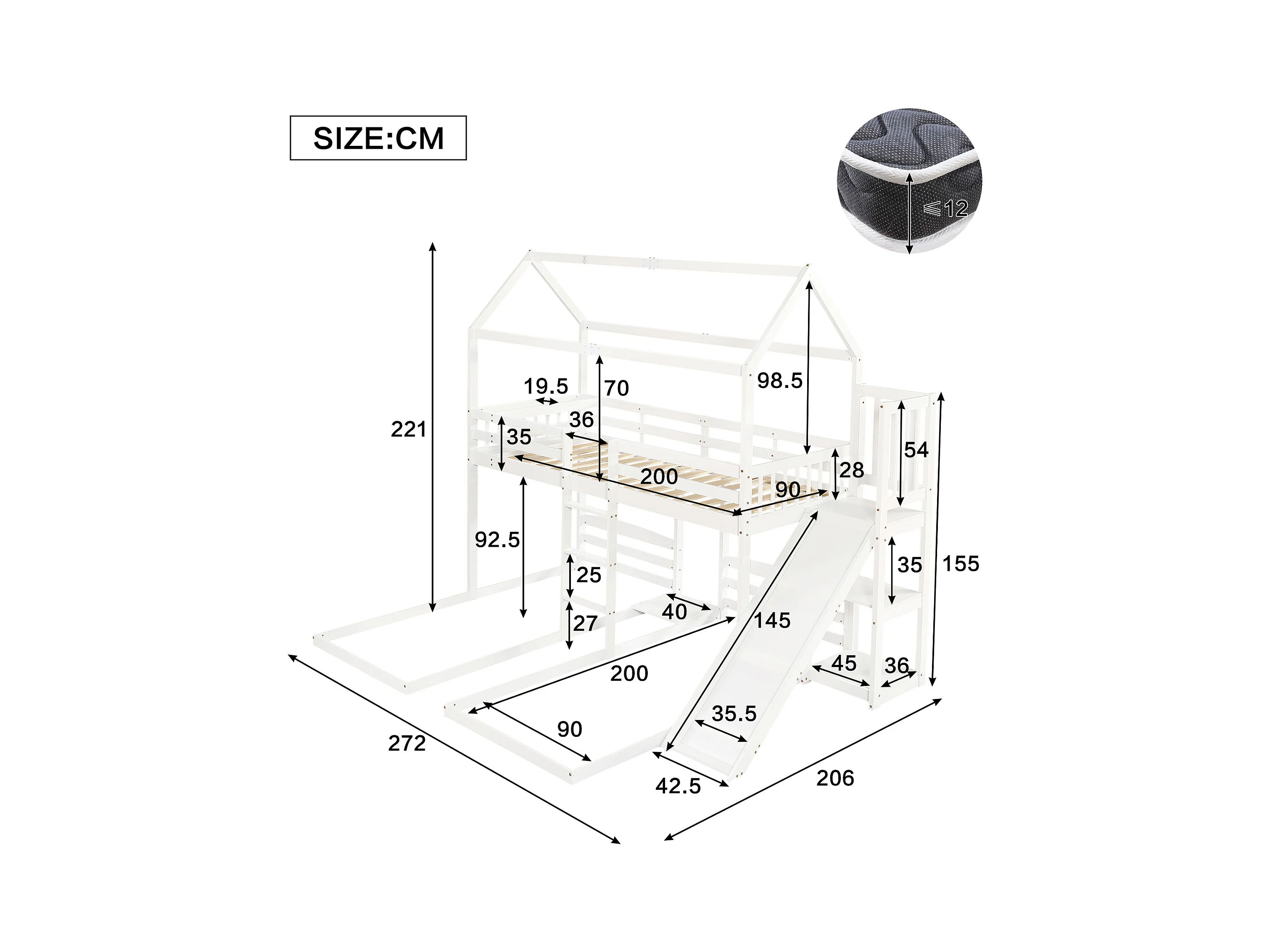 Lit superposé cabane enfant 90x200cm avec toboggan et rangement, sans matelas