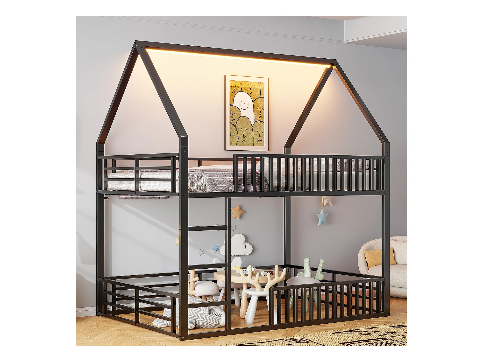 Lit superposé enfant 140 x 200 cm - design en forme de maison - avec clôture et éclairage LED - Noir (sans matelas)
