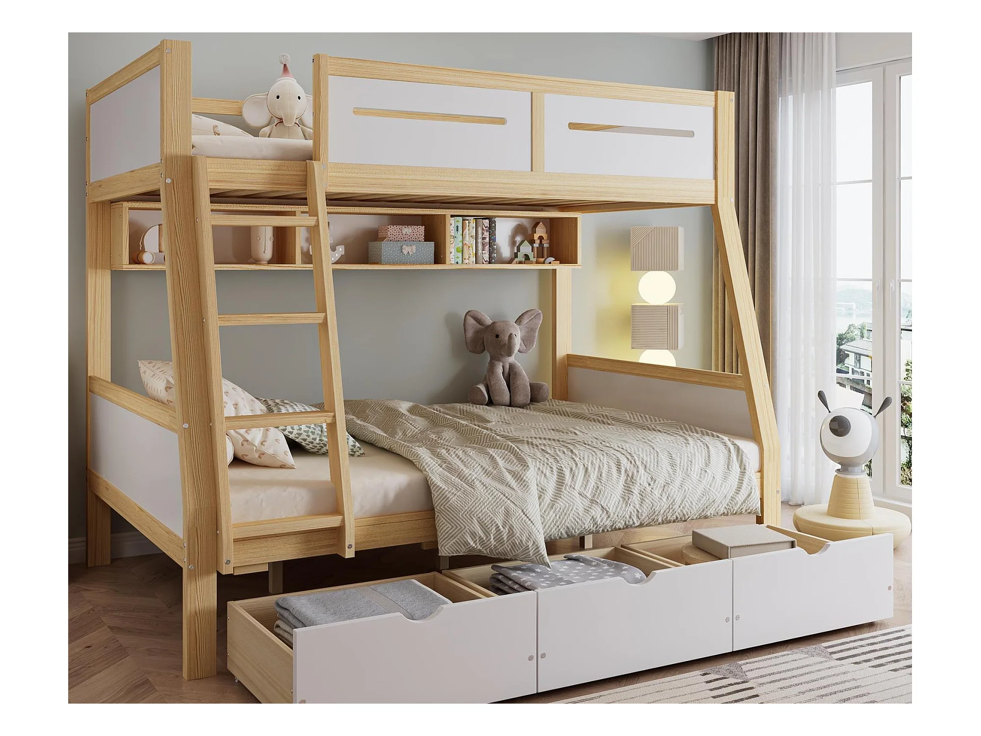 Lit superposé en bois 90x200cm + 120x200cm - avec échelle et 3 tiroirs - Blanc + Naturel (sans matelas)