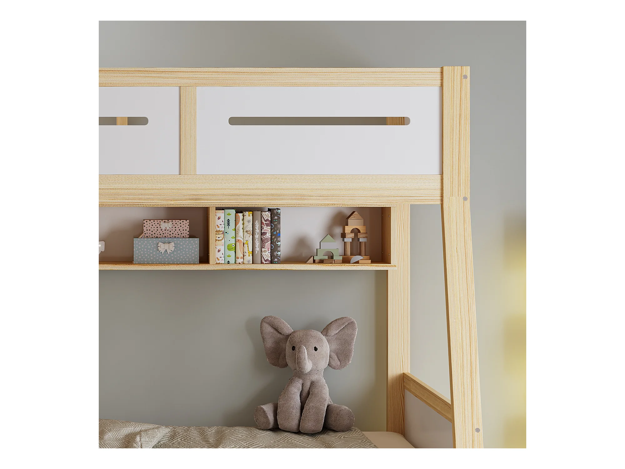Lit superposé 90x200cm + 120x200cm - avec 2 tiroirs - avec étagères ouvertes - échelle inclinée à 4 marches - Bois massif + MDF - Blanc + Naturel