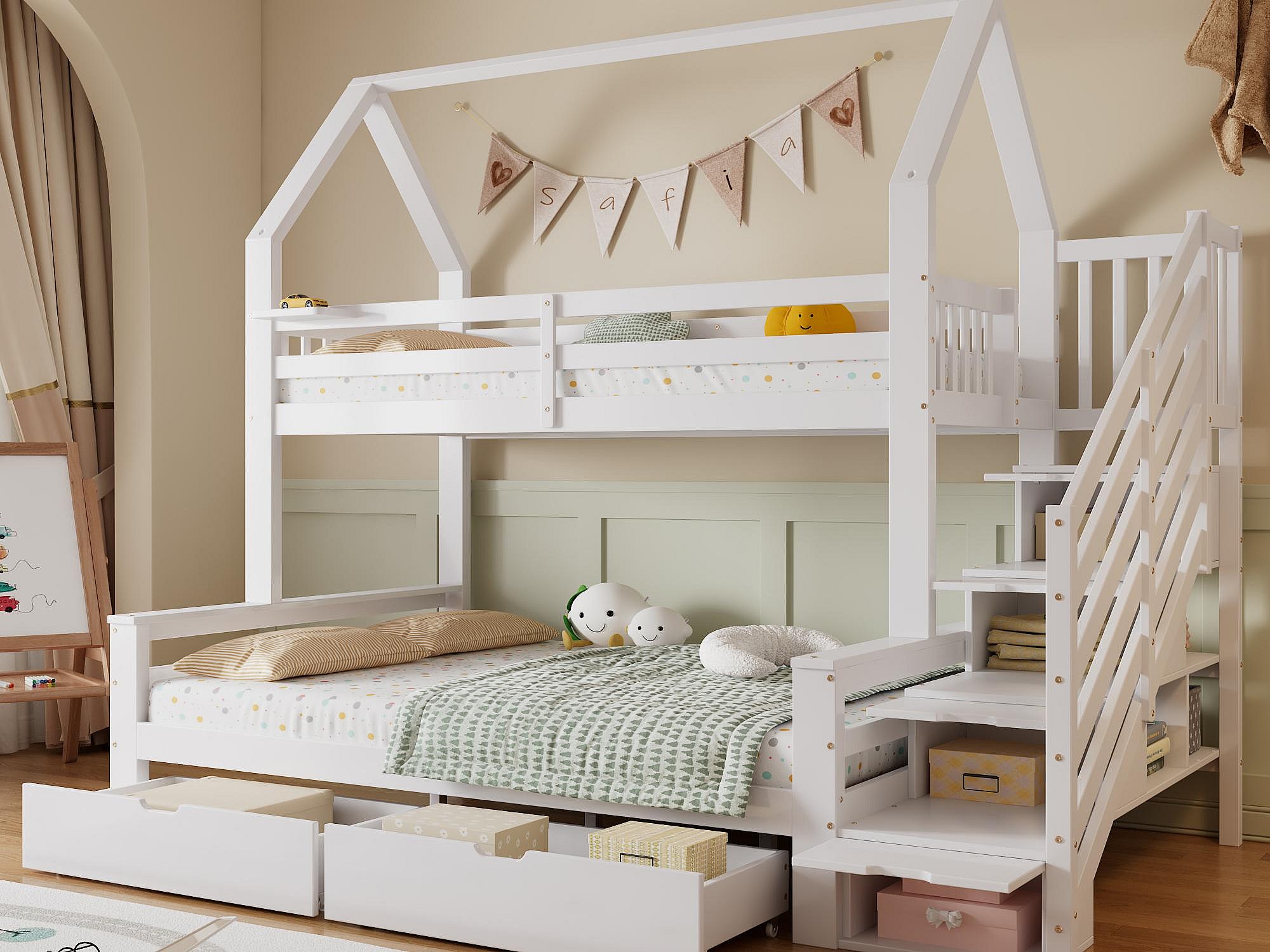 Un escalier avec rampes permet d'accéder facilement au lit supérieur, et les armoires d'escalier permettent de gagner de la place en utilisant efficacement l'espace de stockage.